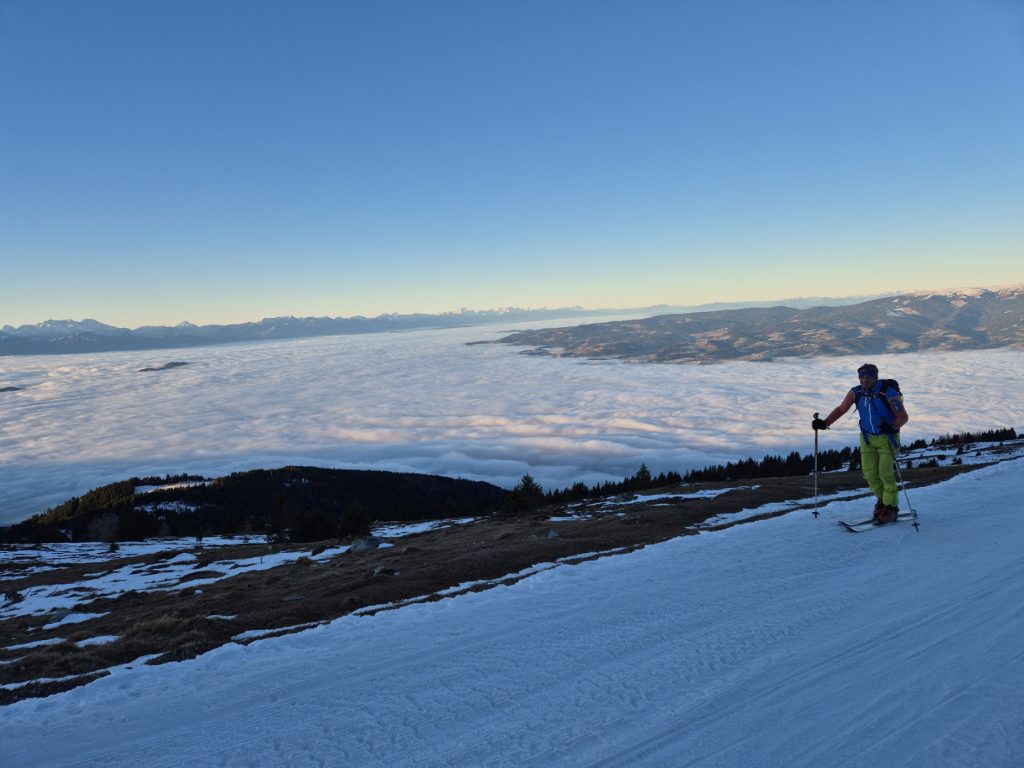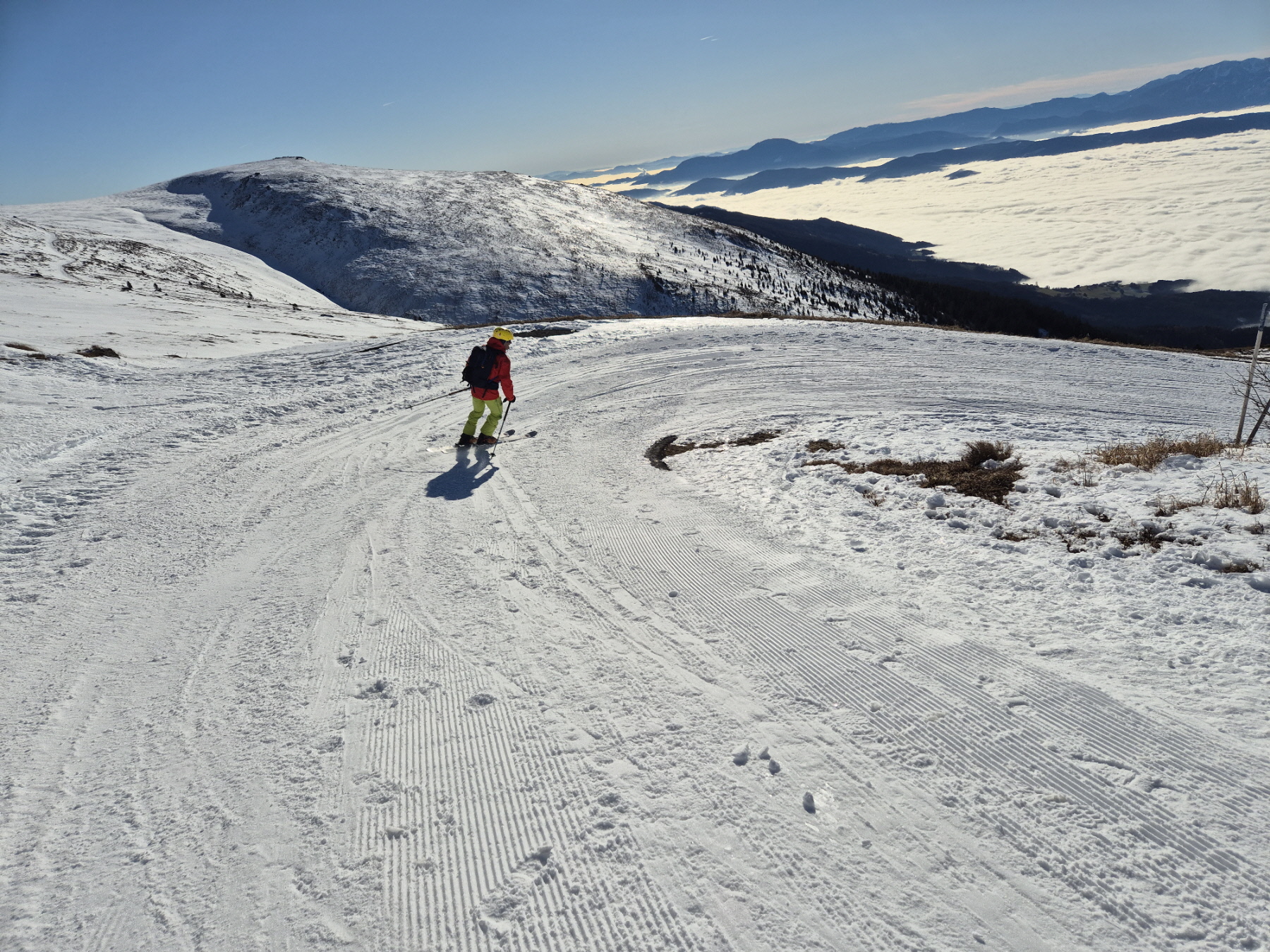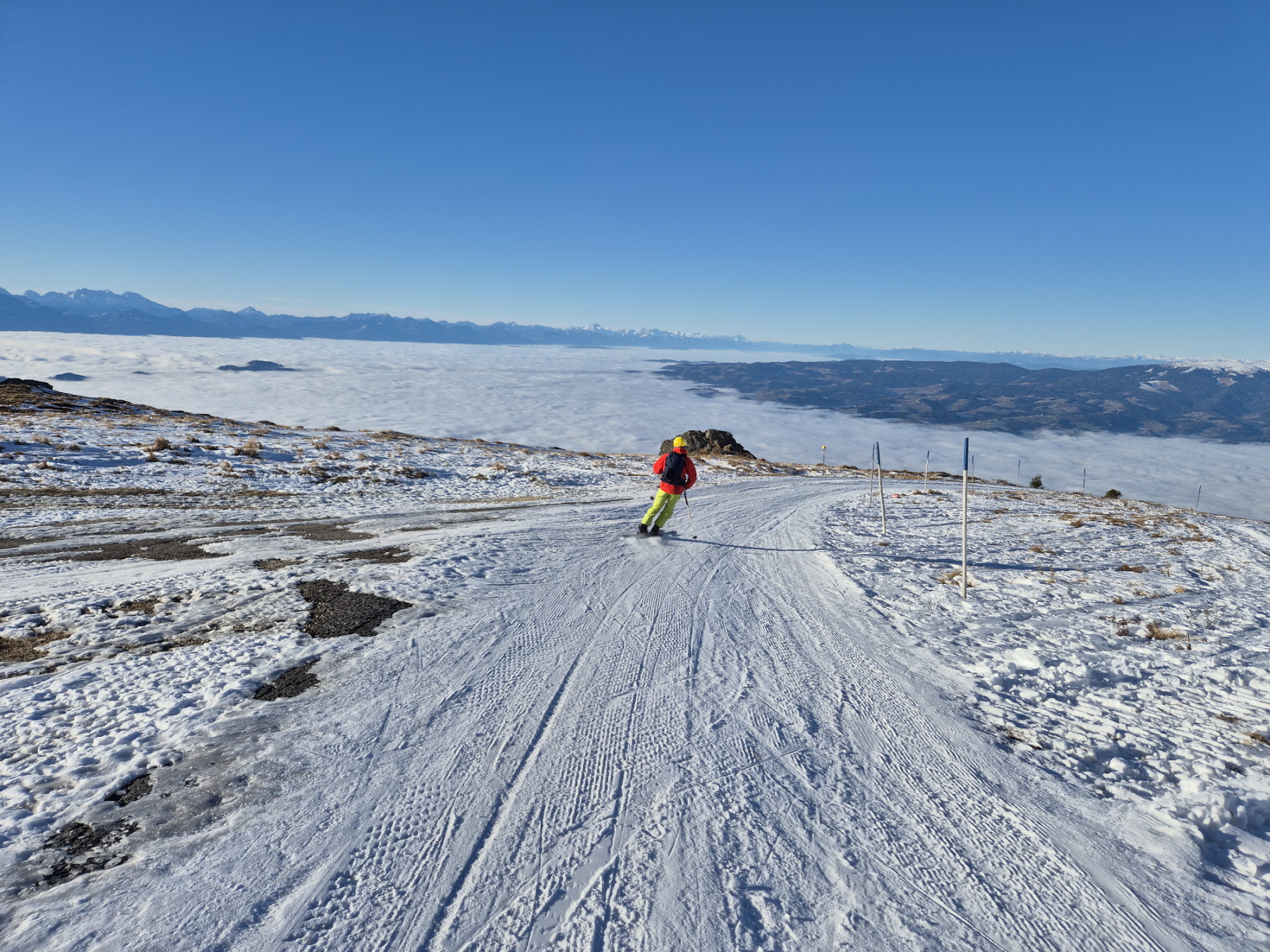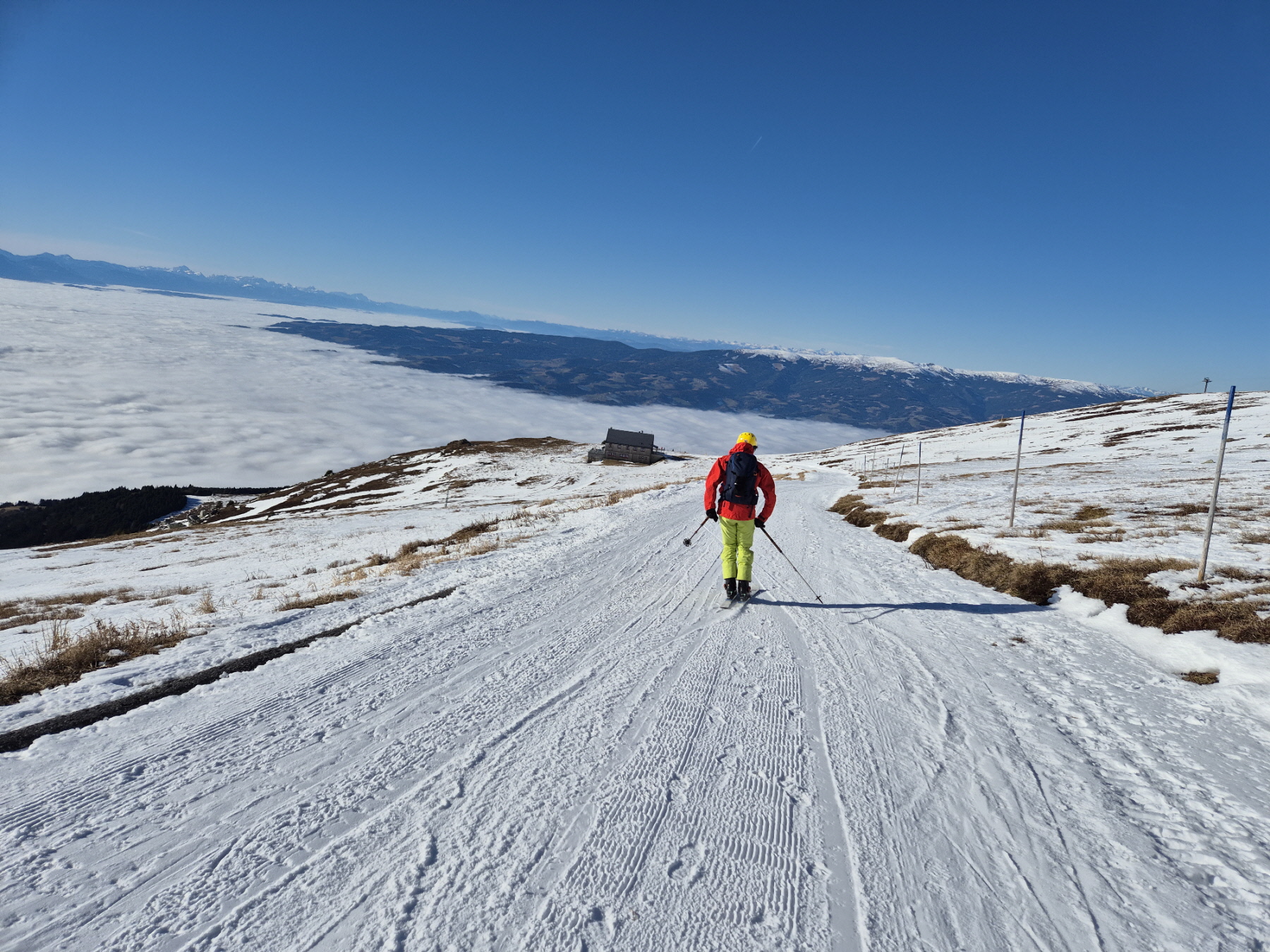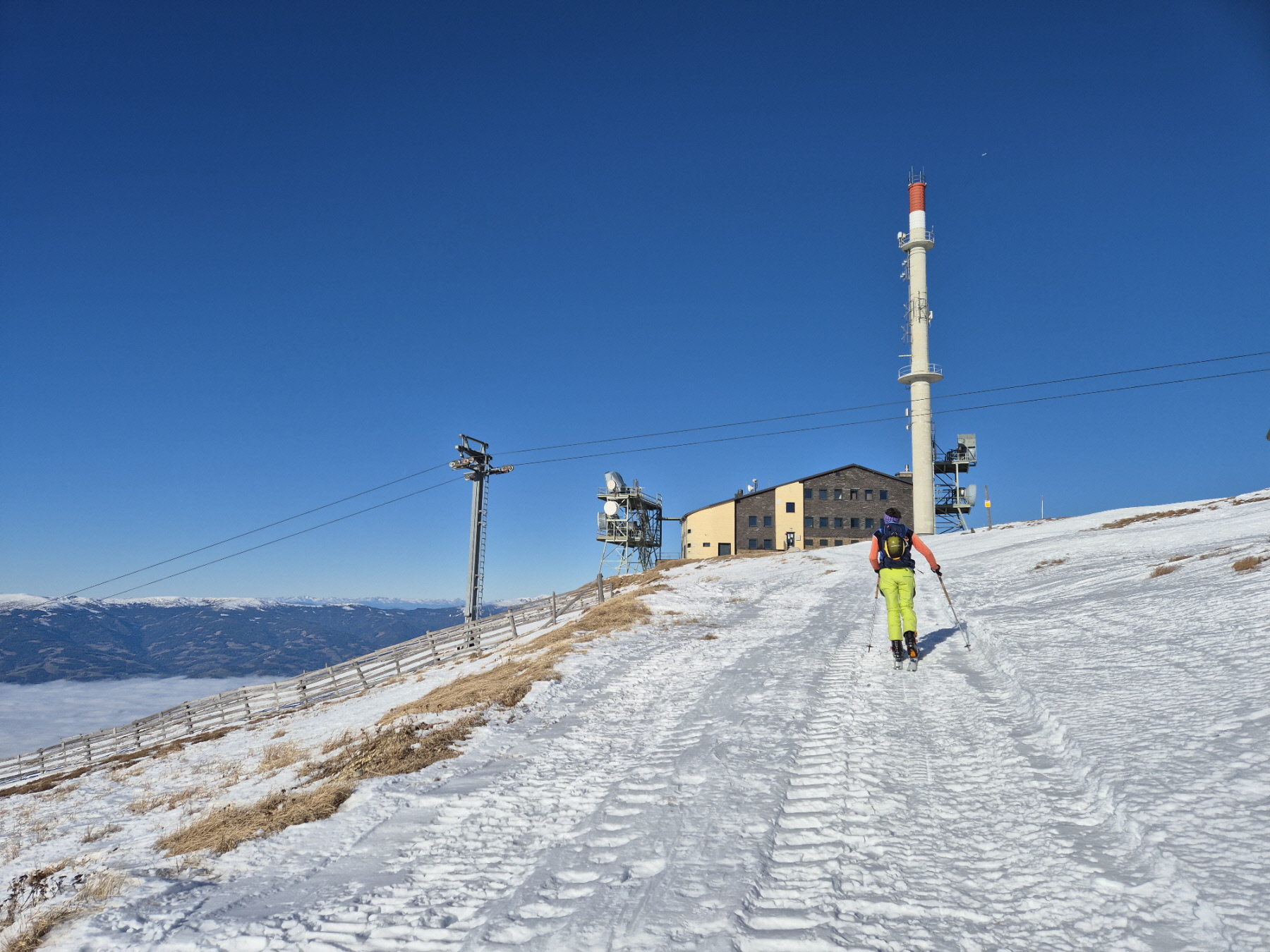 Nachdem wir diesen am Parkautomaten entrichtet hatten, sind wir neben der Schirmbar bei der Talstation des Raiffeisenlifts gestartet. Entgegen bisheriger Anstiege haben wir dem doch etwas steileren Hipfllift den Rücken zugehkehrt und sind viel gemütlicher am Pistenrand der Raiffeisenpiste aufgestiegen. Hoch über dem Nebelmeer zu beiden Seiten des Berges ging es hinauf in Richtung Wasserhang und weiter in Richtung Koralmschutzhaus. Auch die von den Bediensteten der Austro Control mit ihrem Raupenfahrzeug befahrene Piste war mit einer perfekten Schneeauflage versehen.