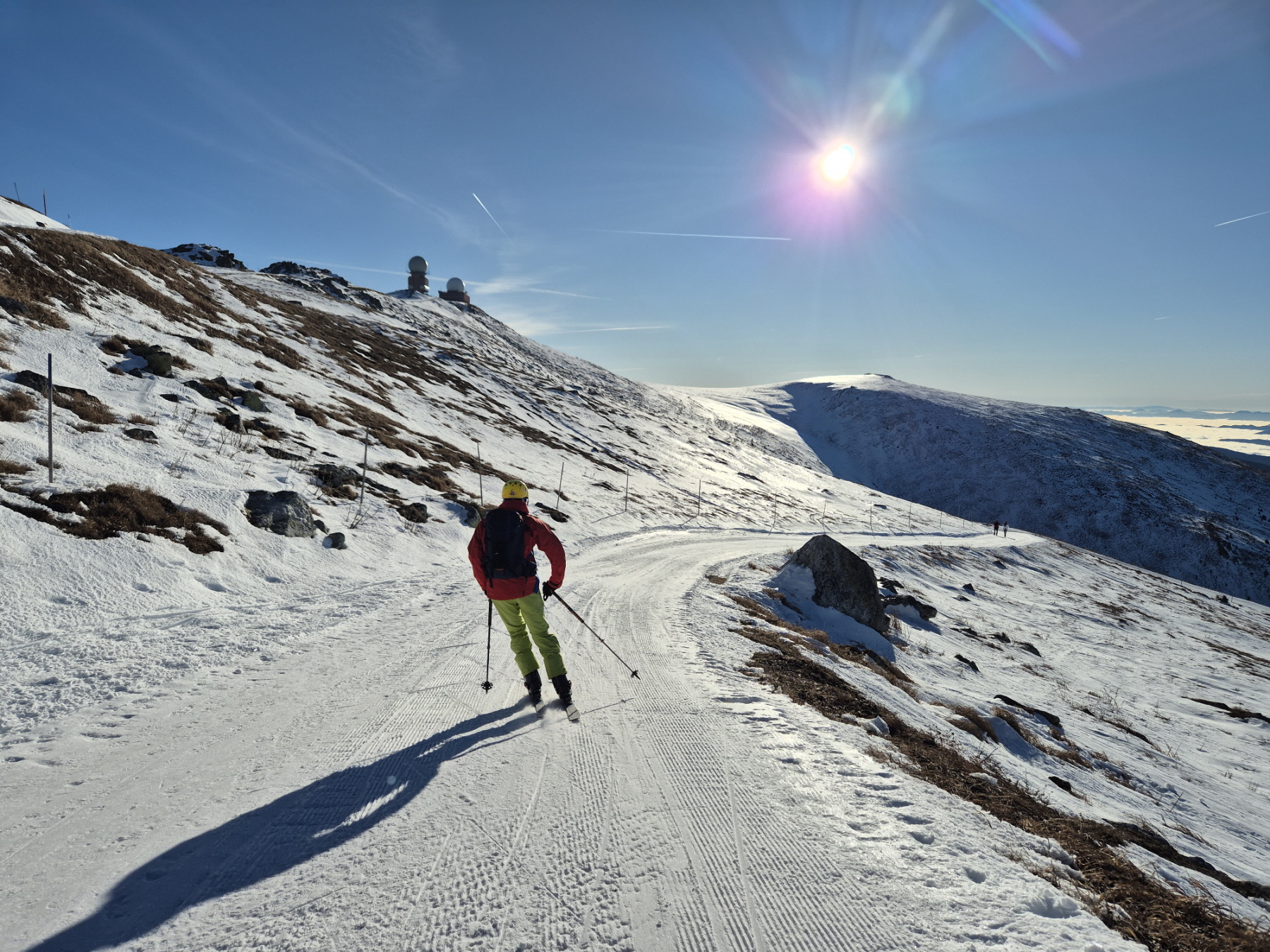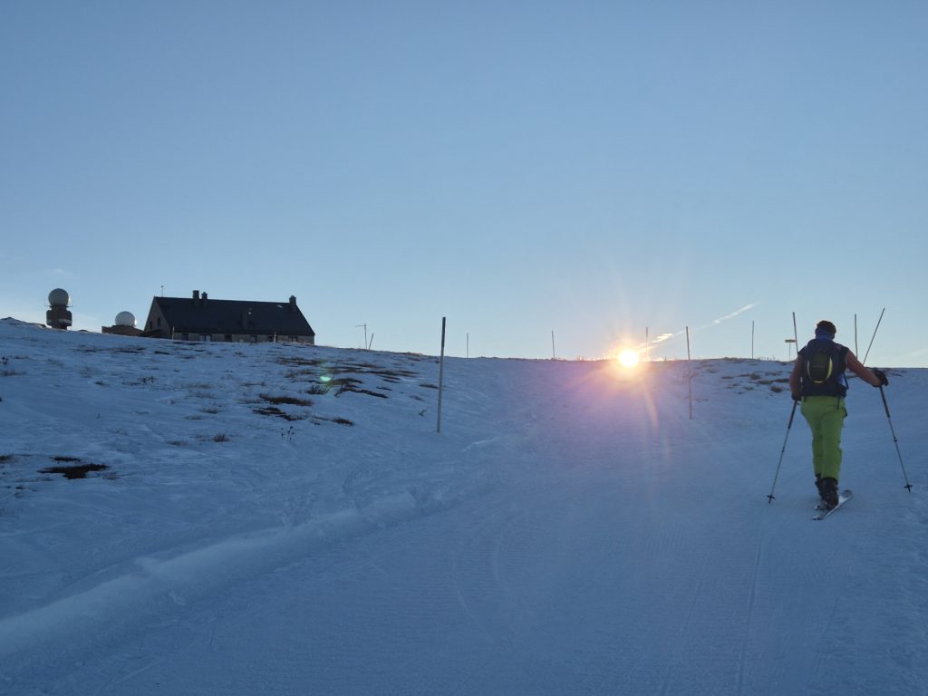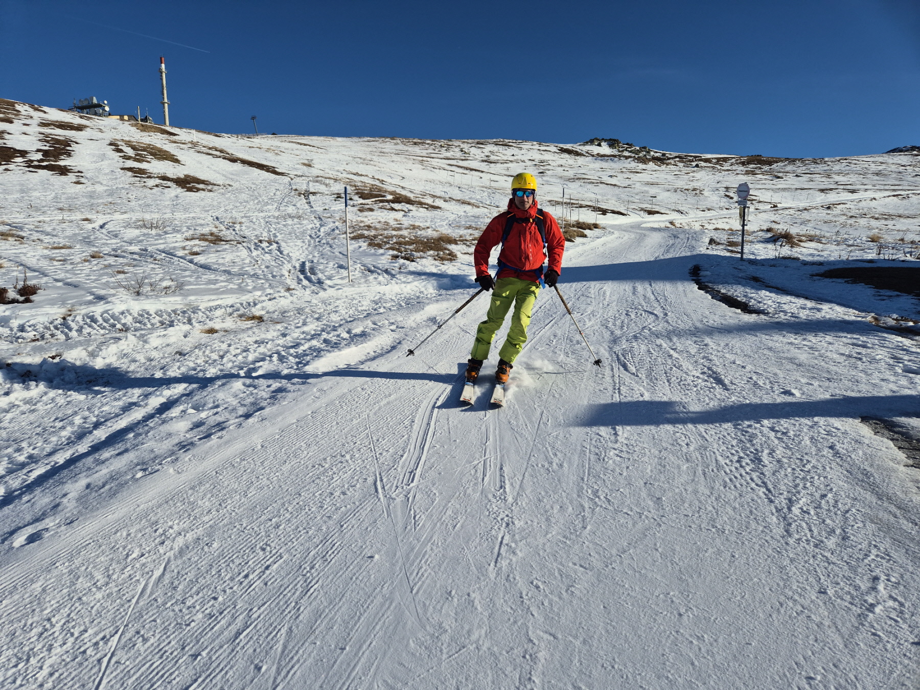 Durch bauliche Teile des Betriebsgebäudes etwas abgeschirmt konnten wir halbwegs windgeschützt für die zweite Abfahrt umrüsten. Lange haben wir uns jetzt nicht aufgehalten und sind nach dem Umrüsten für die zweite Abfahrt anfangs über etwas ruppigem Untergrund und ab der Wegkehre genussvoll entlang des präparierten Weges abgefahren.