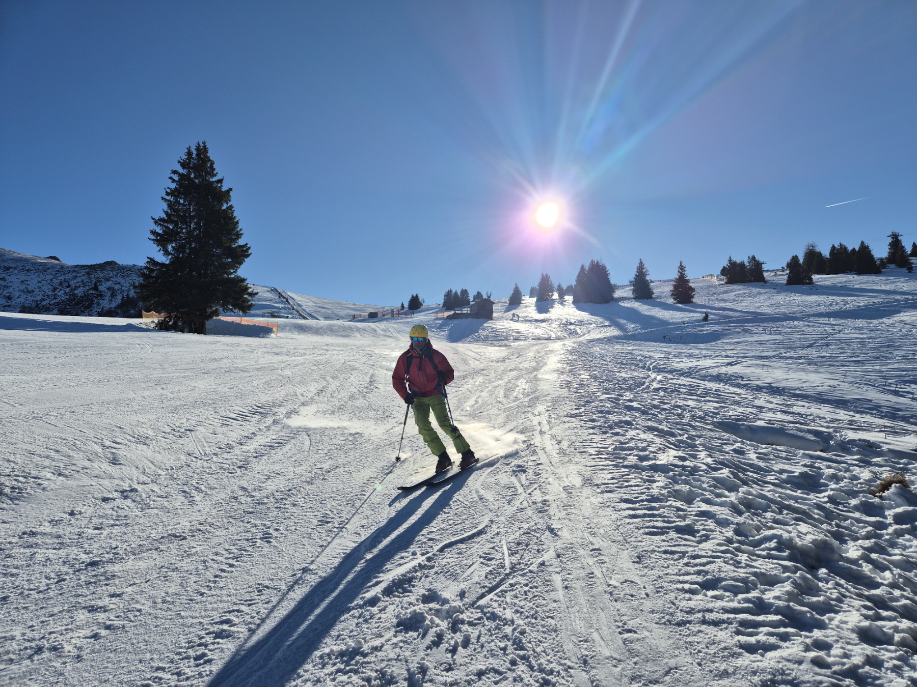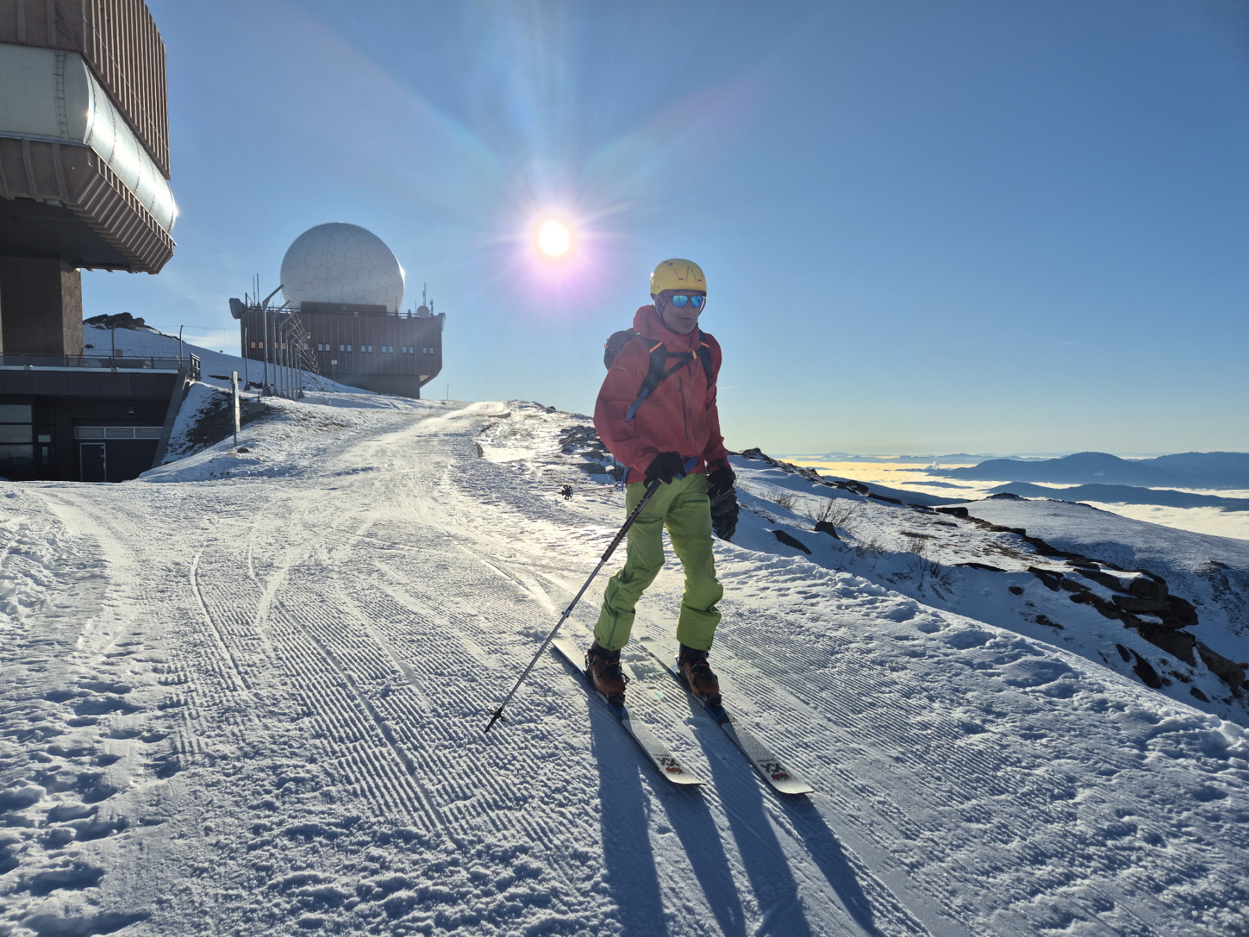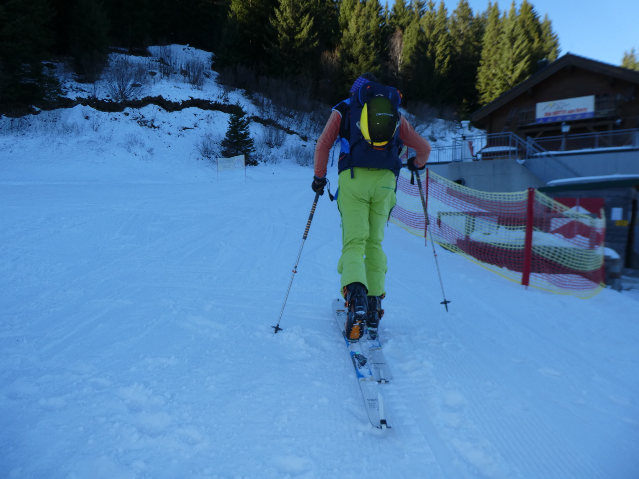 Durch bauliche Teile des Betriebsgebäudes etwas abgeschirmt konnten wir halbwegs windgeschützt für die zweite Abfahrt umrüsten. Lange haben wir uns jetzt nicht aufgehalten und sind nach dem Umrüsten für die zweite Abfahrt anfangs über etwas ruppigem Untergrund und ab der Wegkehre genussvoll entlang des präparierten Weges abgefahren.
