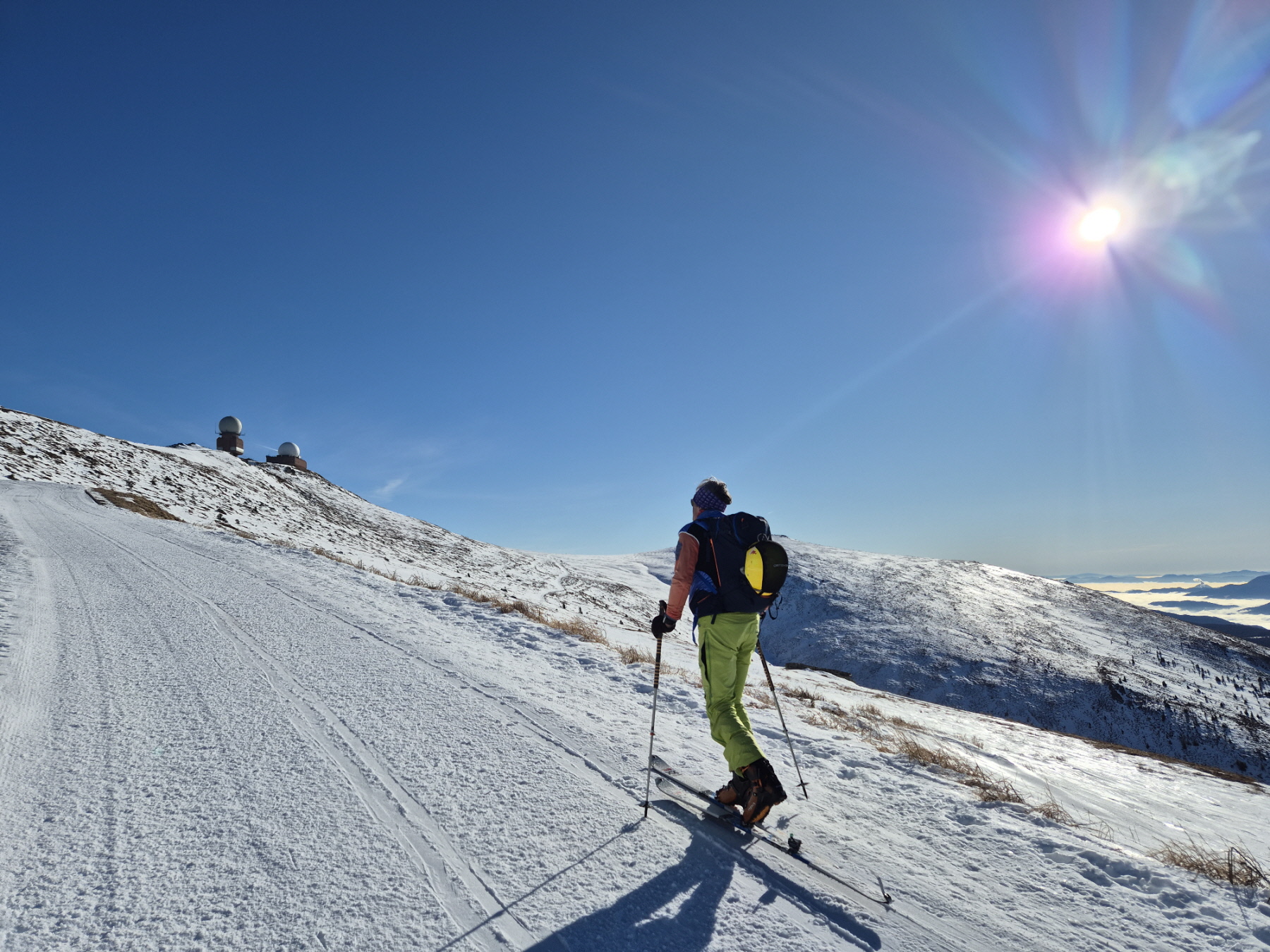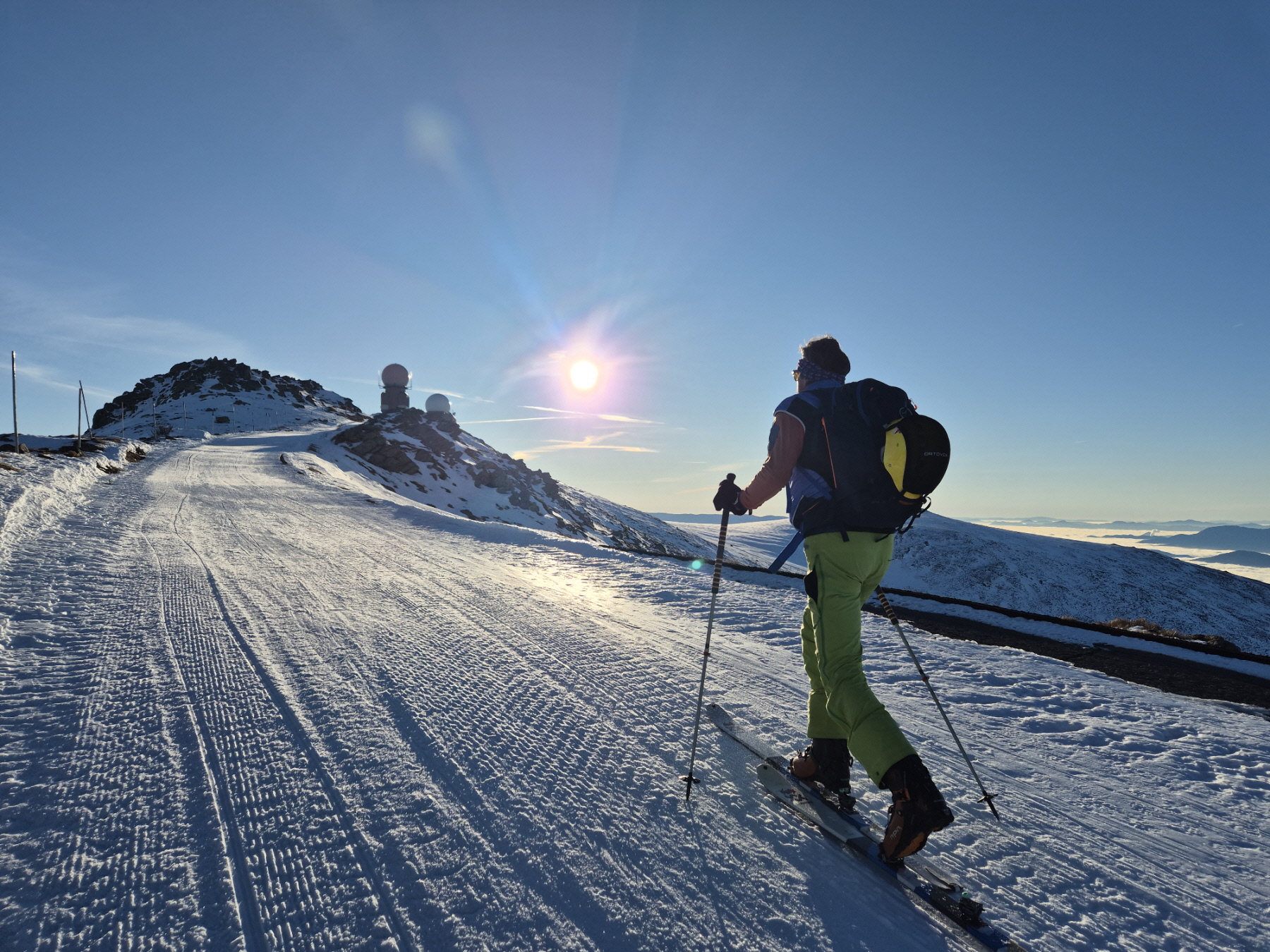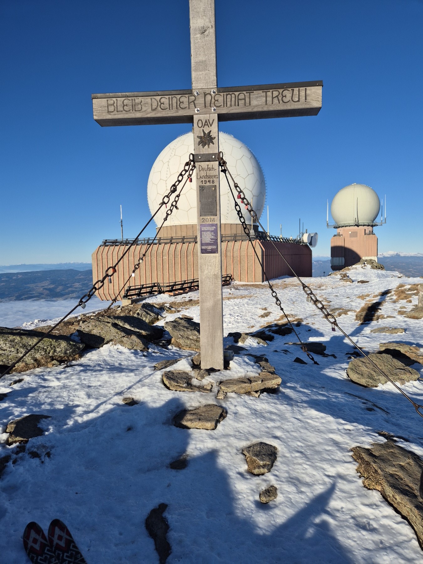 Dieser Piste sind wir, ab dem Schutzhaus zwar voll in der Sonne, aber bei aufkommendem Wind weiter gefolgt. Nach den Kehren auf Höhe Steinschneider hat der Wind noch einmal etwas zugelegt und es war ziemlich frisch. Nach sehr gemütlichem Aufstieg haben wir schließlich das Gipfelkreuz am Gr. Speikkogel in einer Zeit von 1 Std 25 min erreicht. Direkt neben dem Kreuz haben wir abgeschnallt und sind die wenigen Meter zum Winterraum der Austro Control hinuntergestapft.
