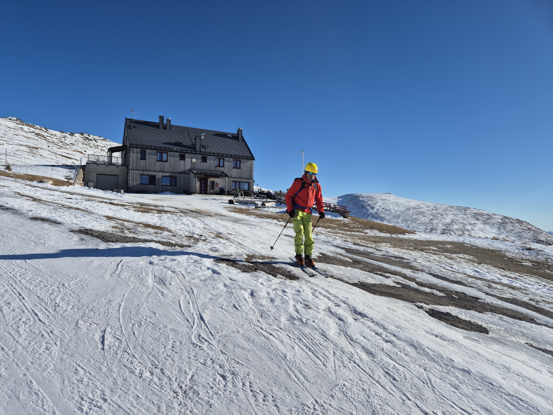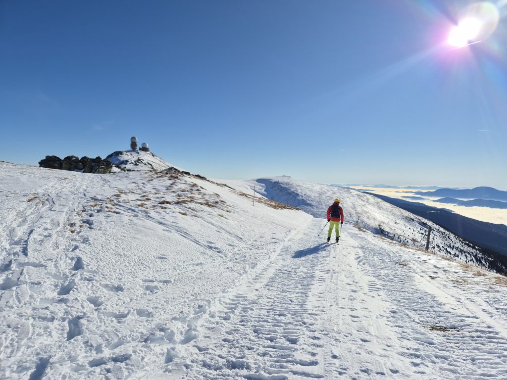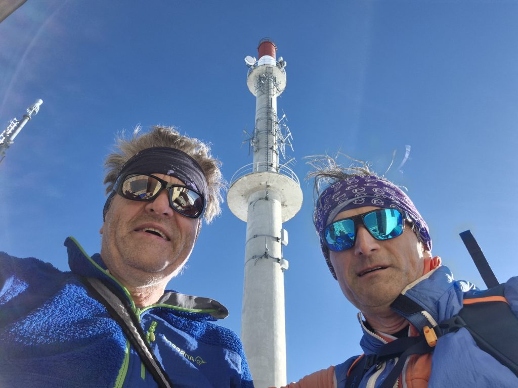 Dieser Piste sind wir, ab dem Schutzhaus zwar voll in der Sonne, aber bei aufkommendem Wind weiter gefolgt. Nach den Kehren auf Höhe Steinschneider hat der Wind noch einmal etwas zugelegt und es war ziemlich frisch. Nach sehr gemütlichem Aufstieg haben wir schließlich das Gipfelkreuz am Gr. Speikkogel in einer Zeit von 1 Std 25 min erreicht. Direkt neben dem Kreuz haben wir abgeschnallt und sind die wenigen Meter zum Winterraum der Austro Control hinuntergestapft.