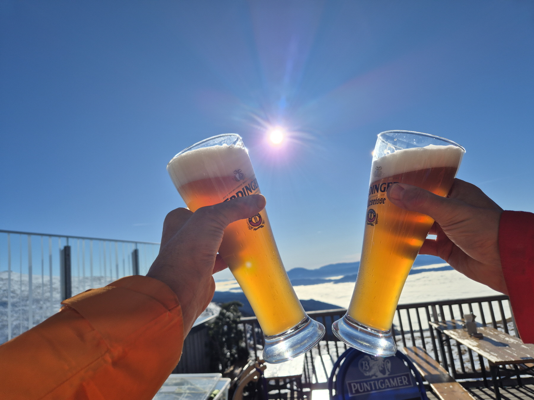 Vor dem Koralm Schutzhaus haben wir aber schon wieder abgeschnallt. Dort, wo ich vor 55 Jahren – natürlich noch in der alten Hütte – während meines allerersten Schulskikurses einquartiert war, sind wir jetzt eingekehrt. Die herrliche Sonnenterrasse hat während unserer vorangegangenen Anstiege so einladend auf uns gewirkt, dass wir daran jetzt nicht vorbeifahren konnten.