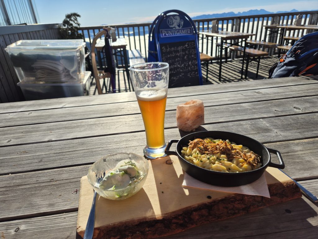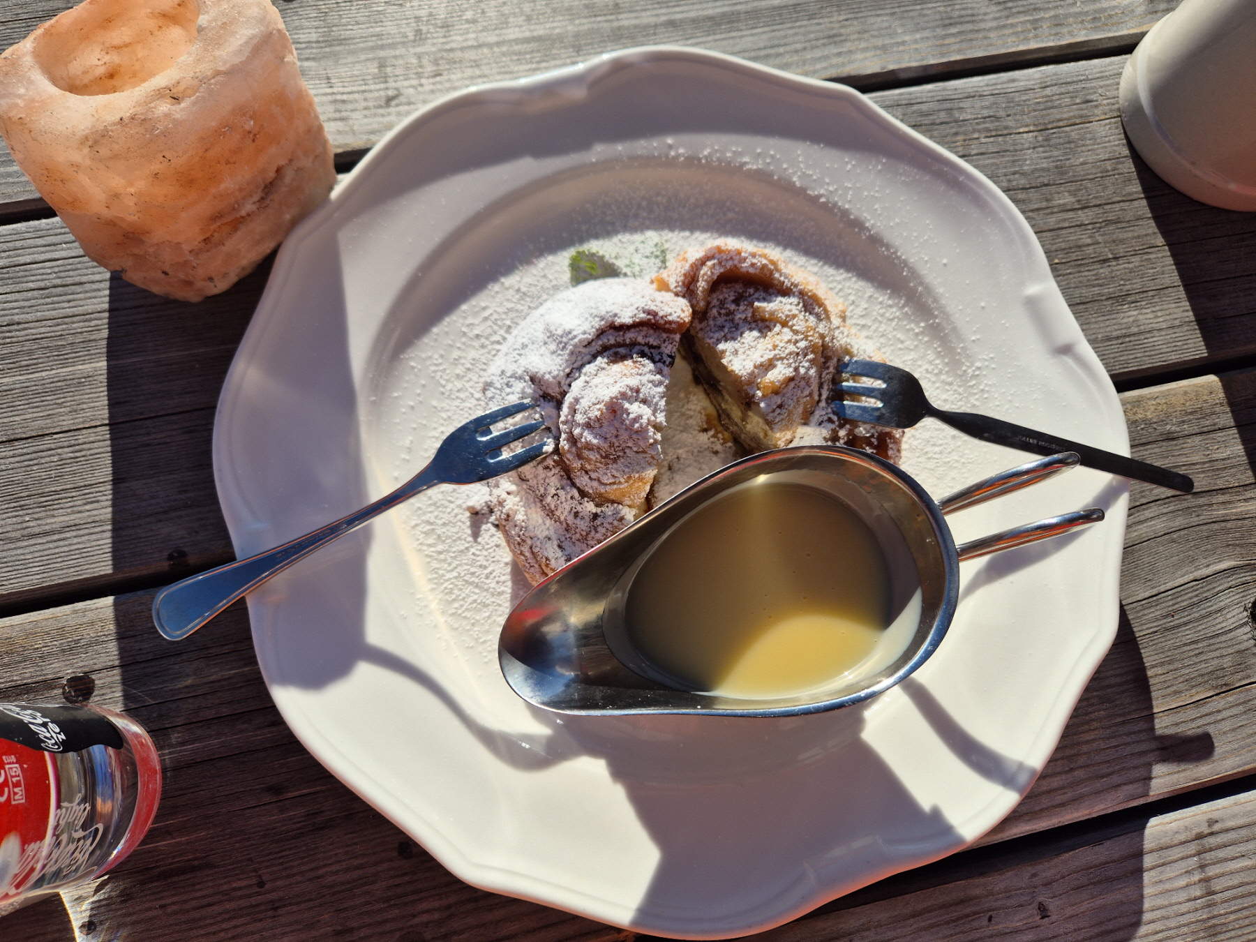 Obwohl es auch zur Mittagszeit immer noch ziemlich frisch war, haben wir uns draußen in der Sonne hingesetzt. Und weil die aus Tirol stammenden neuen Pächter sehr schmackhaftes Essen anbieten, darf sich der Heinrich heute schon vor dem Ende der Abfahrt über seinen virtuellen Anteil freuen. Die von der freundlichen Wirtin servierten Käsespätzle haben genauso gut geschmeckt wie das Zuckerreinkerle mit Eierlikör zum Kaffee hinterher.