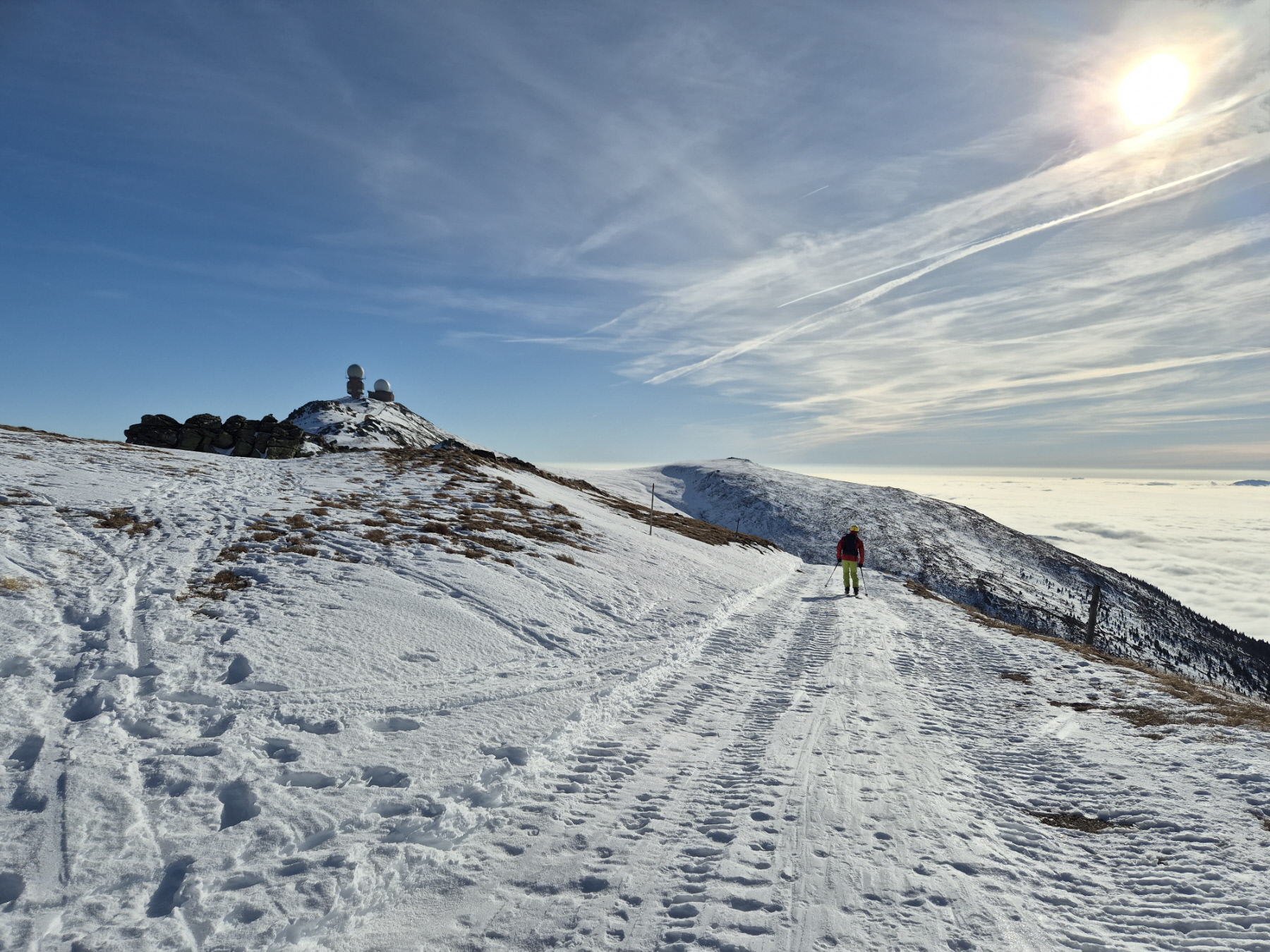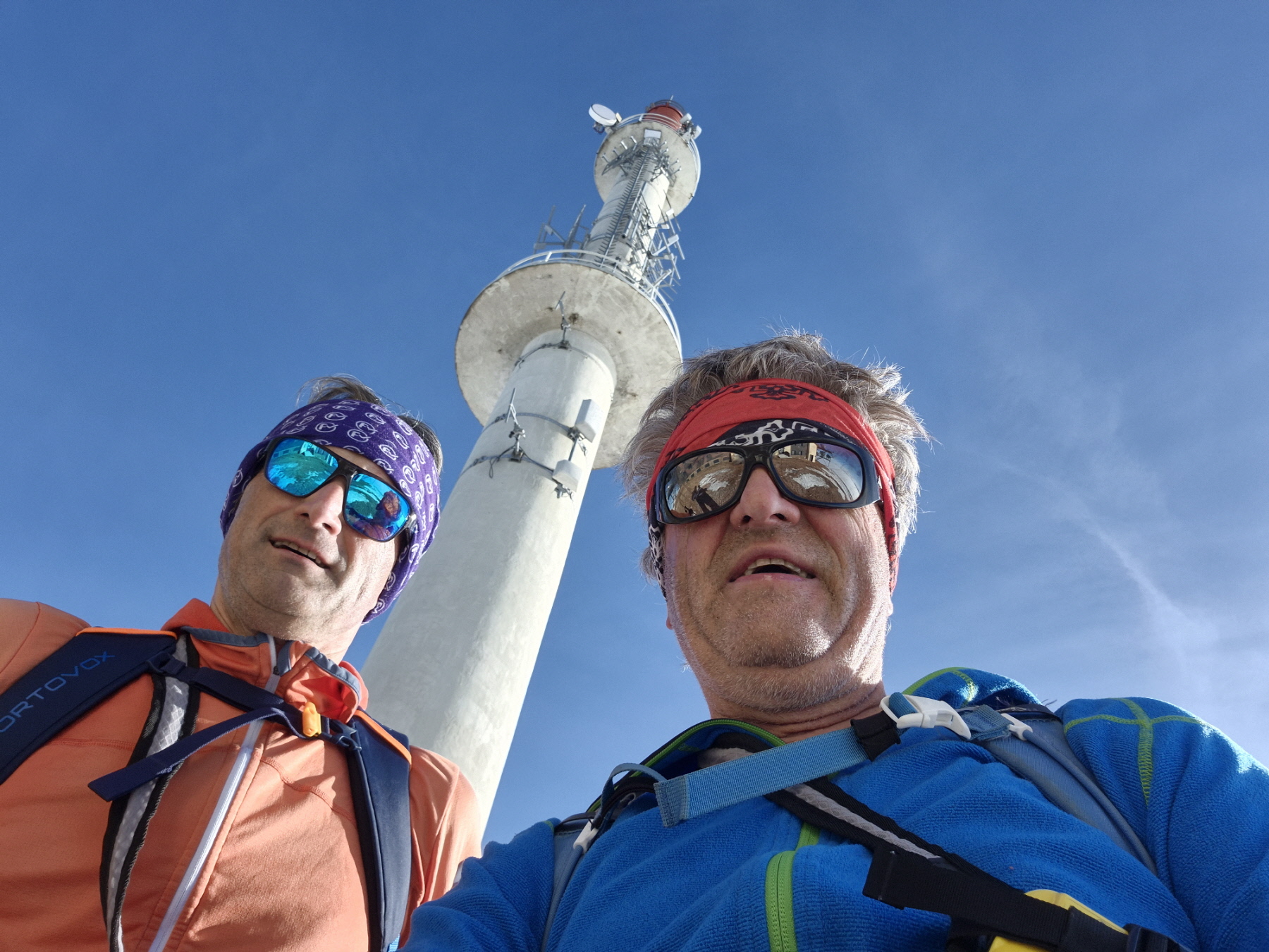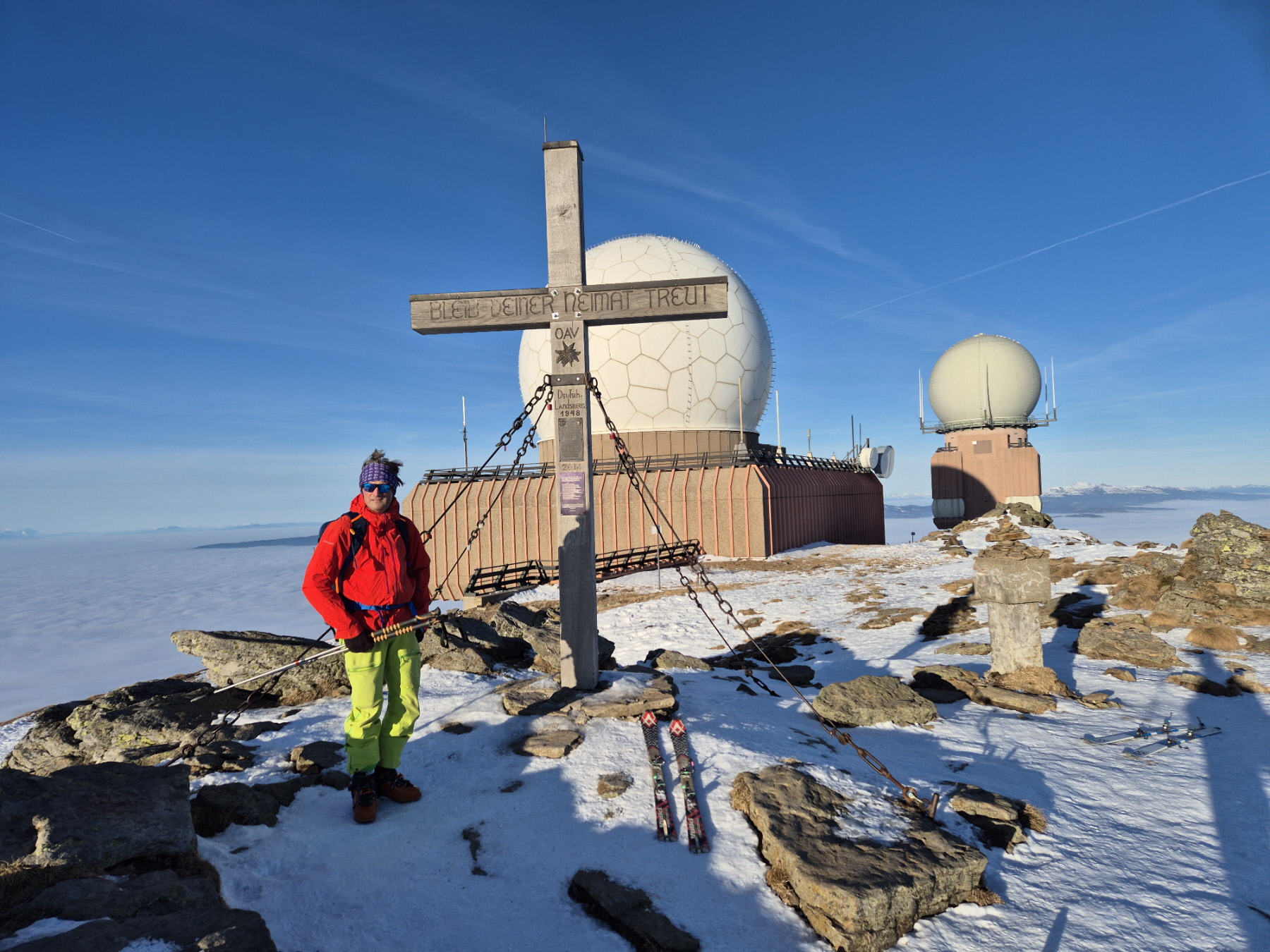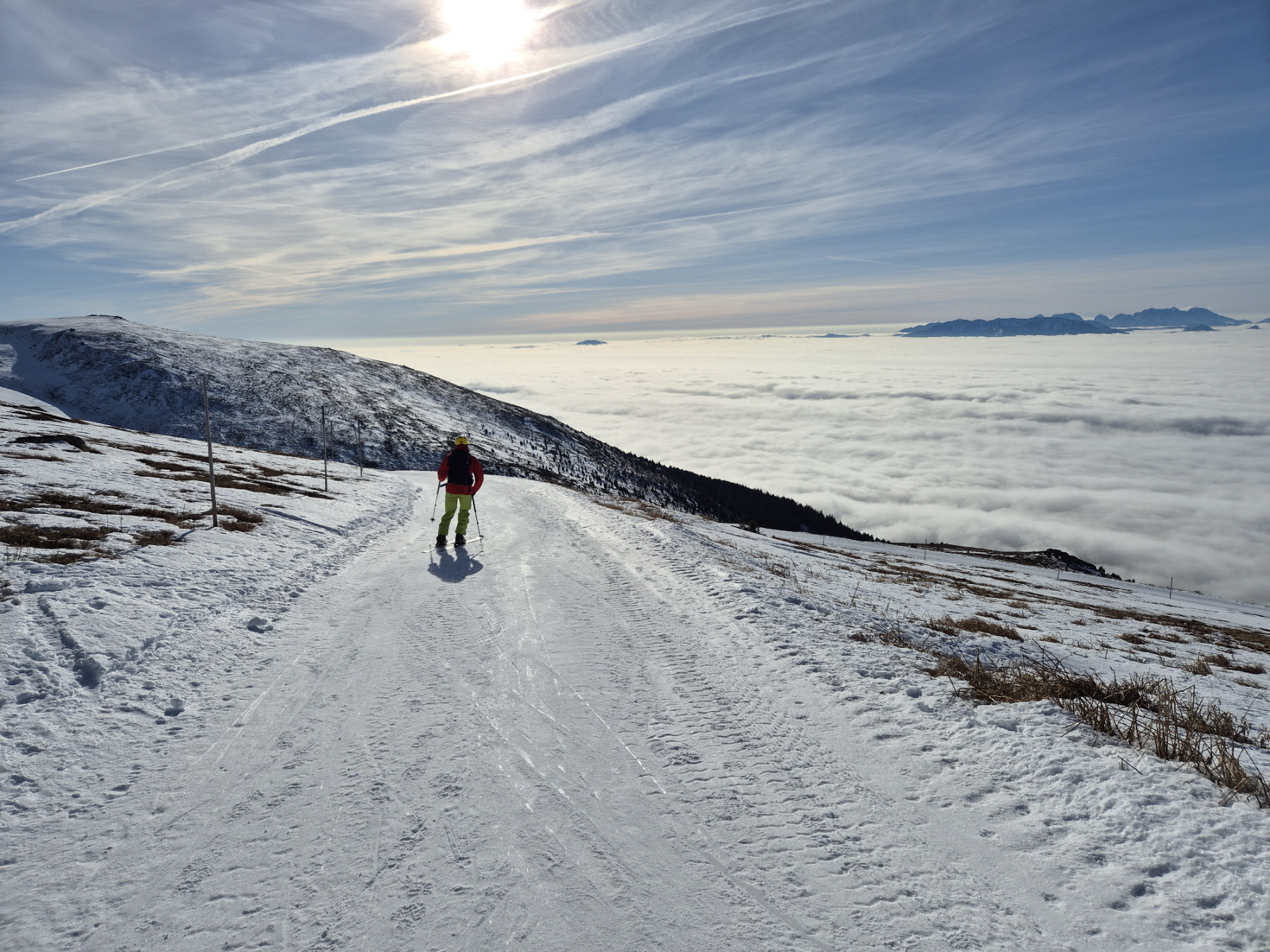 Weiter ging es dann hinauf entlang der Zufahrtstraße zu den Radarstationen, immer mit dem herrlichen Blick über das halb Kärnten bedeckende Nebelmeer. Und weil wir unterwegs ähnlich viel geplaudert haben wie in der Vorwoche hat der erste Anstieg exakt genauso lang gedauert wie vor einer Woche. Nach 1 Std 25 min waren wir beim Gipfelkreuz am Gr. Speikkogel.