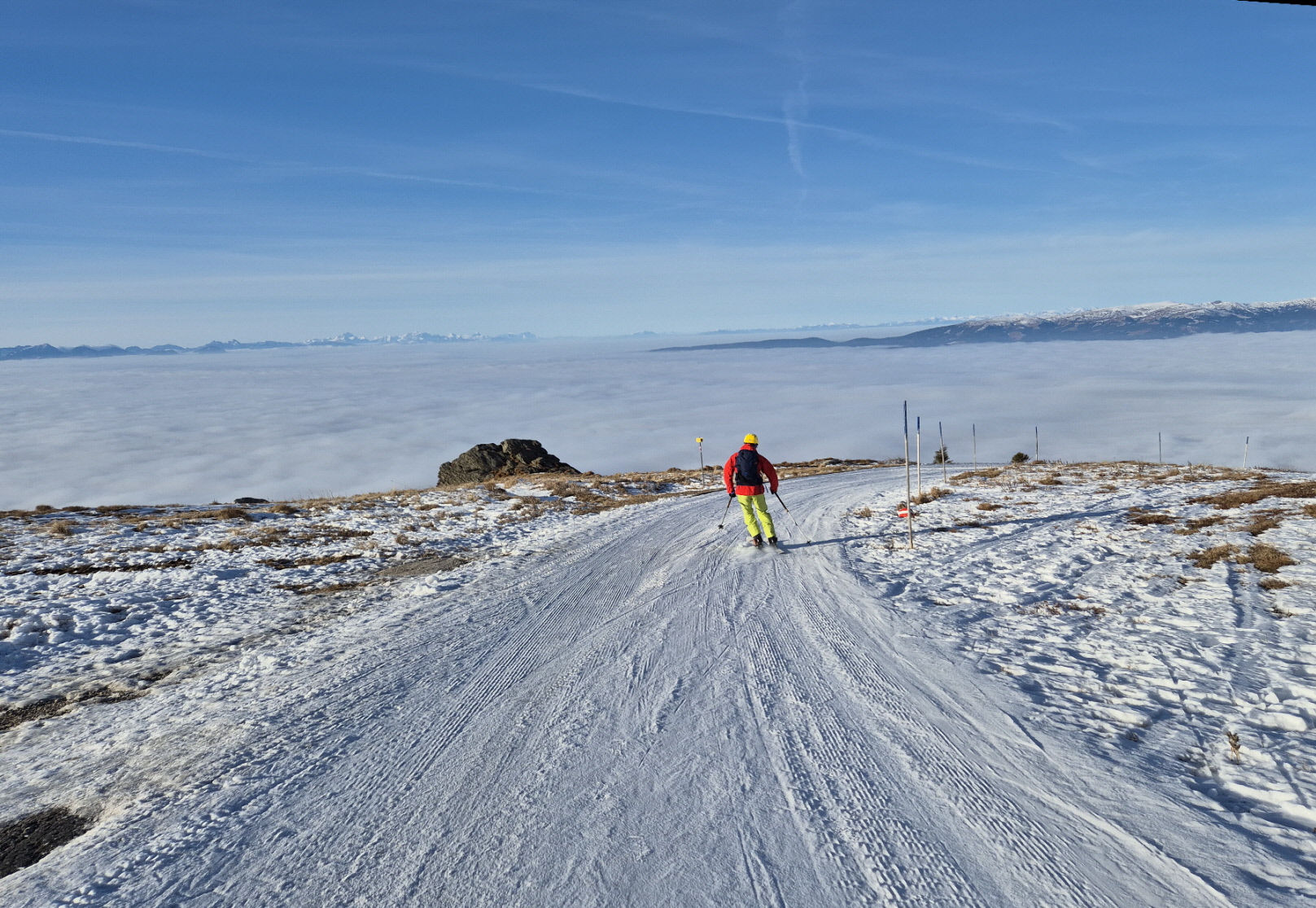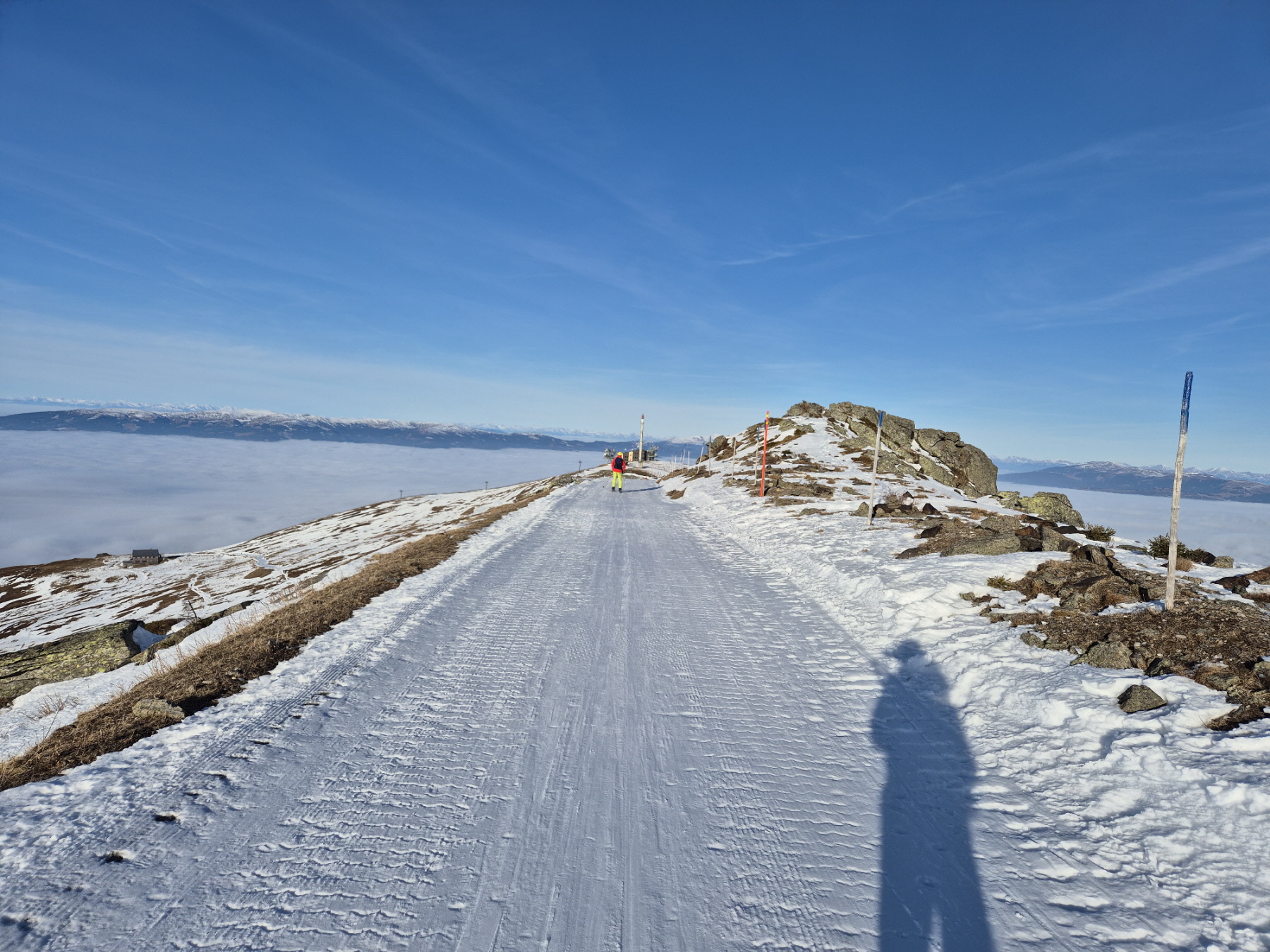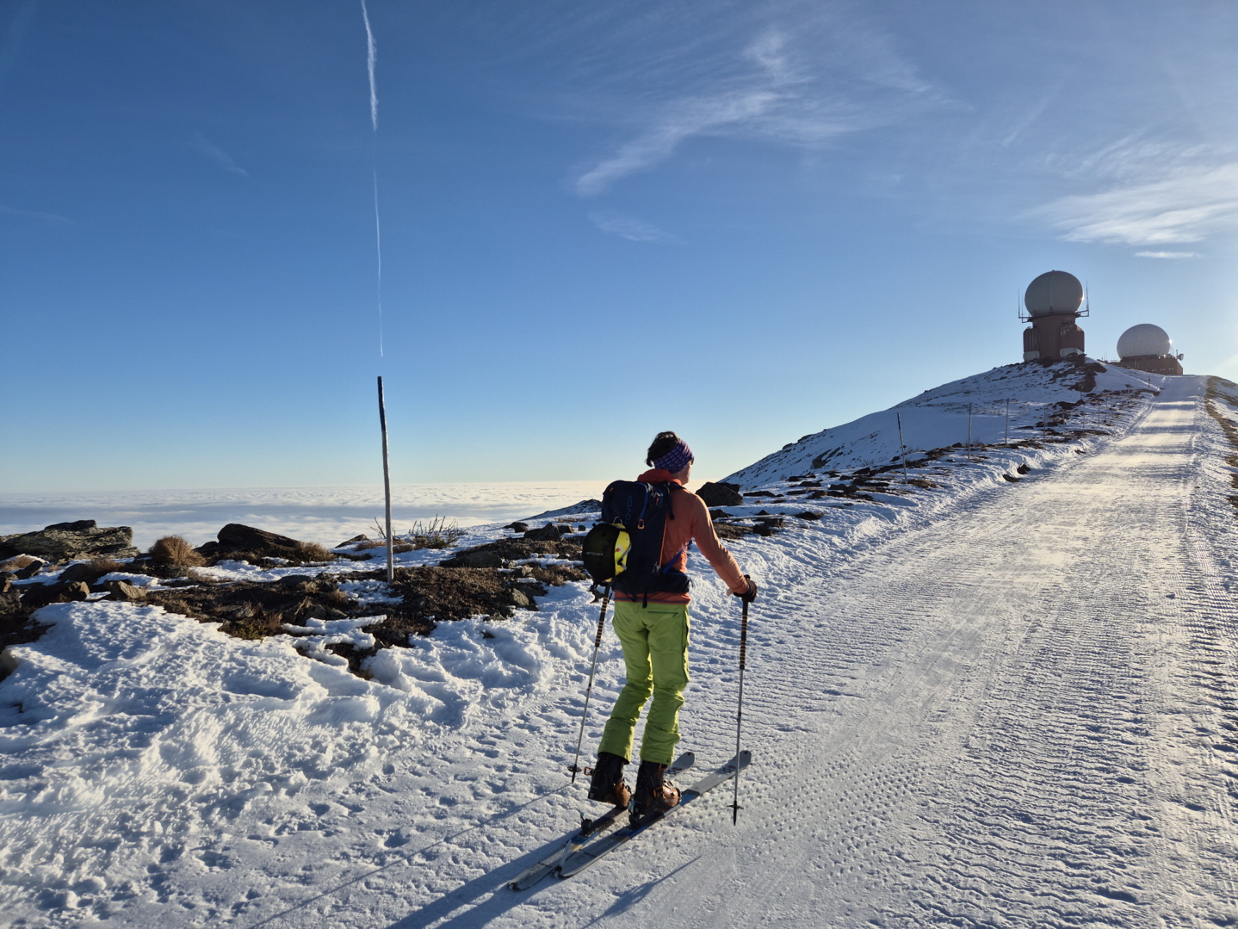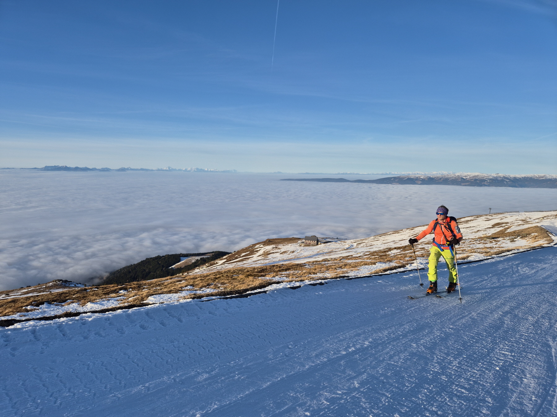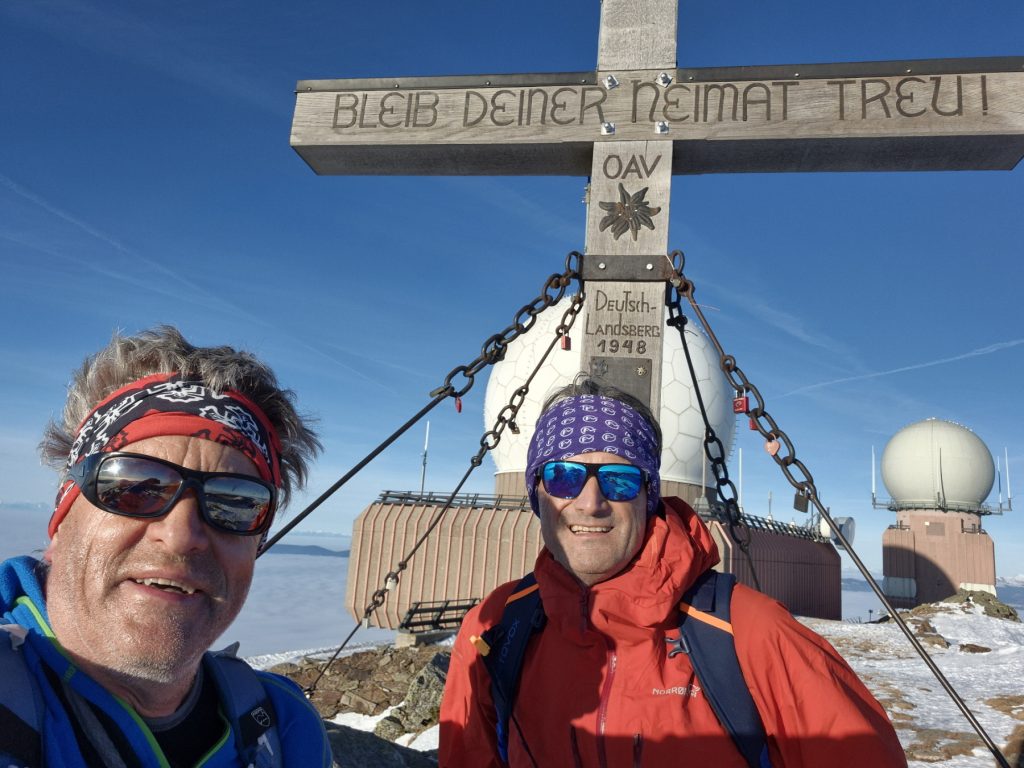 Weiter ging es dann hinauf entlang der Zufahrtstraße zu den Radarstationen, immer mit dem herrlichen Blick über das halb Kärnten bedeckende Nebelmeer. Und weil wir unterwegs ähnlich viel geplaudert haben wie in der Vorwoche hat der erste Anstieg exakt genauso lang gedauert wie vor einer Woche. Nach 1 Std 25 min waren wir beim Gipfelkreuz am Gr. Speikkogel.