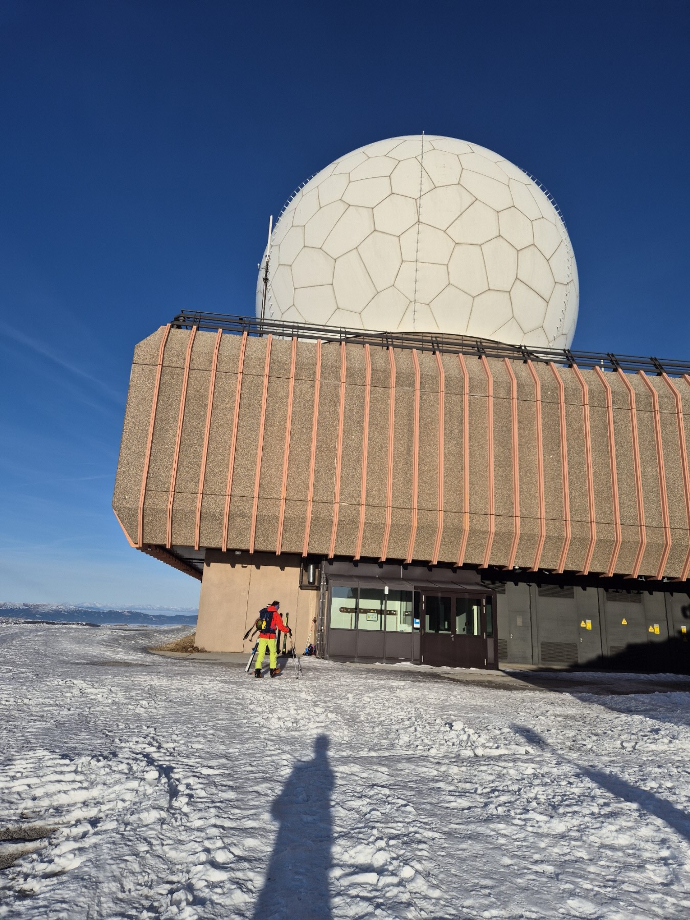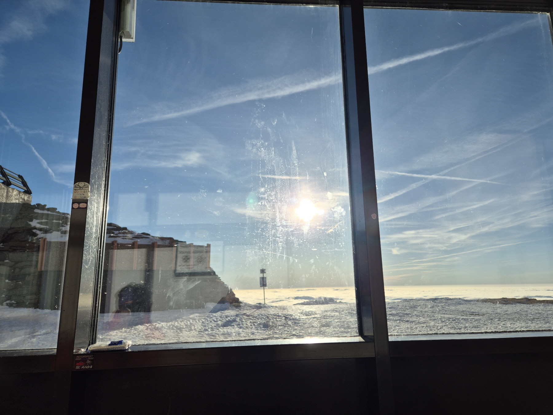 Nach dem (neben der An- und Abreise) „gefährlichsten“ Teil der Tour, nämlich dem kurzen Abstieg vom Gipfel auf vereistem Untergrund, haben wir abgefellt und uns im Winterraum der AustroControl gestärkt. Es wäre zwar diesmal draußen auch weniger Wind gewesen als in der Vorwoche, aber es ist schon fein, wenn man bei der „Gipfeljause“ auf einer Bank sitzend sich durch die Glasscheibe von der Sonne anstrahlen lassen kann.