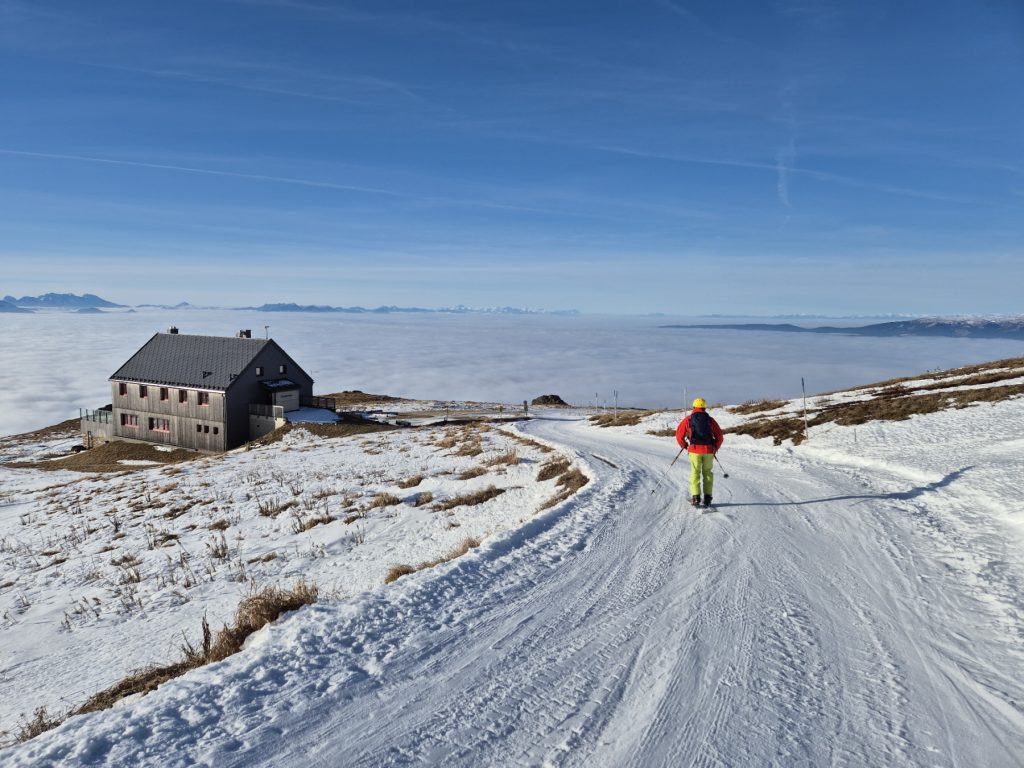 Wie in der Vorwoche haben wir dort wieder aufgefellt und sind noch einmal angestiegen. Dass zu diesem Zeitpunkt uns schon einige Pistenskiläufer entgegen gekommen sind war, klar. Aber wenn man sich an die vorgegeben Route am Pistenrand hält, ist dies kein Problem. Vorbei am Koralpenhaus ging es jetzt hinauf zu unserem zweiten Tagesgipfel, dem Steinschneider.