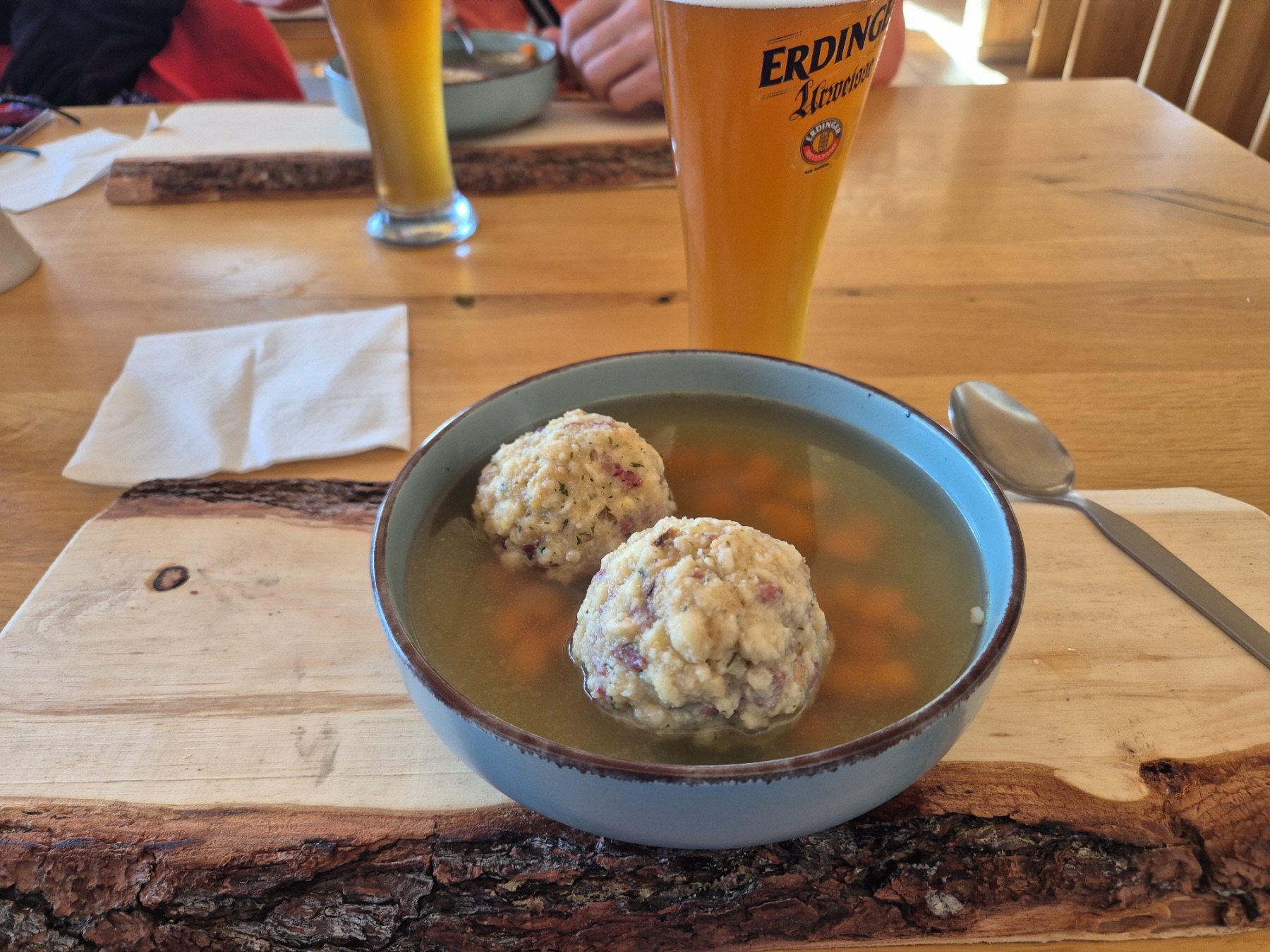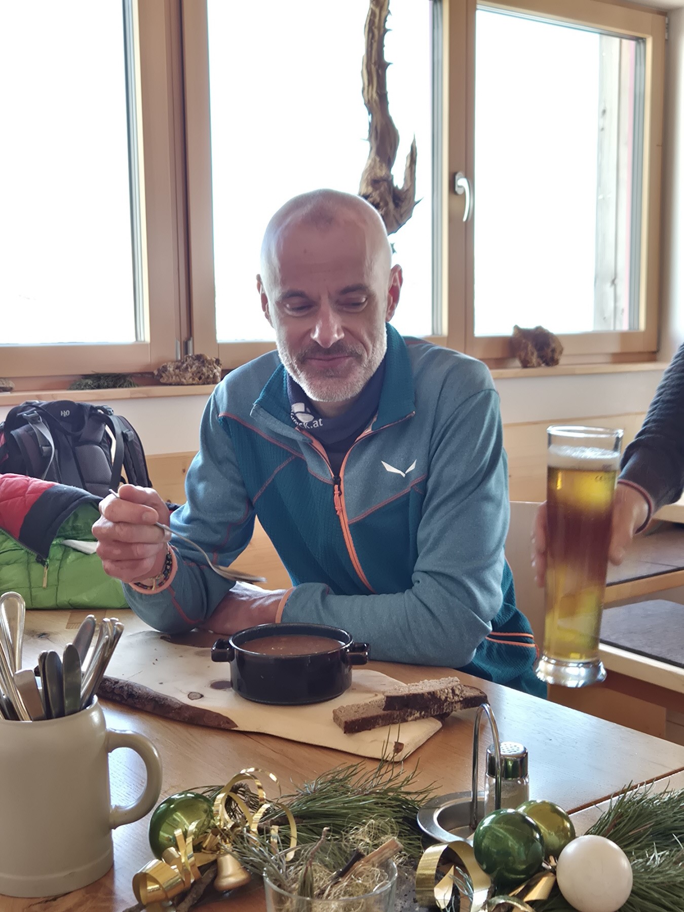 Meine Speckknödelsuppe war ausgezeichnet, Andreas hat sich für die Kasknödel entschieden. Beim Suppen löffeln hat uns auch Klaus Macheiner Gesellschaft geleistet. Auch er hat die Arbeit vor Weihnachten schon eingestellt, ist dem Nebel entflohen und hat sich nach zwei Anstiegen zum Gr. Speikkogel eine Gulaschsuppe gegönnt.