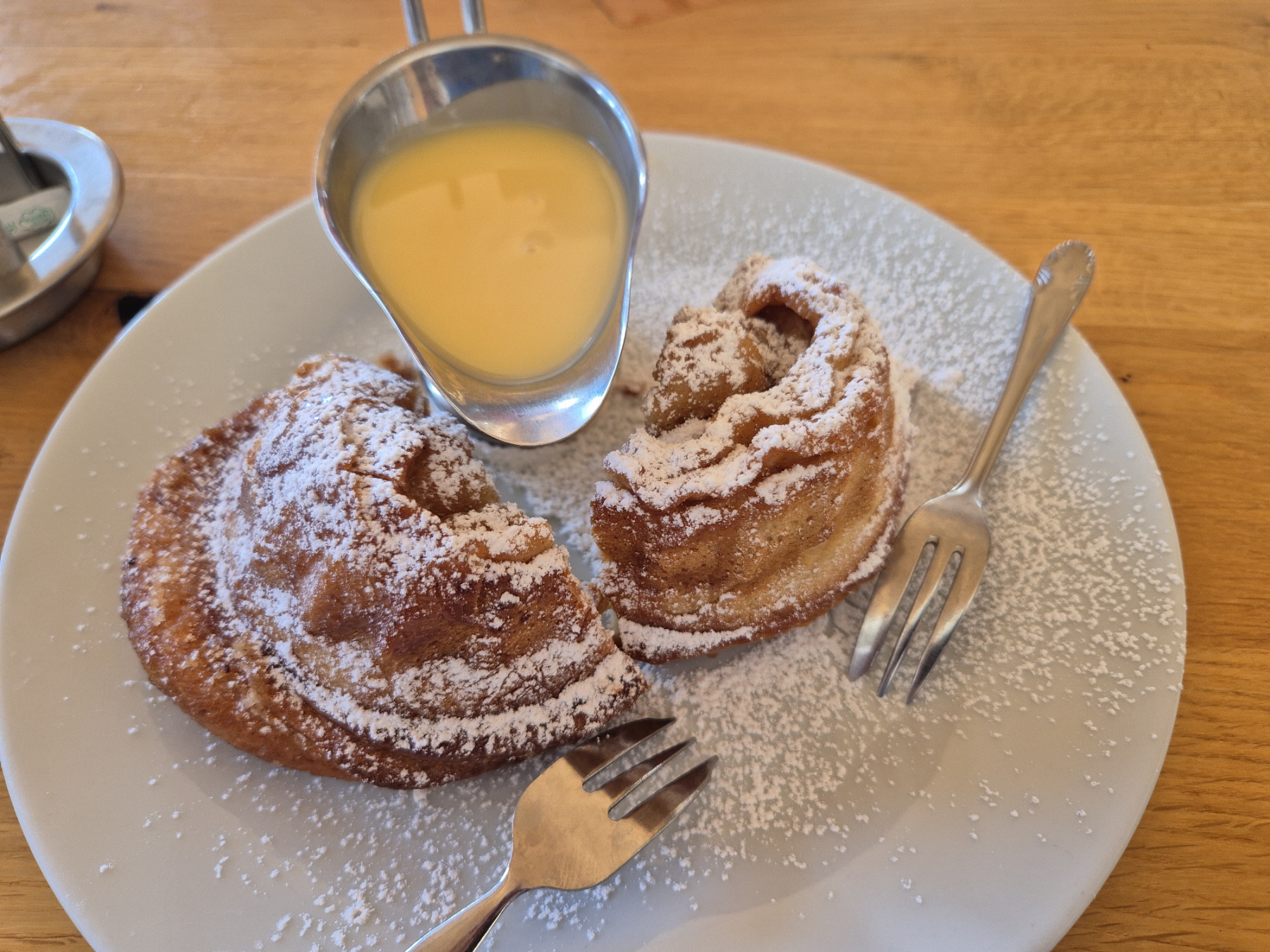 Die Zuckerreinkerln waren aber gerade frisch angeliefert und daher haben wir uns zum Drüberstreuen wieder ein solches, mit warmem Eierlikör übergossen, zum Kaffee gegönnt. Derart gestärkt sind wir zusammen mit Klaus anschließend bei Sonnenschein die restliche Strecke bis zum Ausgangspunkt der Tour abgefahren und einige hundert Höhenmeter weiter unten am Heimweg wieder – zum Suppentag passend – in die trübe Nebelsuppe eingetaucht.