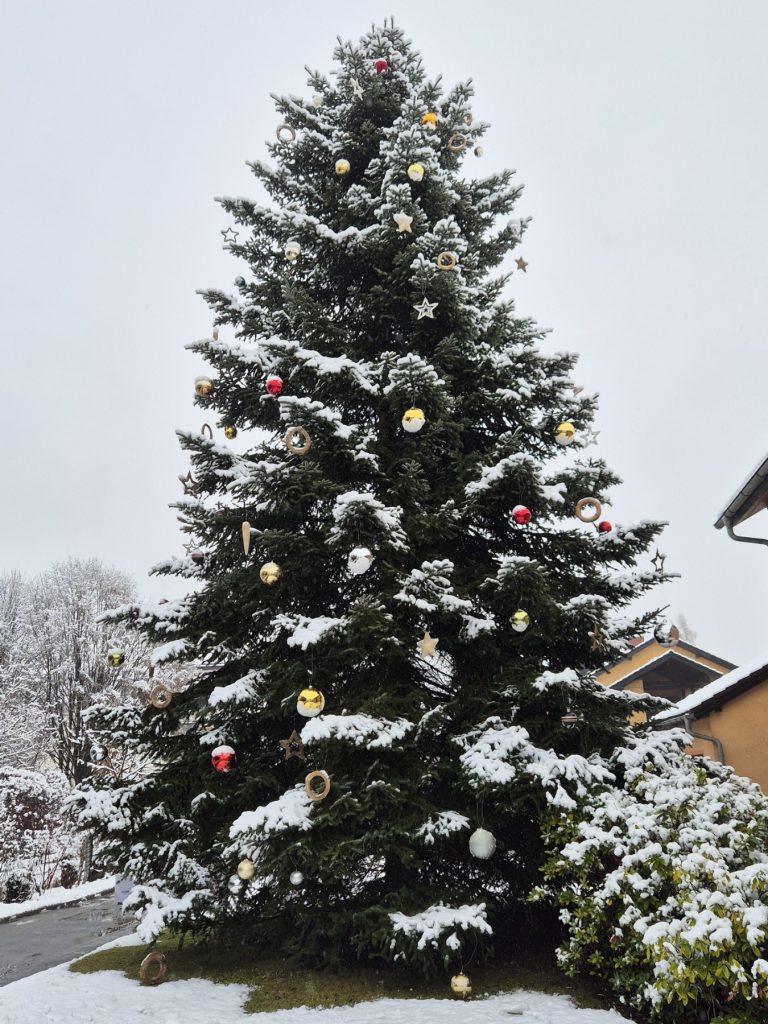 Dem Klaus, dem Heinrich und allen übrigen Leserinnen und Lesern meines Blogs wünsche ich abschließend mit einem Bild des pünktlich zu Weihnachten angeschneiten CHRIS(t)baumes vor unserem Haus eine schöne Zeit. Mit dem weihnachtlichen Neuschnee verbinde ich auch die Hoffnung, dass wir bald einmal auch abseits von Pisten uns wieder auf Skiern im Gelände bewegen können.