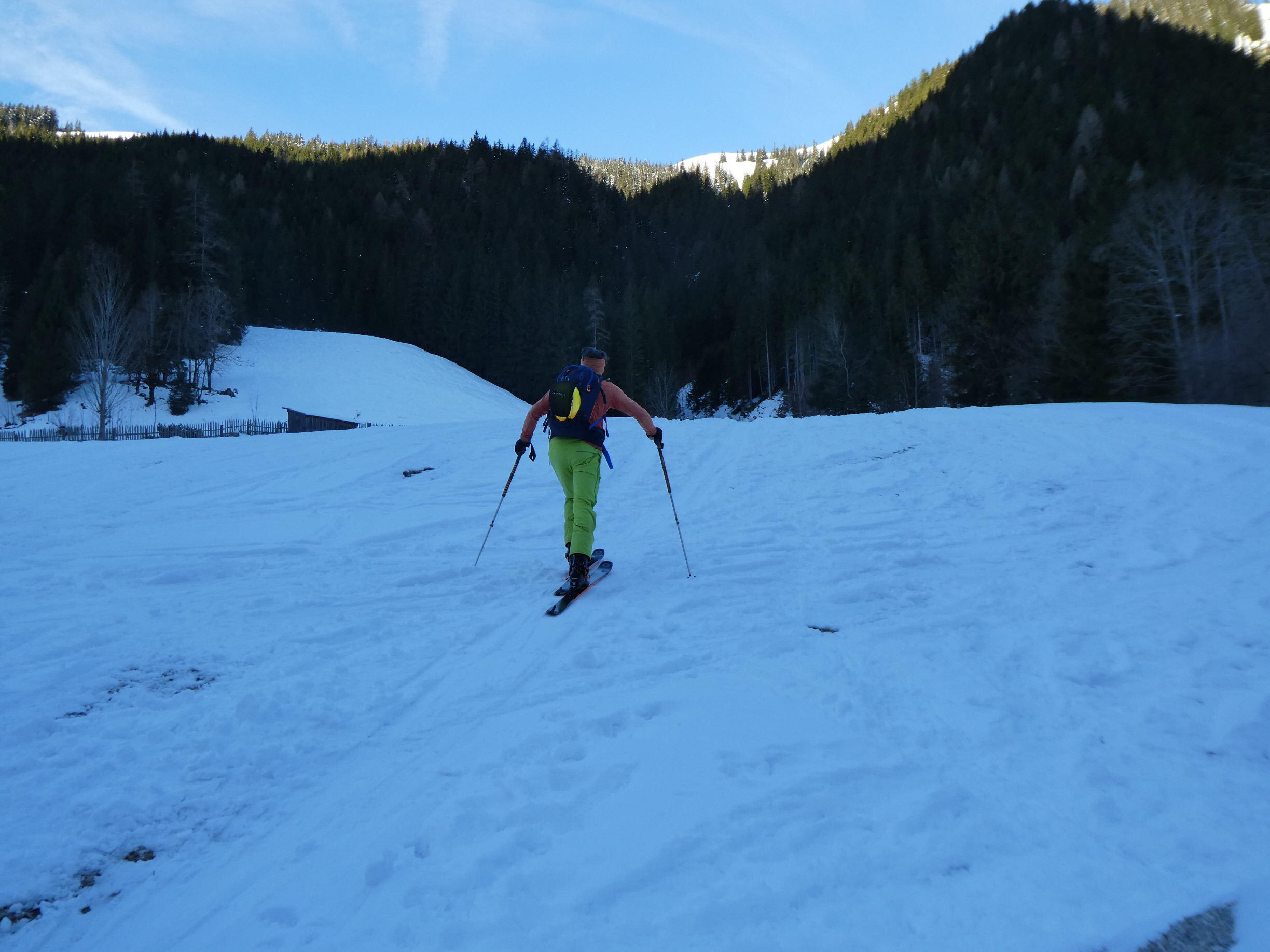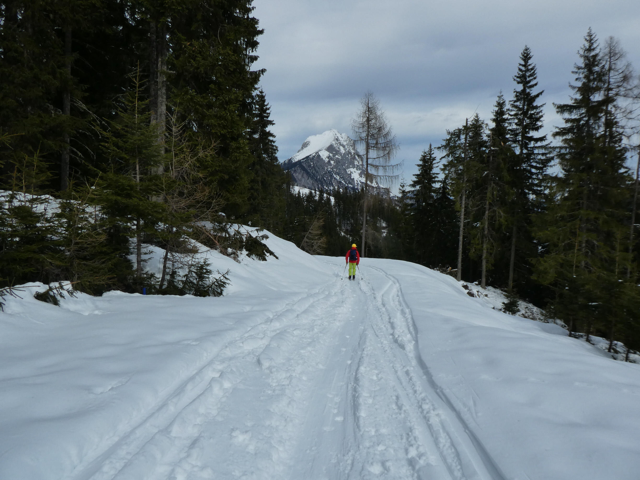 Mit zunehmender Höhe ist es aber immer winterlicher geworden. Dort wo der Forstweg, auf dem wir zu diesem Zeitpunkt wieder unterwegs waren, zur Schafbodenalm abzweigt, sind wir geradeaus weiter. Nach der obligaten Zwischenabfahrt und dem Umschiffen des heuer dort weit offenen Baches in der Wegkehre über den Wechtenrand, ging es hinauf ins Lochalpl.