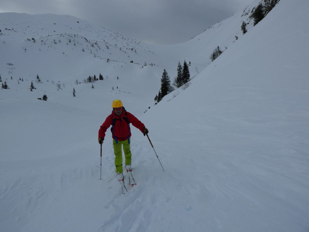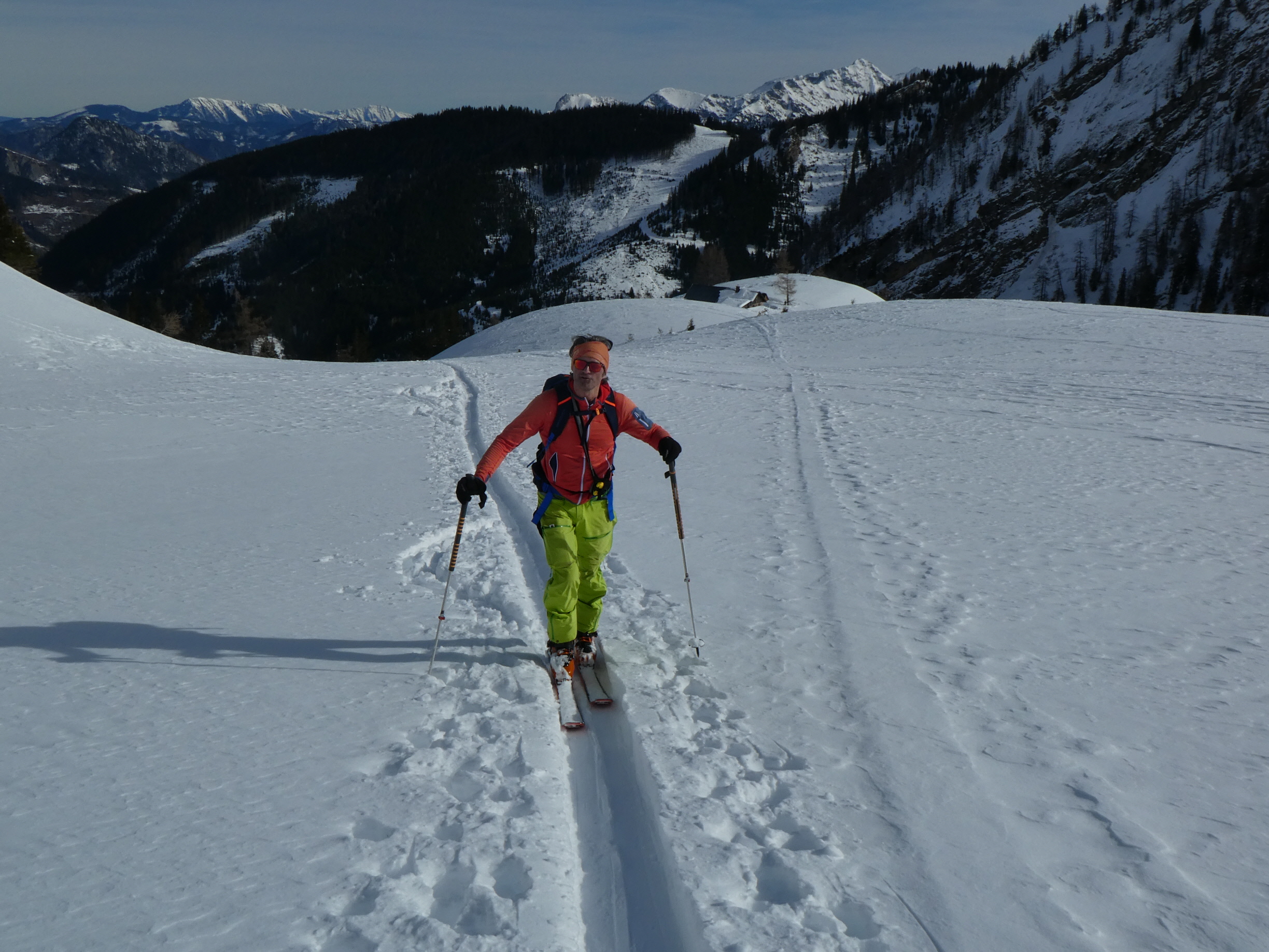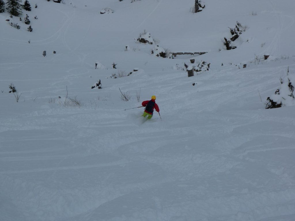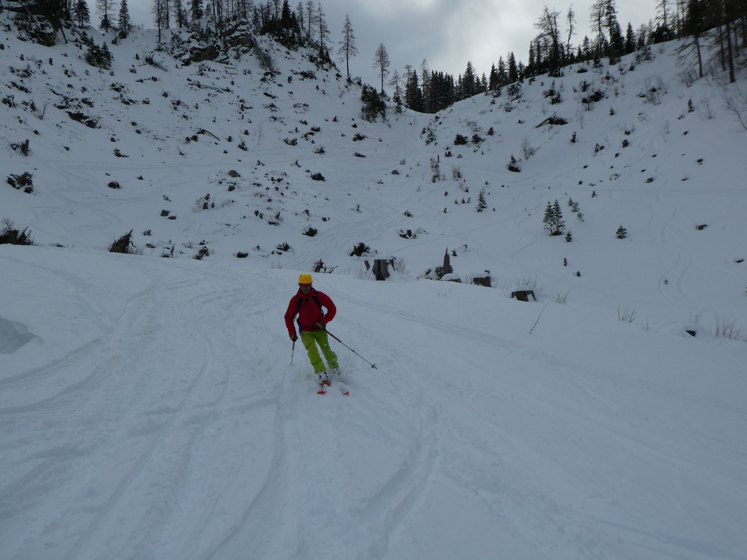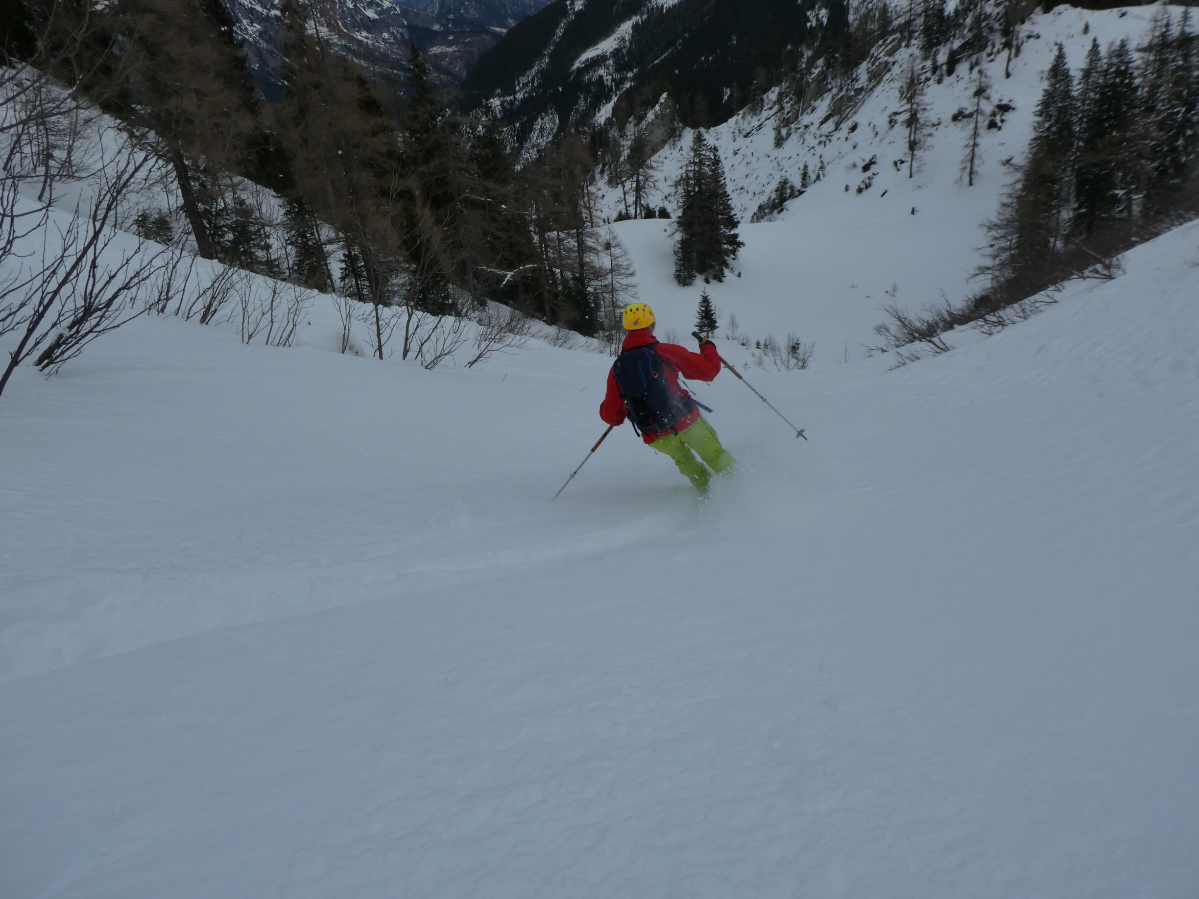 Im Lochalpl selbst sind wir wieder auf die Abfahrtsspuren der am Vortag und vereinzelt auch heute schon vor uns Abfahrenden getroffen. Trotzdem hat es hier an der Nordseite noch ein paar unverspurte Flecken im tiefen Pulver auch für uns gegeben.