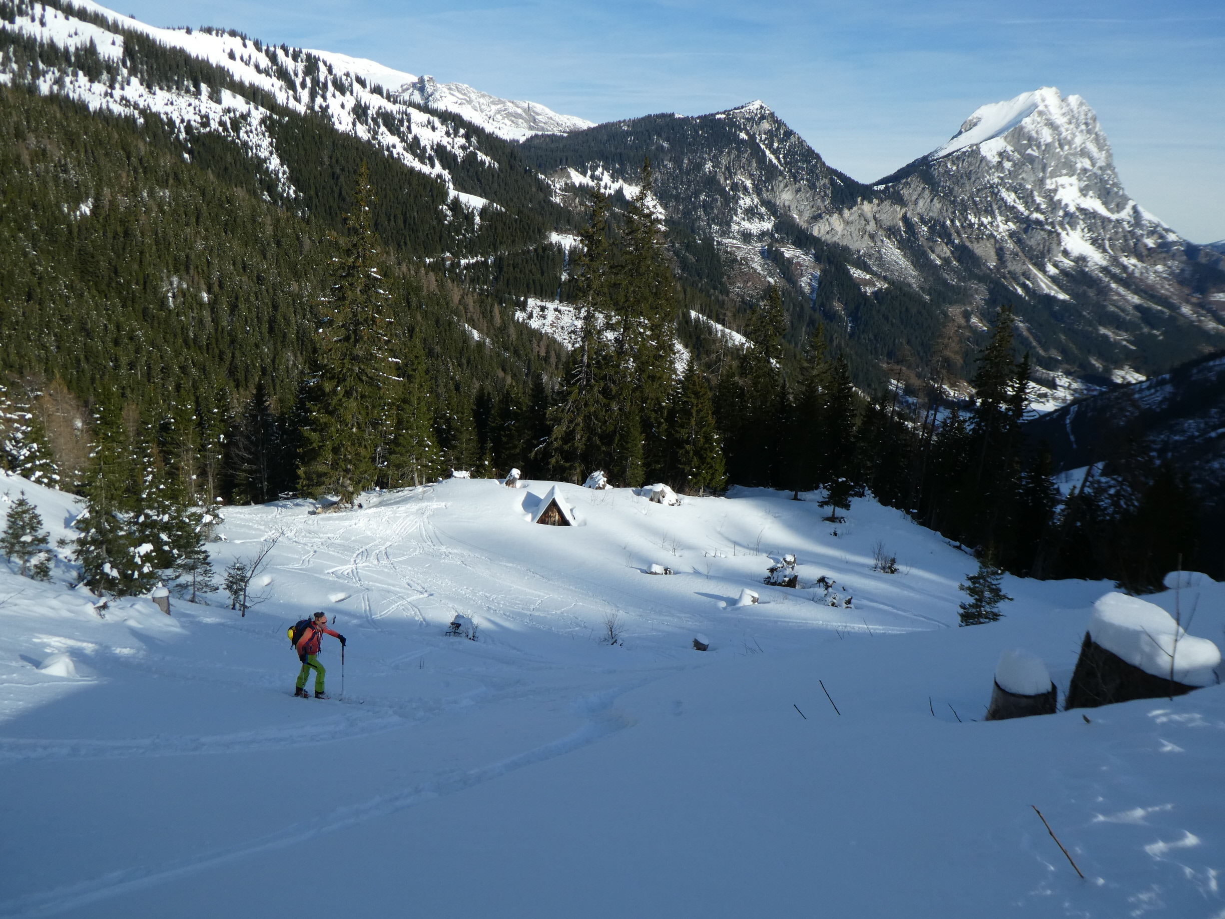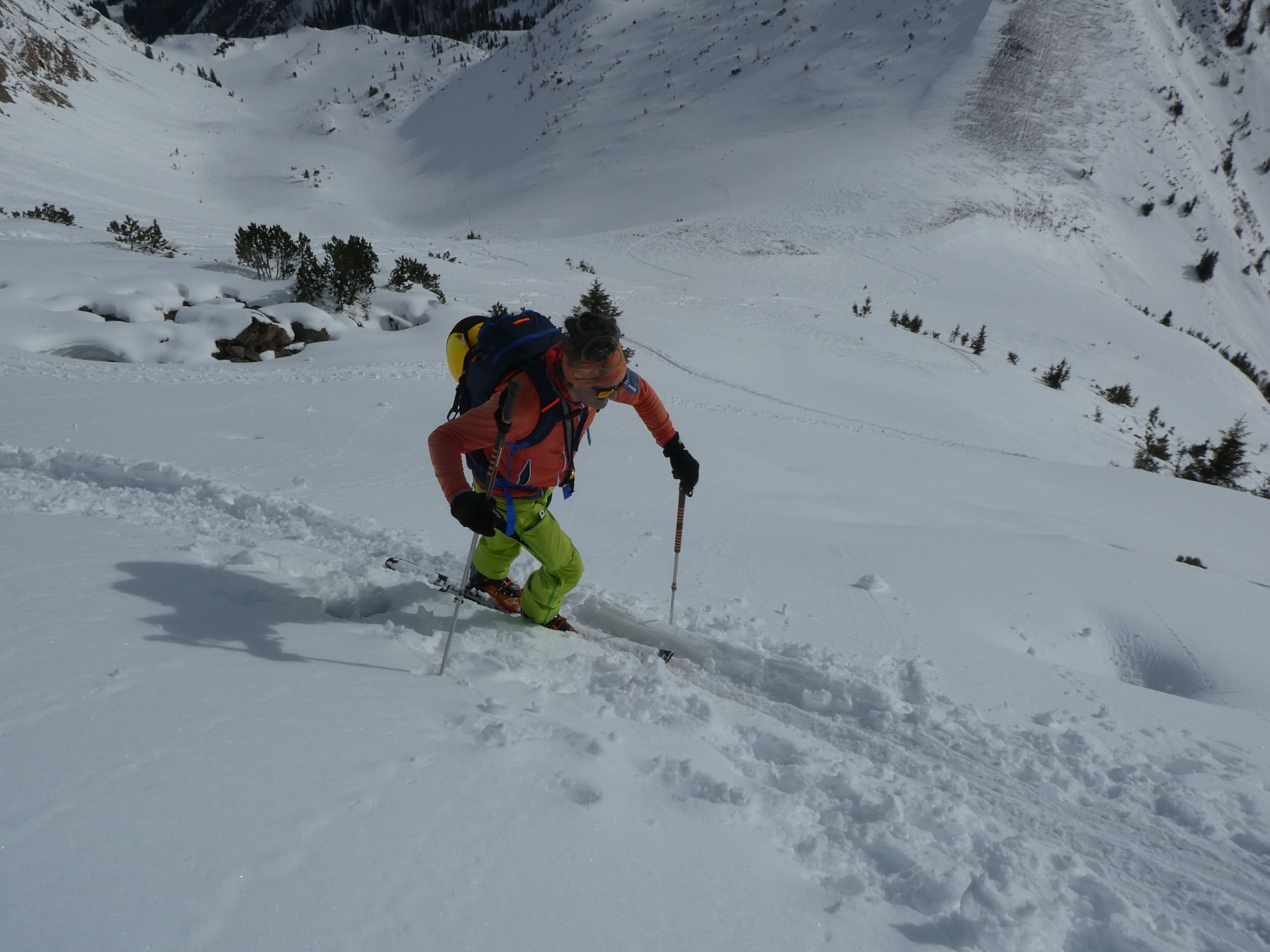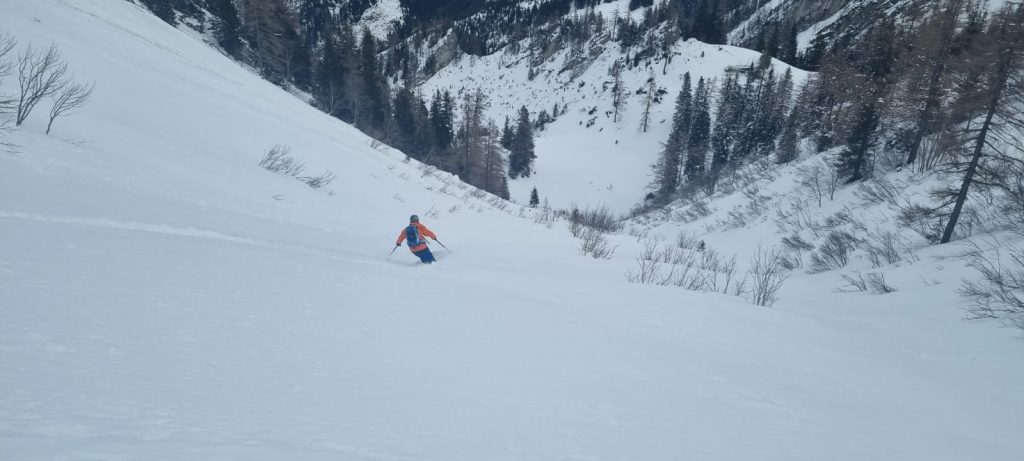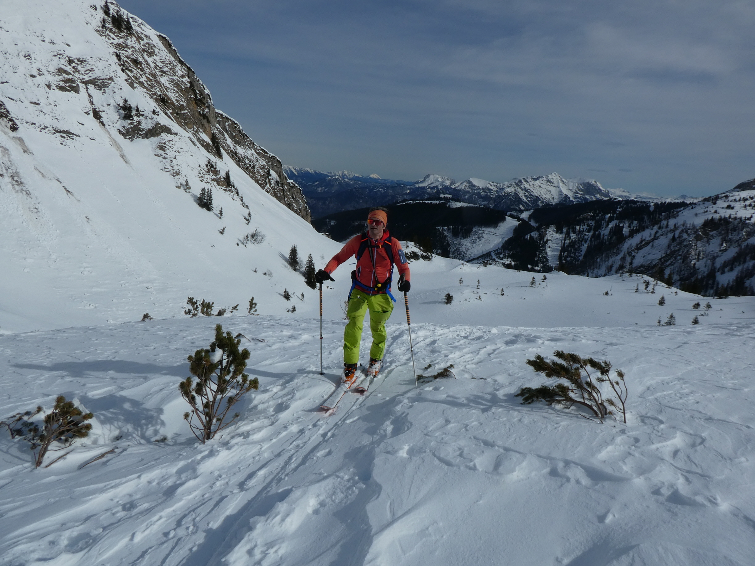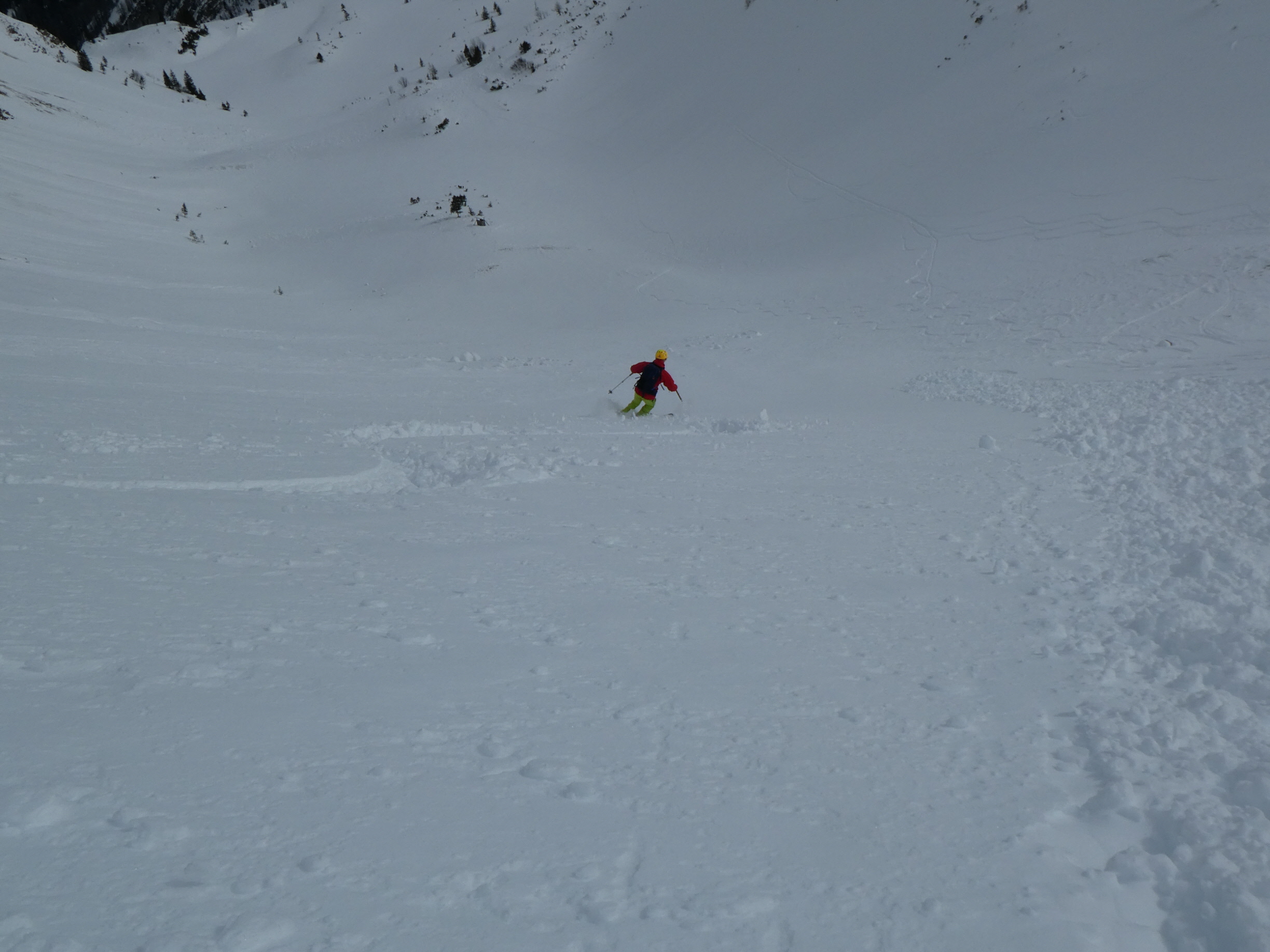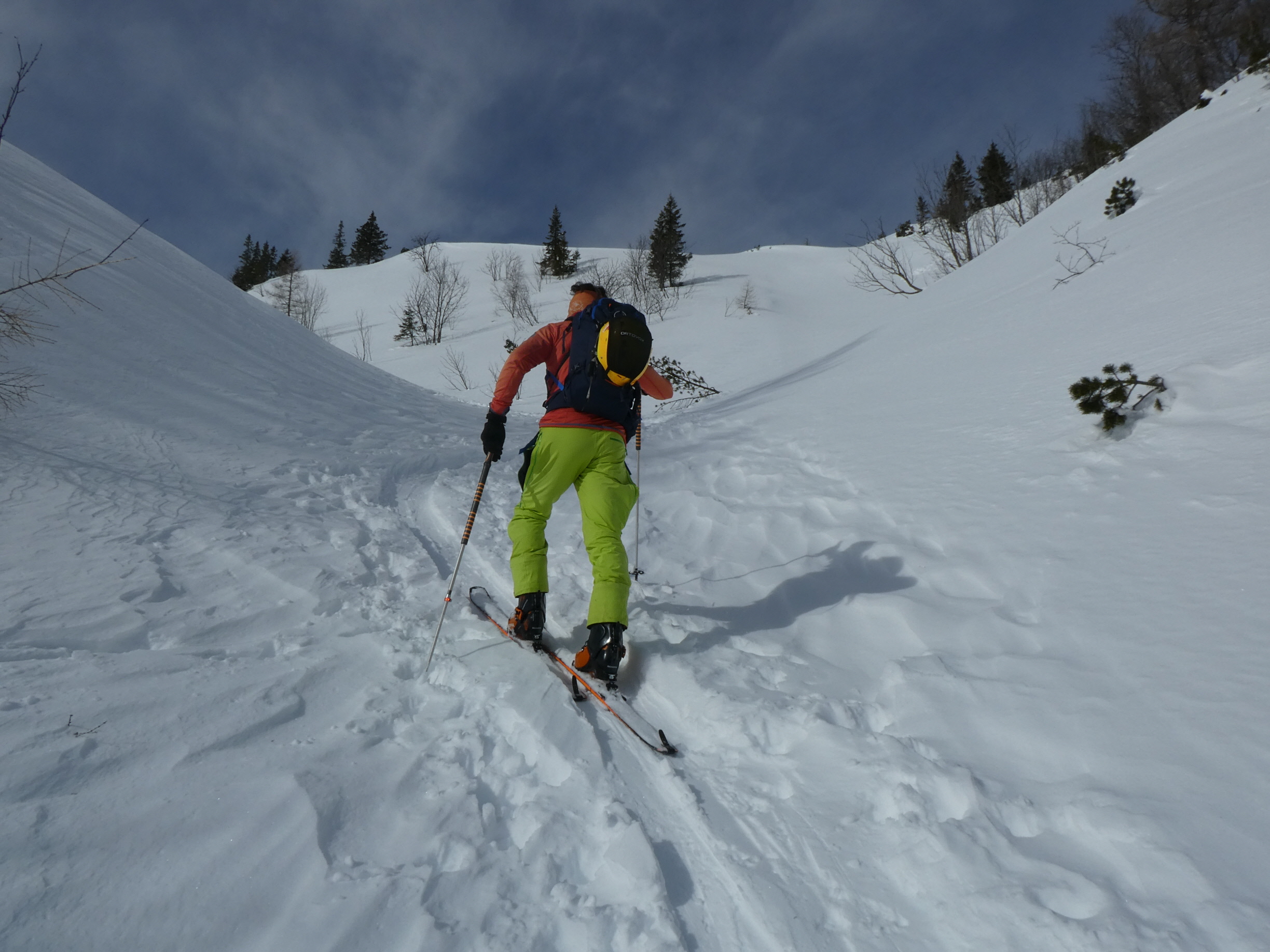 Im Lochalpl selbst sind wir wieder auf die Abfahrtsspuren der am Vortag und vereinzelt auch heute schon vor uns Abfahrenden getroffen. Trotzdem hat es hier an der Nordseite noch ein paar unverspurte Flecken im tiefen Pulver auch für uns gegeben.