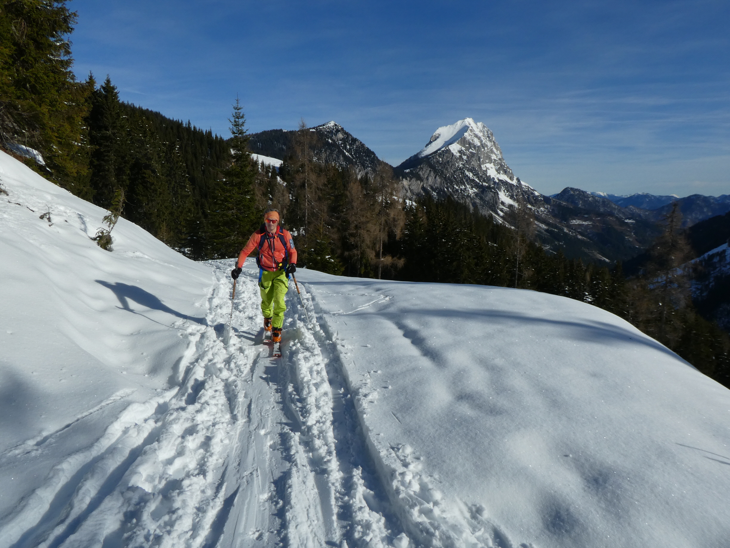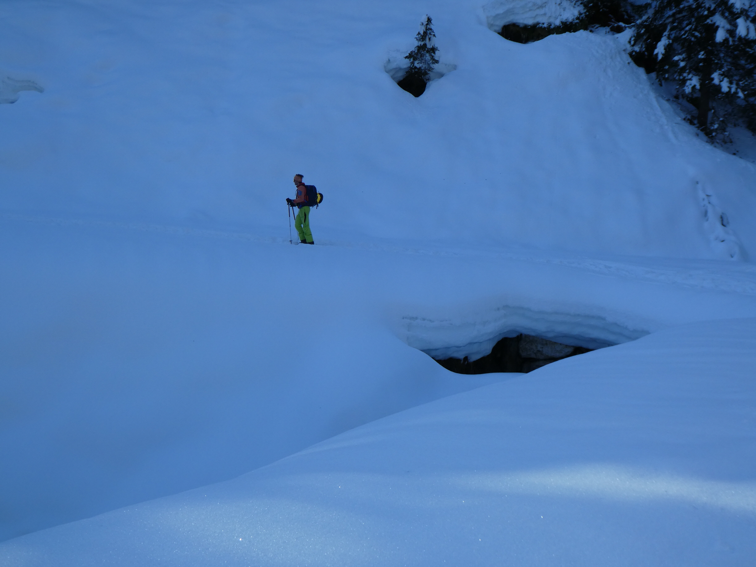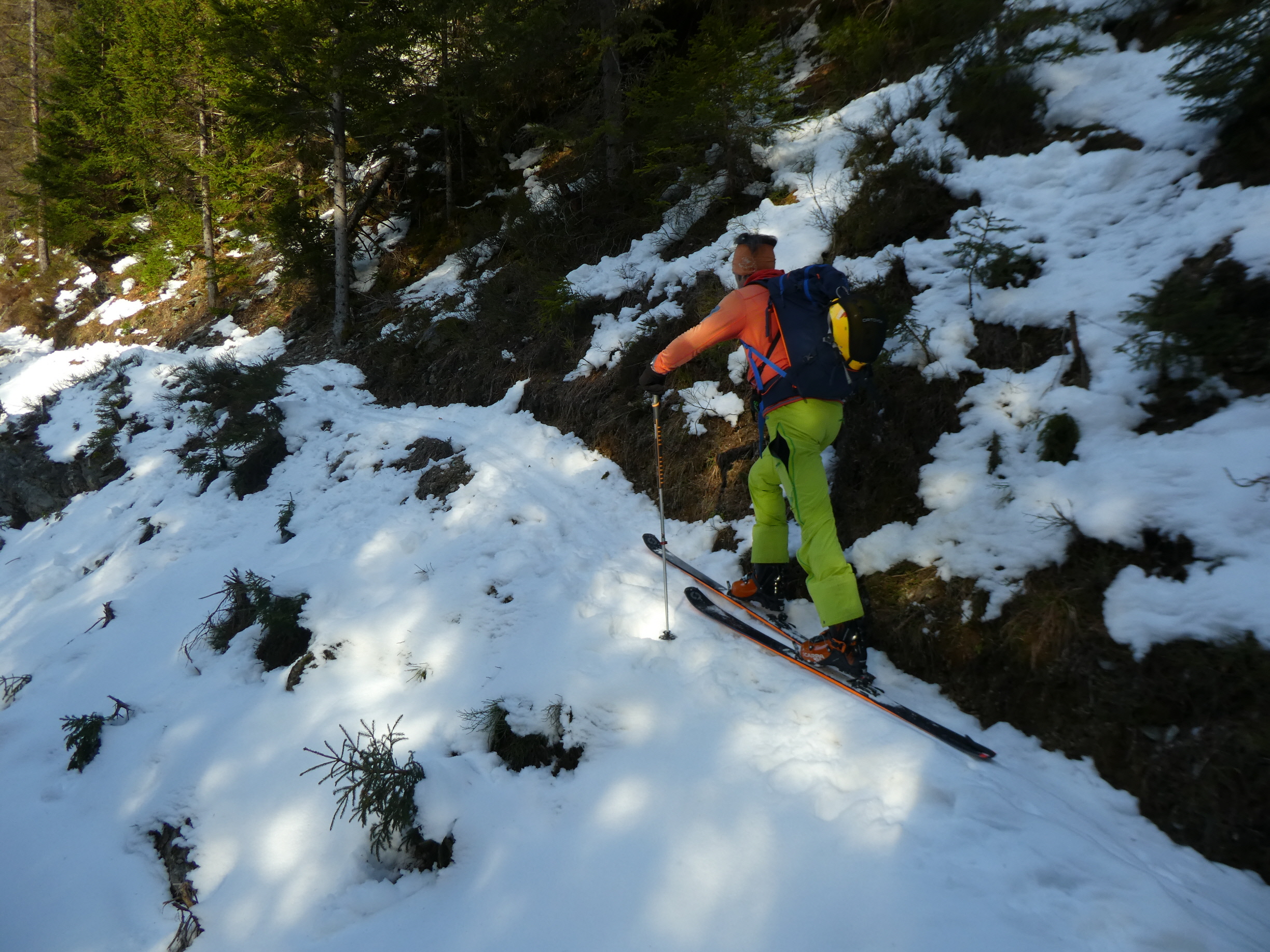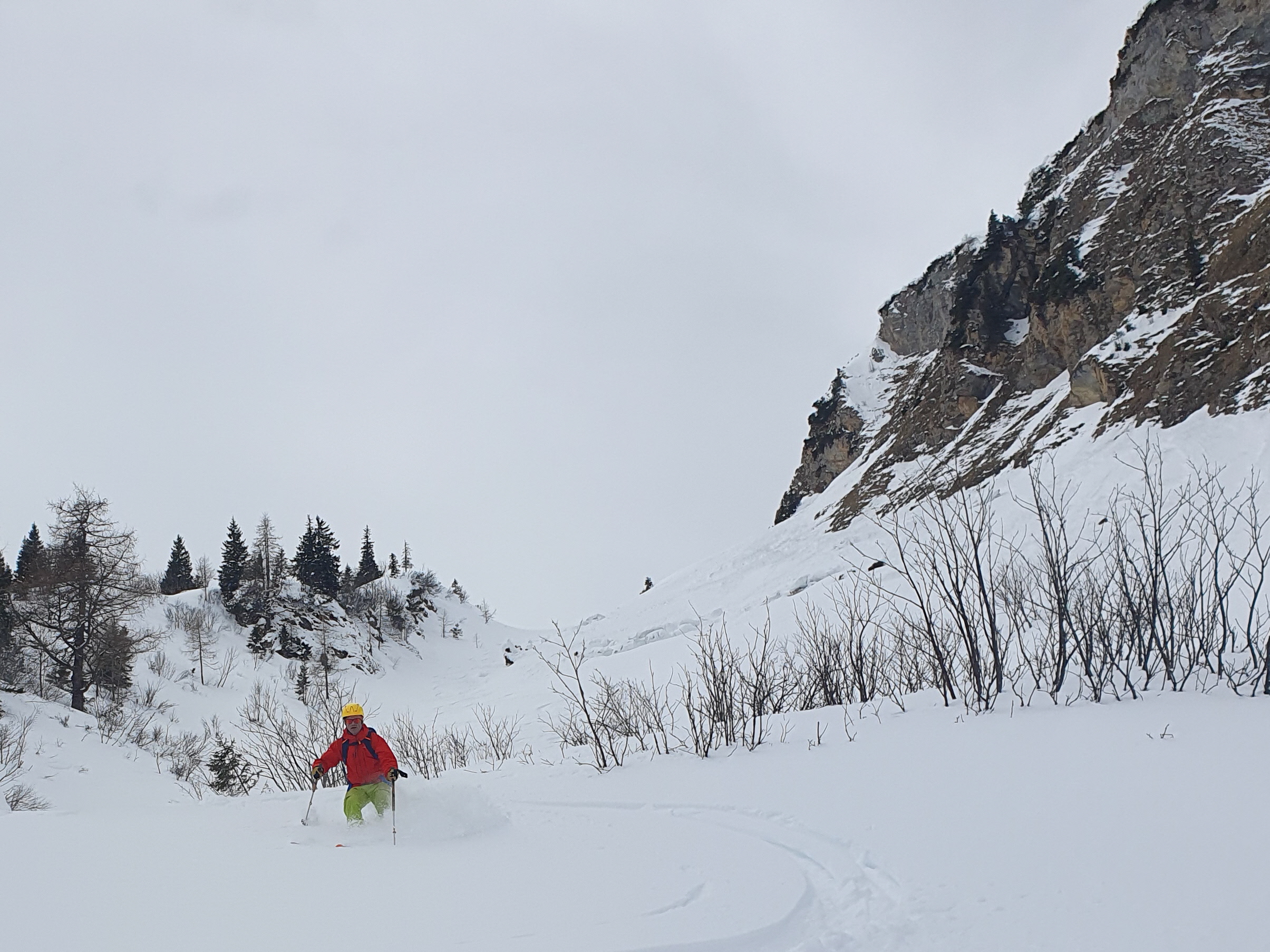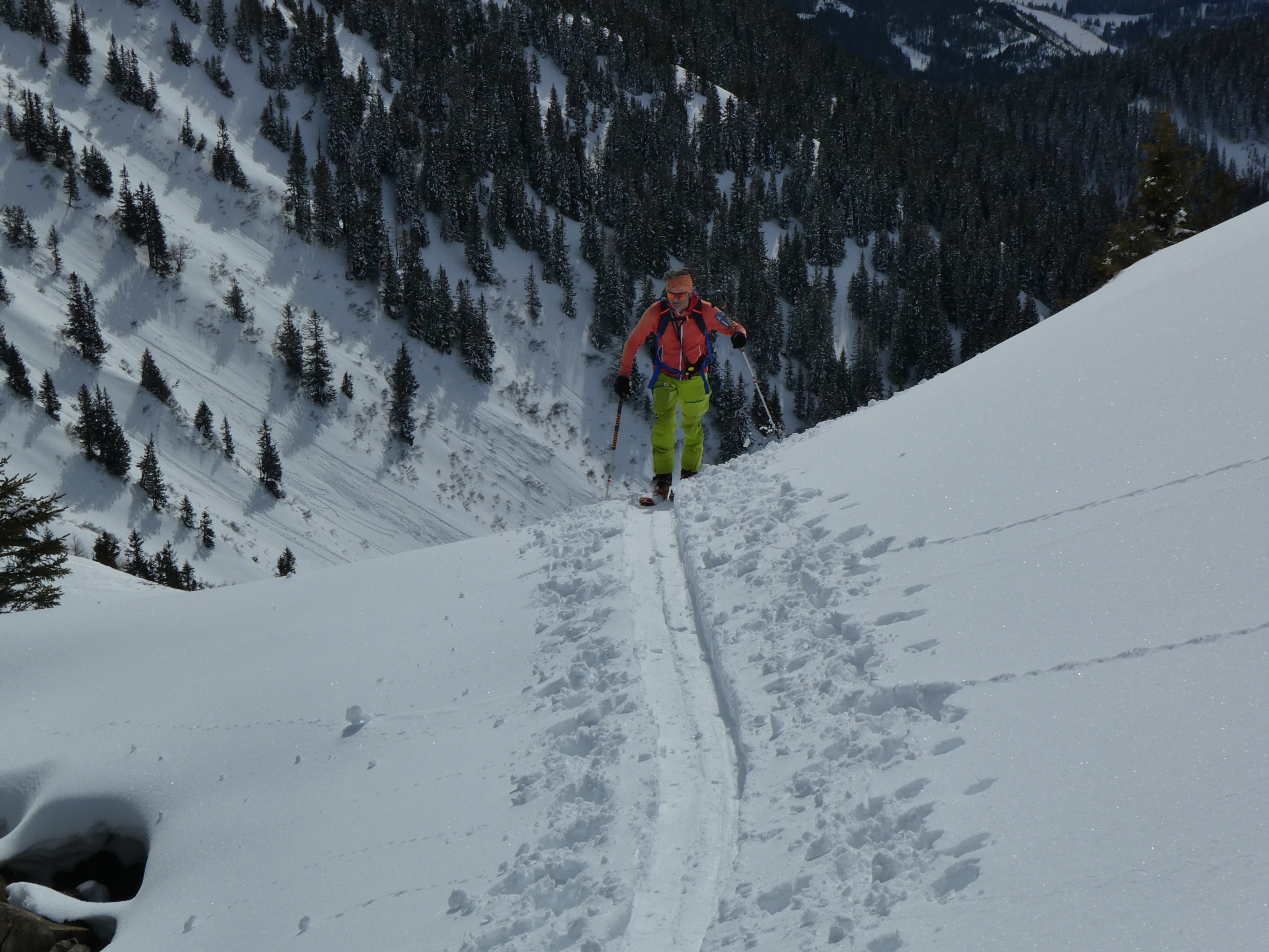 Im Lochalpl selbst sind wir wieder auf die Abfahrtsspuren der am Vortag und vereinzelt auch heute schon vor uns Abfahrenden getroffen. Trotzdem hat es hier an der Nordseite noch ein paar unverspurte Flecken im tiefen Pulver auch für uns gegeben.