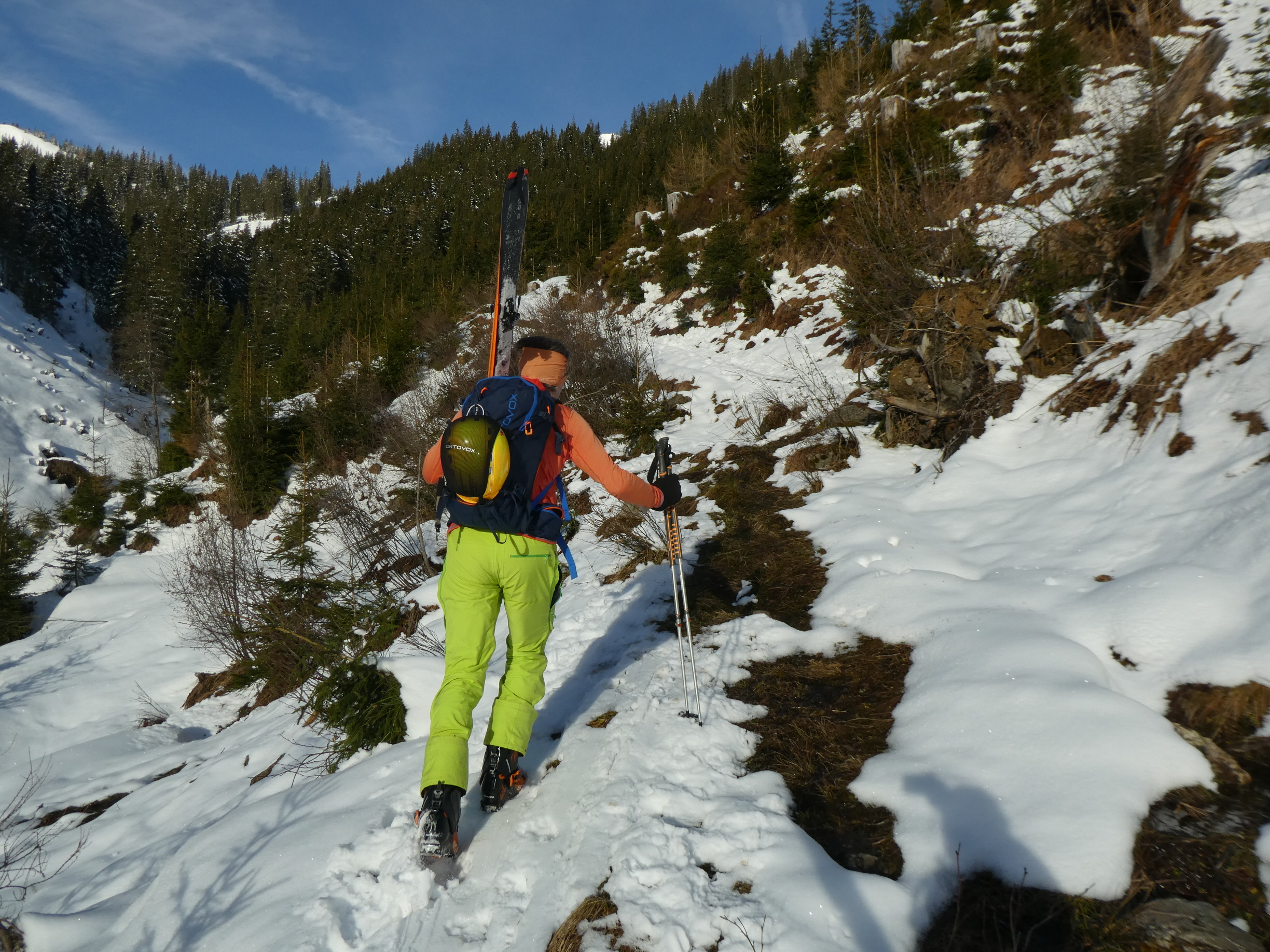 Dass der auf den zuvor schon ausgeaperten Boden gefallene Neuschnee nicht lange Bestand haben wird, war uns beim Anstieg am ersten Hang, der folgenden Waldpassage und dann beim Anstieg am Steig hinauf in Richtung Schafböden bald einmal klar. Viele kleine Bächlein waren zu übersteigen, immer darauf achtend, die Felle nicht nass zu machen. Einmal haben wir für eine kurze Strecke auch abgeschnallt und die Skier getragen.