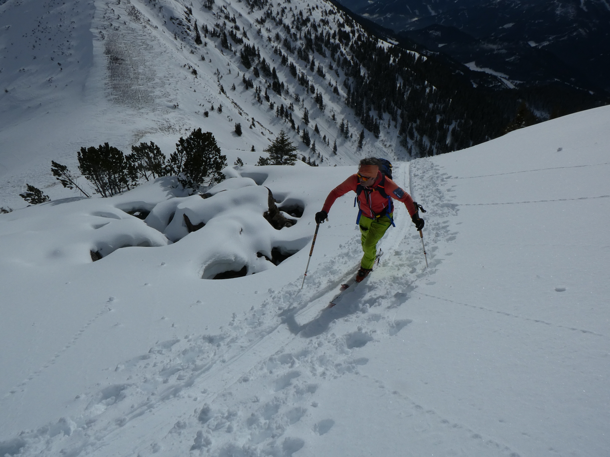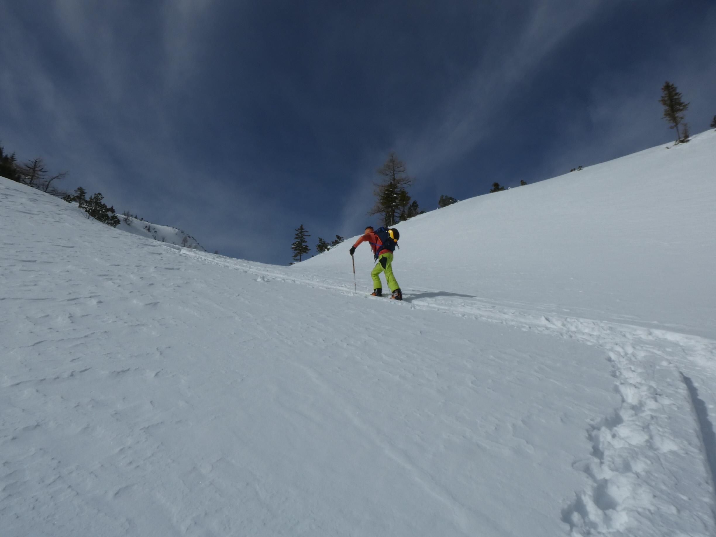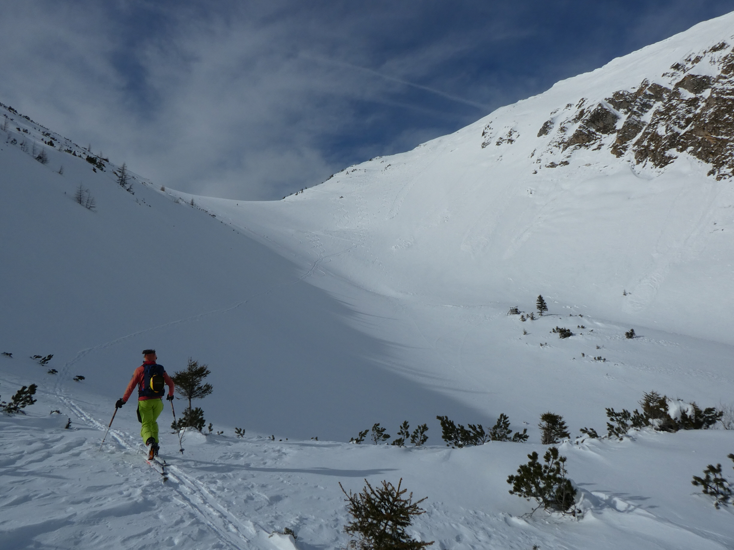 Dann sind wir in einer langen ansteigenden Linie ins Kar hinein und in einer ganz langen Kehre in den Sattel zwischen Lahnerleitenspitze und Speikkogel angestiegen. Dabei gab es genug Gelegenheit, die spätere Abfahrtlinie über die Gipfelflanke zu studieren. Weil sich die Schneedecke seit dem Niederschlagsereignis – wie wir schon bei Passagen im Seekar erkennen konnten – besonders an den Südseiten sehr gut gesetzt hatte, haben wir uns für eine bis dahin unbefahrene Fläche orografisch links eines langen Neuschneerutsches entschieden.