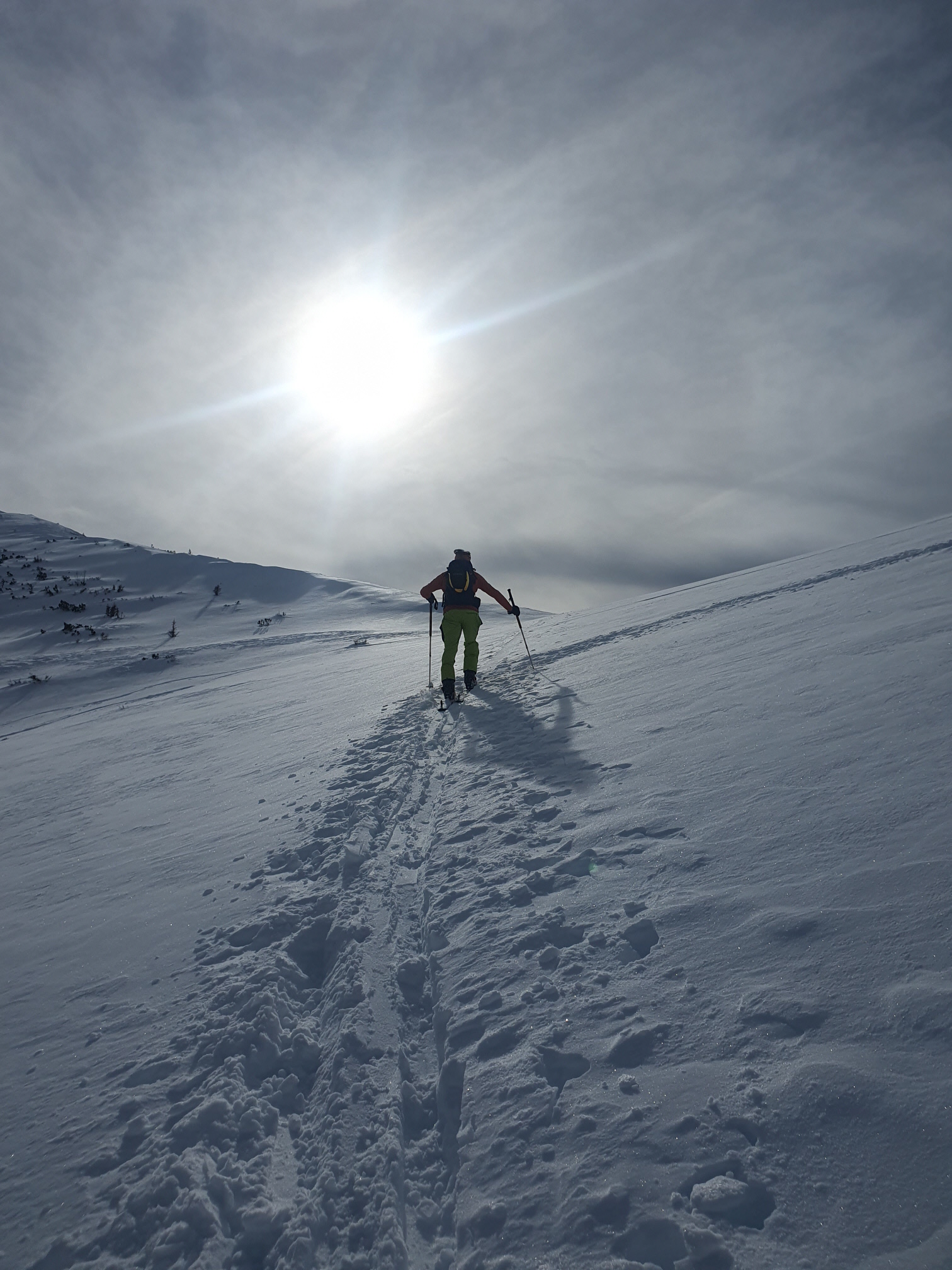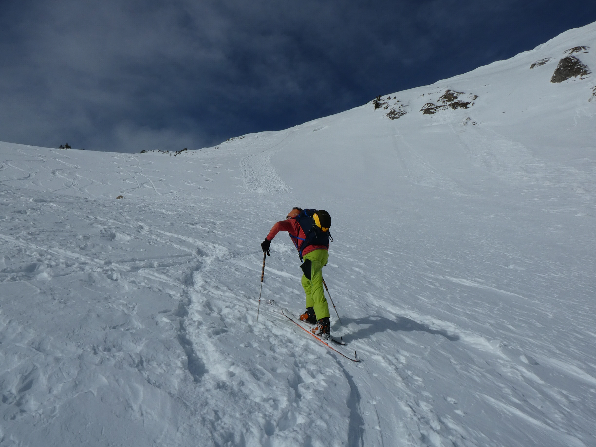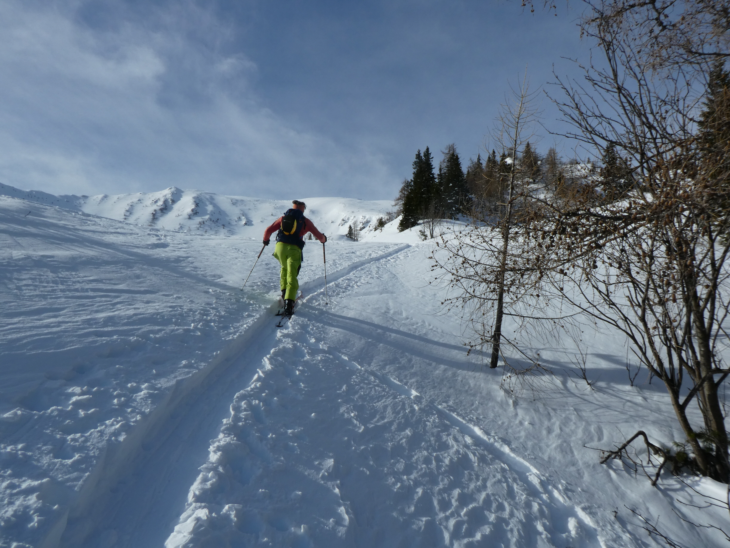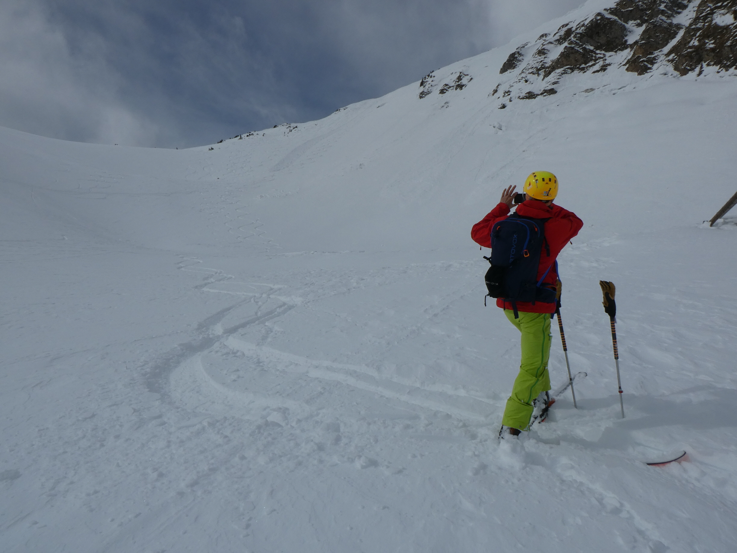 Dann sind wir in einer langen ansteigenden Linie ins Kar hinein und in einer ganz langen Kehre in den Sattel zwischen Lahnerleitenspitze und Speikkogel angestiegen. Dabei gab es genug Gelegenheit, die spätere Abfahrtlinie über die Gipfelflanke zu studieren. Weil sich die Schneedecke seit dem Niederschlagsereignis – wie wir schon bei Passagen im Seekar erkennen konnten – besonders an den Südseiten sehr gut gesetzt hatte, haben wir uns für eine bis dahin unbefahrene Fläche orografisch links eines langen Neuschneerutsches entschieden.