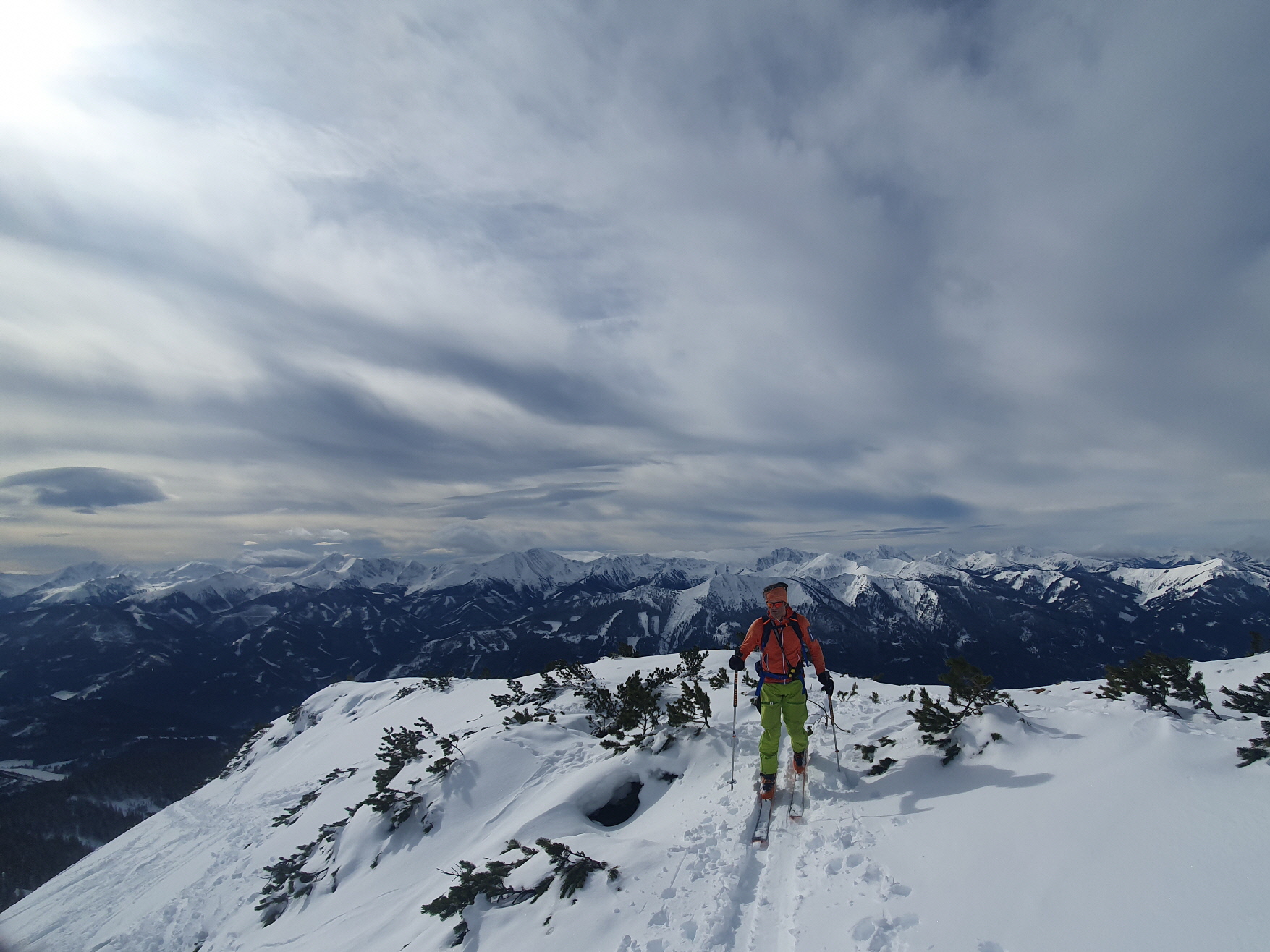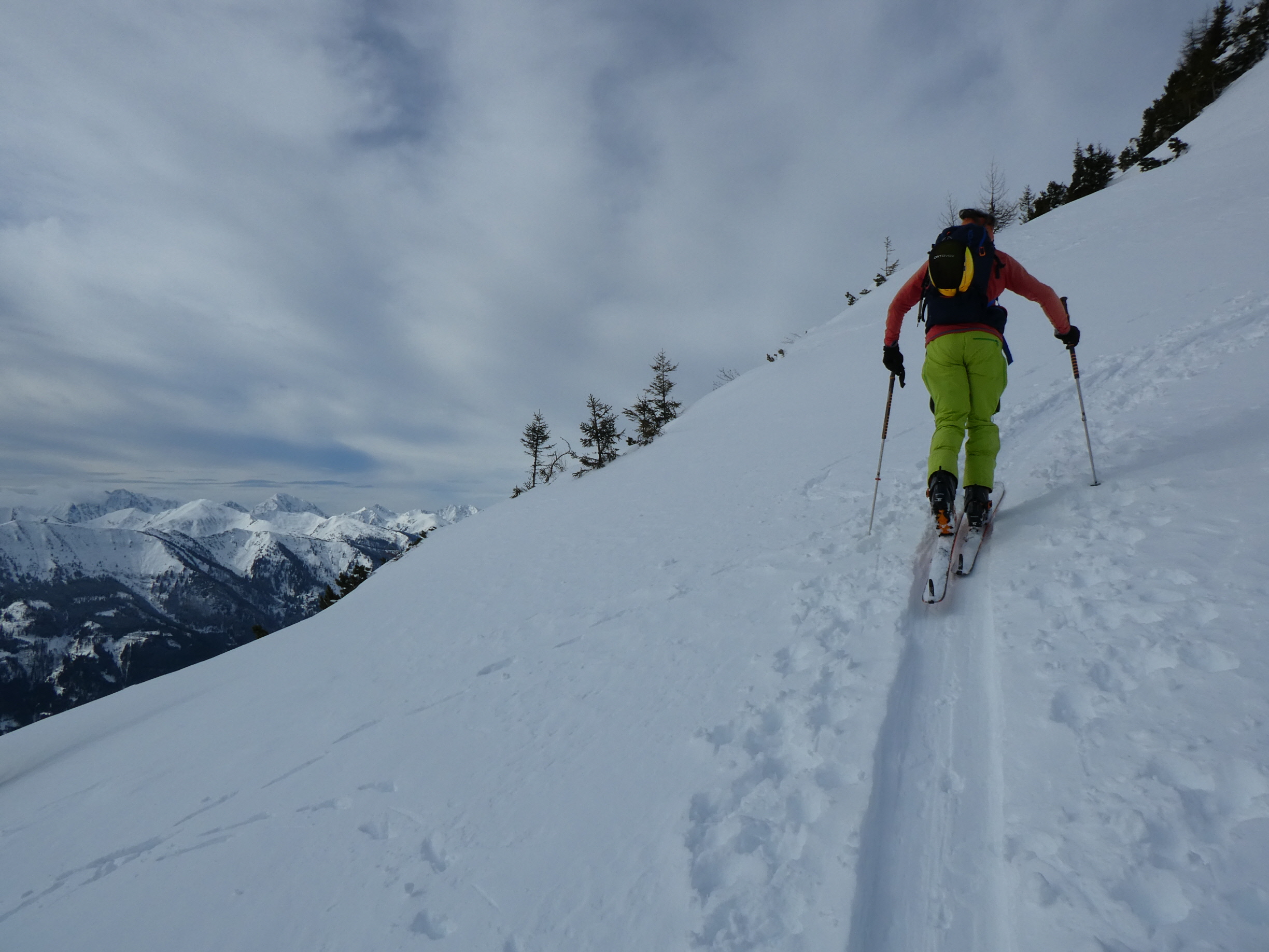 In einigen steileren Kehren ging es dann weiter hinauf. Dabei besticht immer wieder der Tiefblick ins Paltental und der Fernblick in die Niederen Tauern, über die sich mit entsprechender Bewölkung die herannahende Front angekündigt hat. Das war dann auch die Bestätigung für uns, das Tourenziel entgegen ursprünglicher Überlegung nicht dort angesiedelt zu haben.