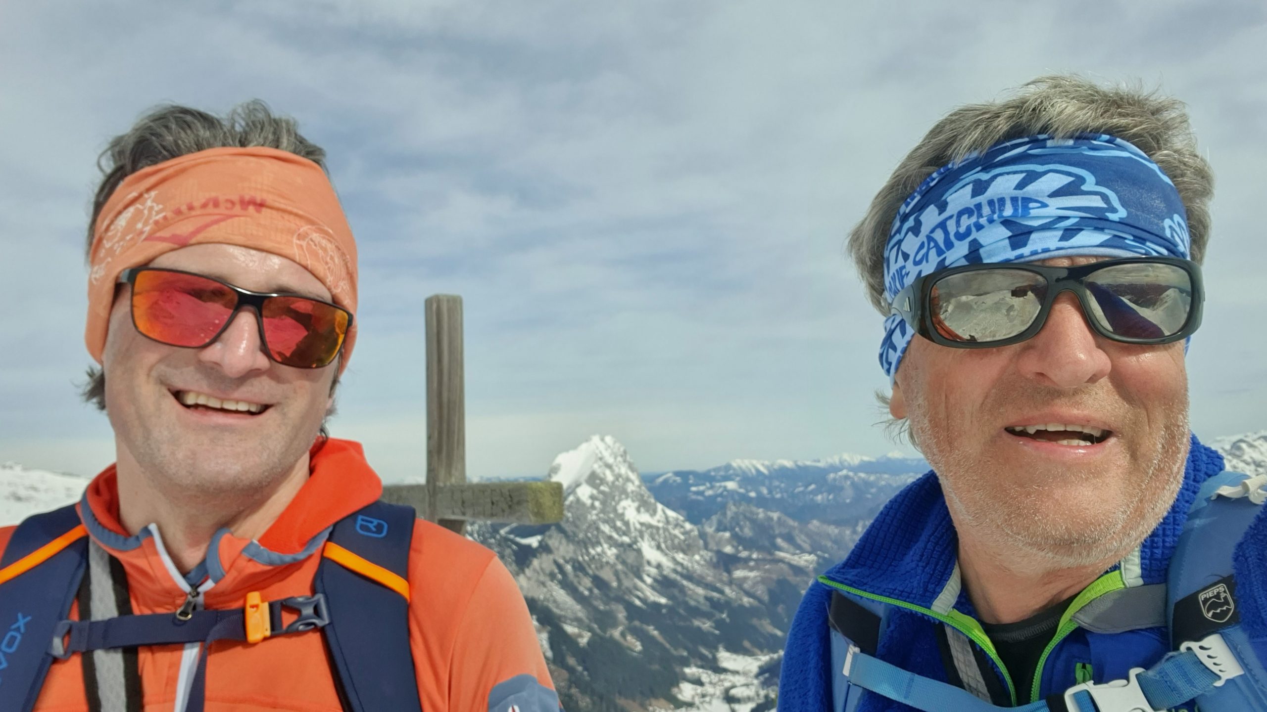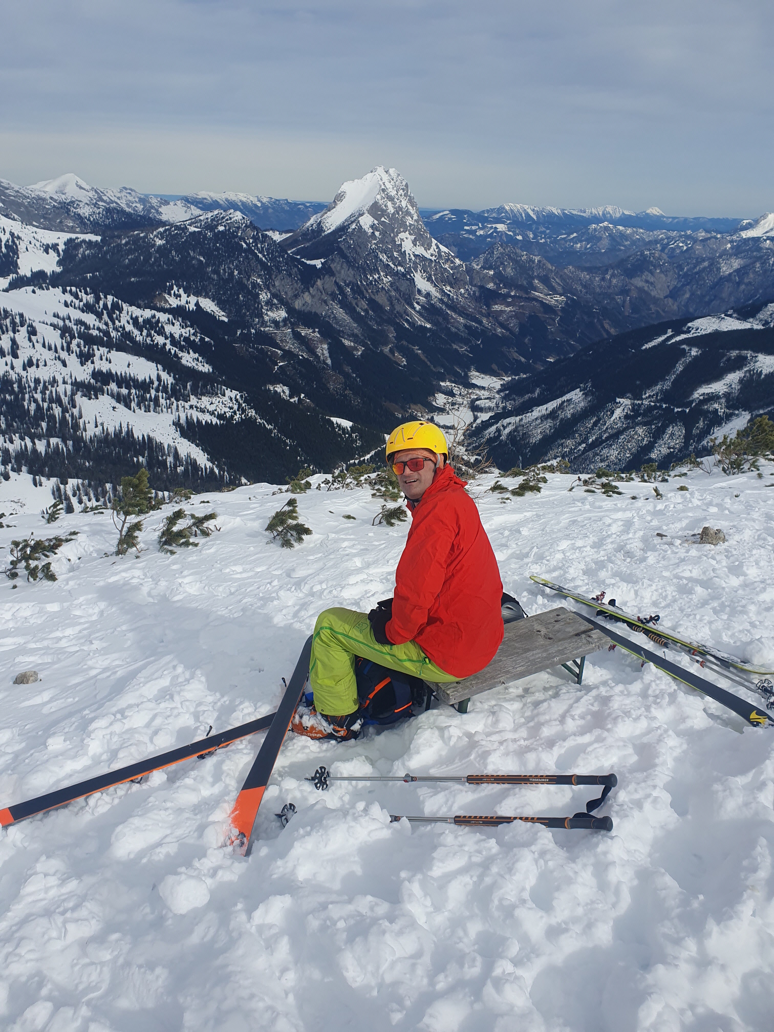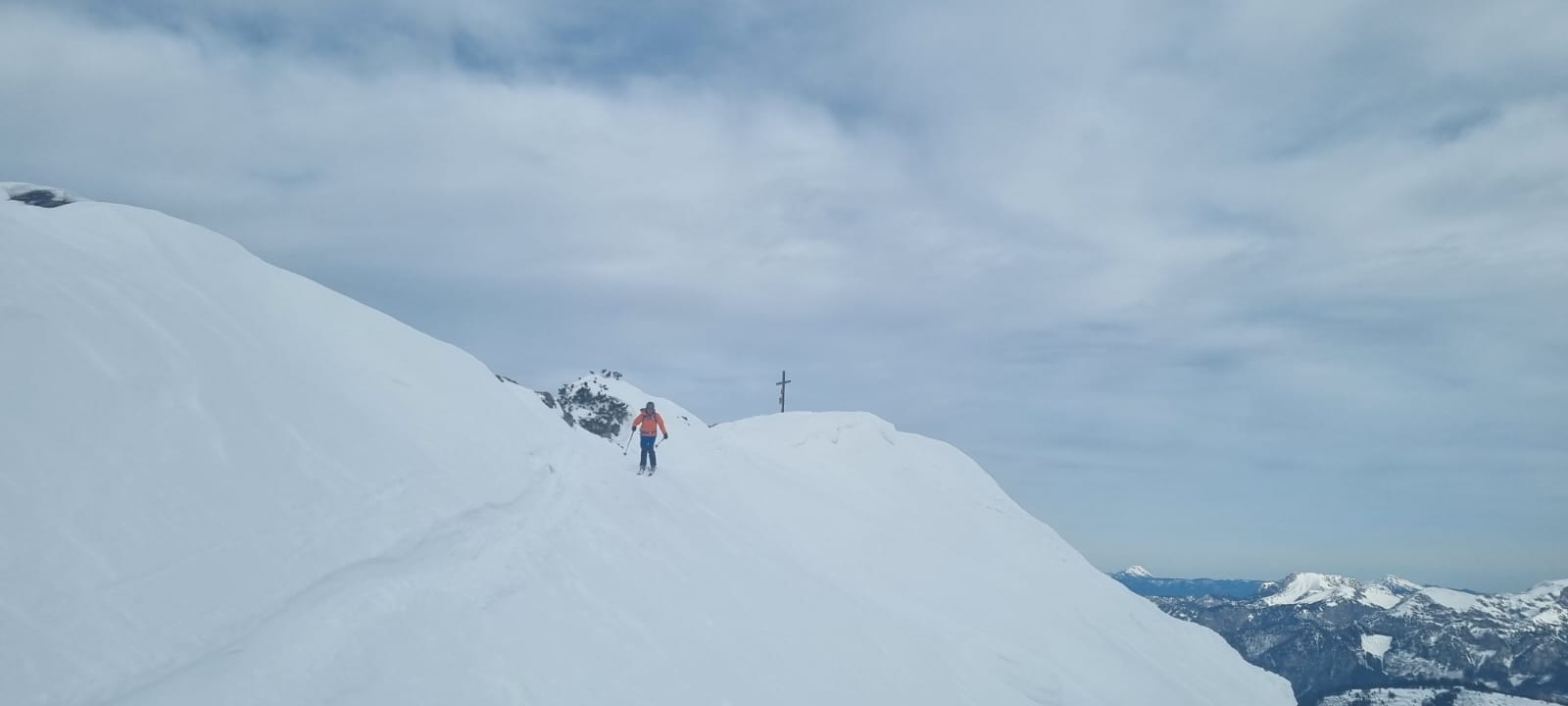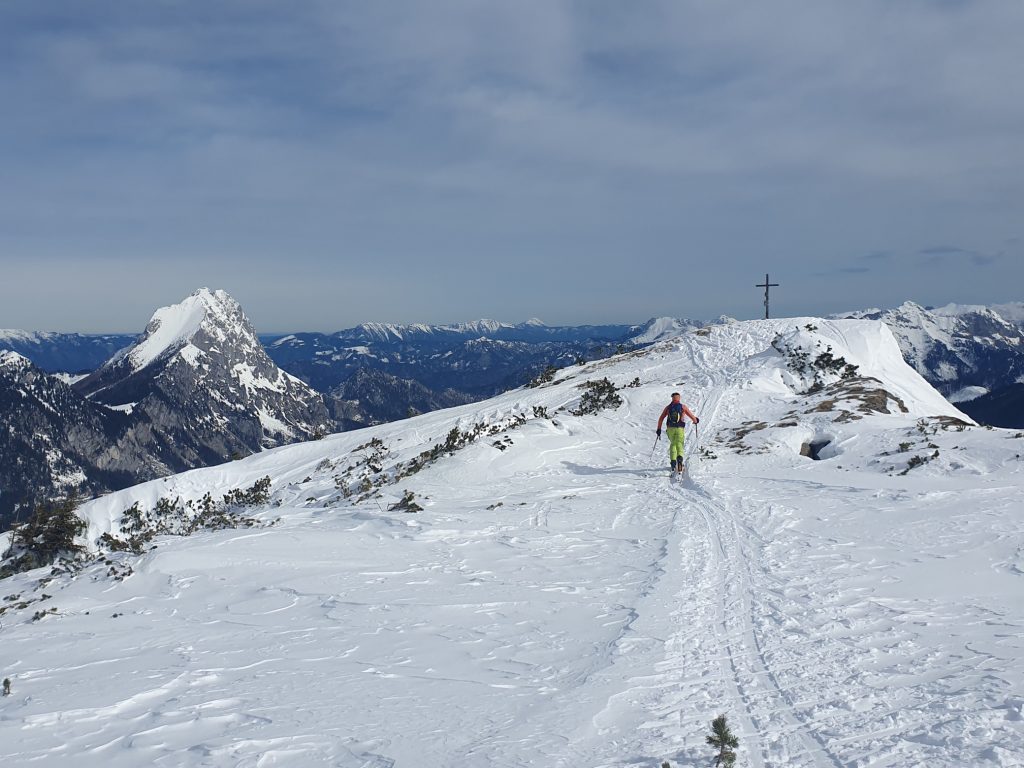 Die Schneebrücken über die im kammnahen Bereich sehr hohen Latschen haben gut gehalten und nach einer Aufstiegszeit von 3 Std 10 min (mit Pause) sind wir über die letzten flachen Meter zum Gipfelkreuz mit dem „Steirischen Matterhorn“, dem Lugauer im Hintergrund hinüber gewandert. Zu diesem Zeitpunkt hat im Gipfelbereich der Wind etwas aufgefrischt. Wir haben daher die Gipfelrast auf der sehr bequemen Holzbank etwas unterhalb des Kreuzes eher kurz gehalten.