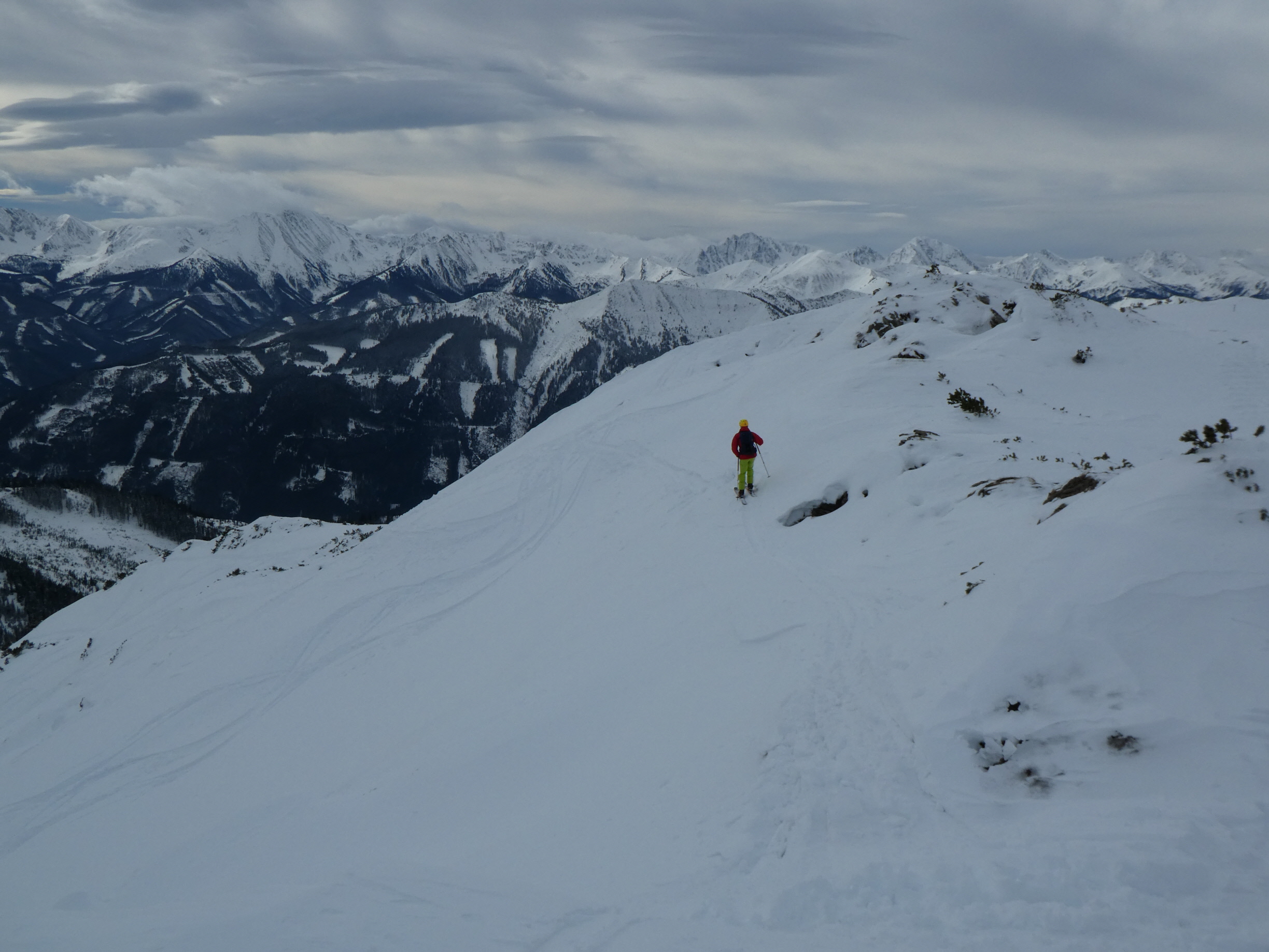Einige etwas verblasene Flächen am Weg hin zur Rotwand waren dann auch schnell passiert. Bevor wir die wenigen Meter Gegensteigung hinauf zur Einfahrt in die breite Rinne unterhalb der Rotwand hinaufgestaffelt sind, haben wir uns aber noch einmal umgedreht und genussvoll auf die bis dahin absolvierten Abfahrtsmeter zurückgeblickt.