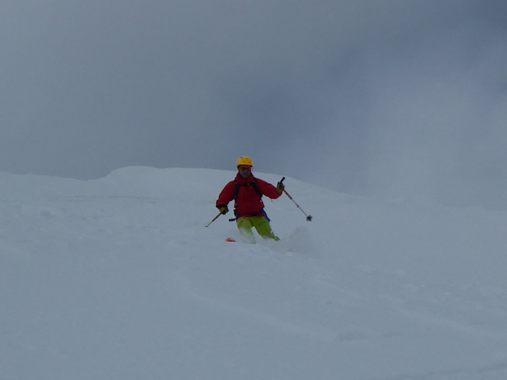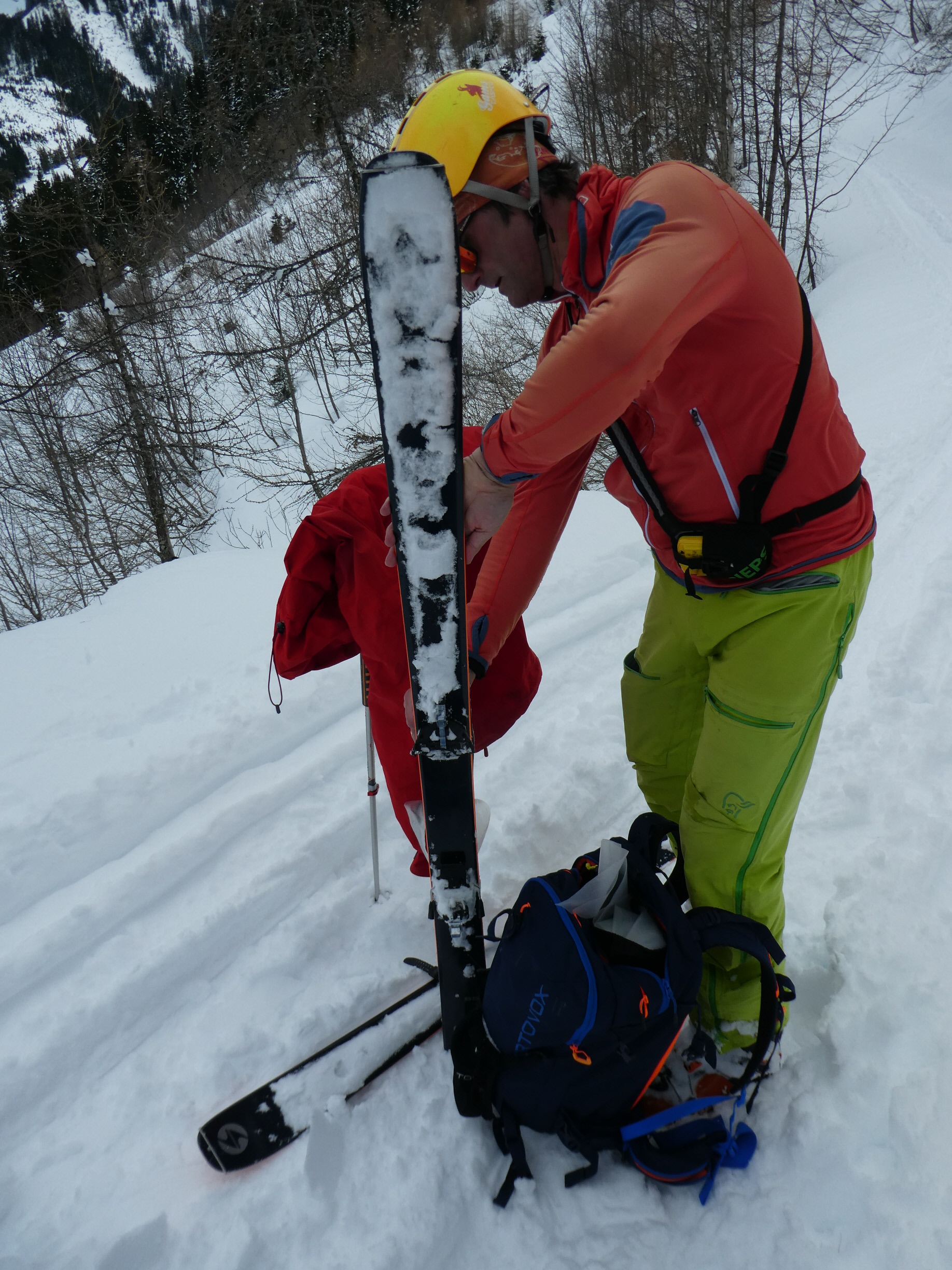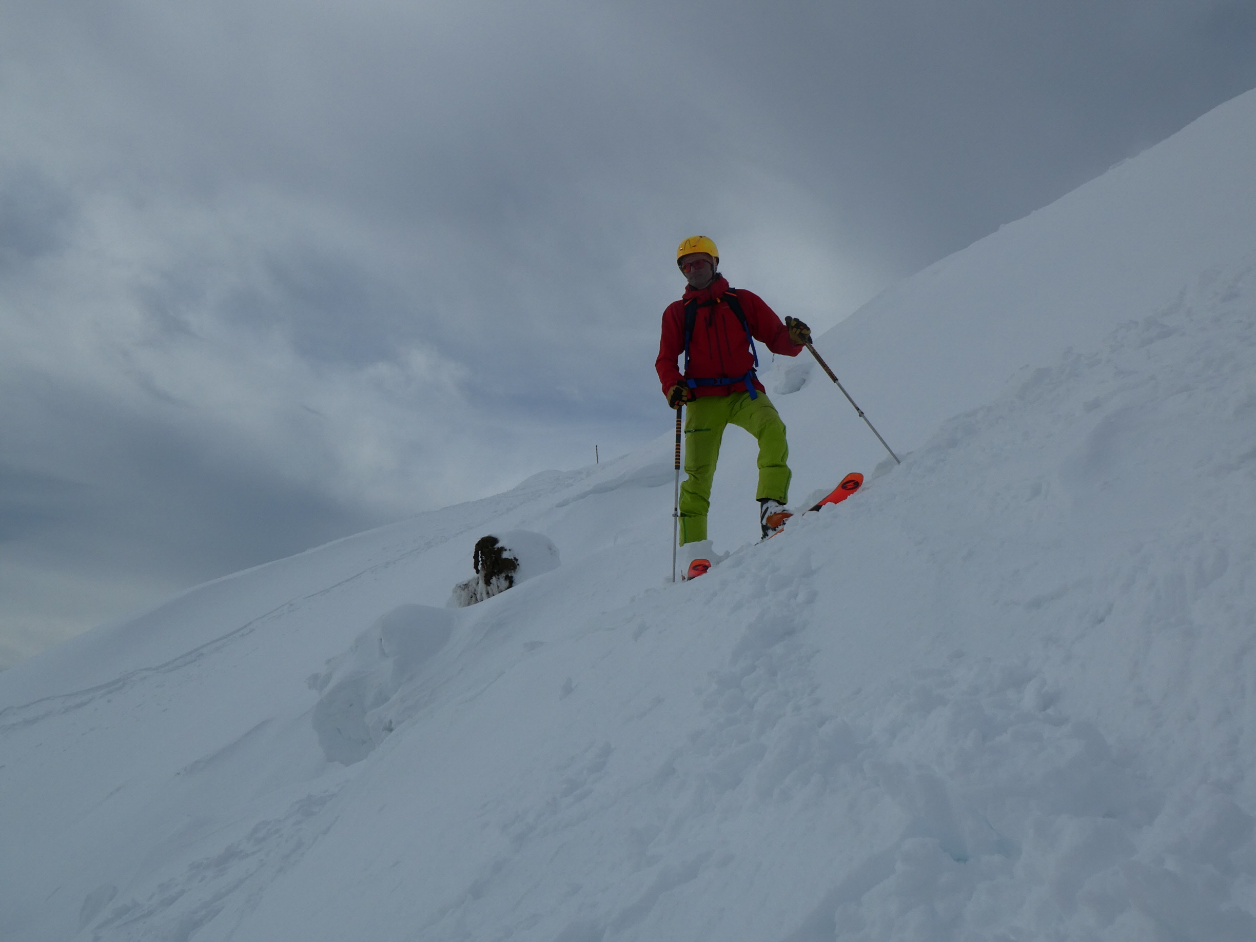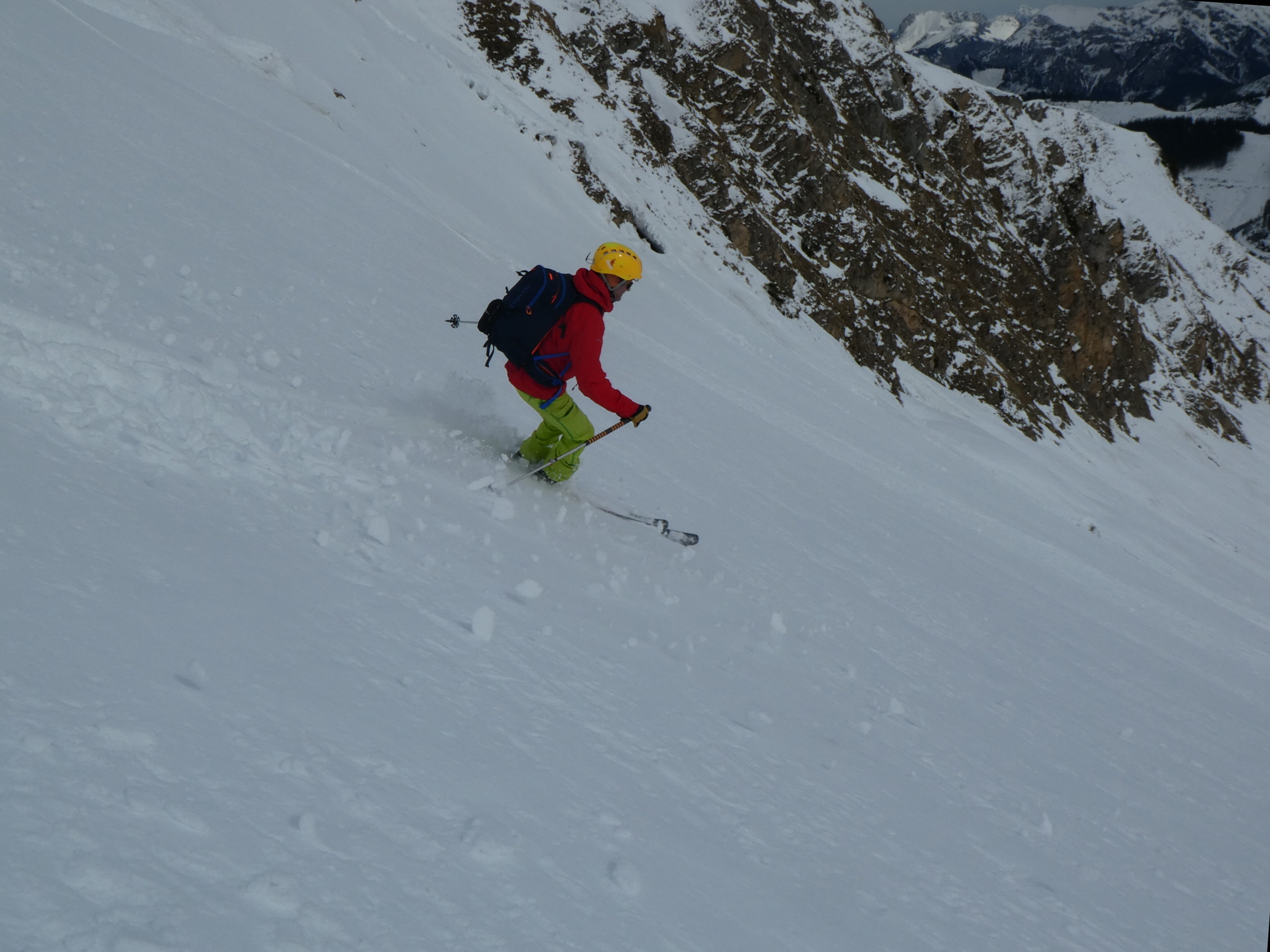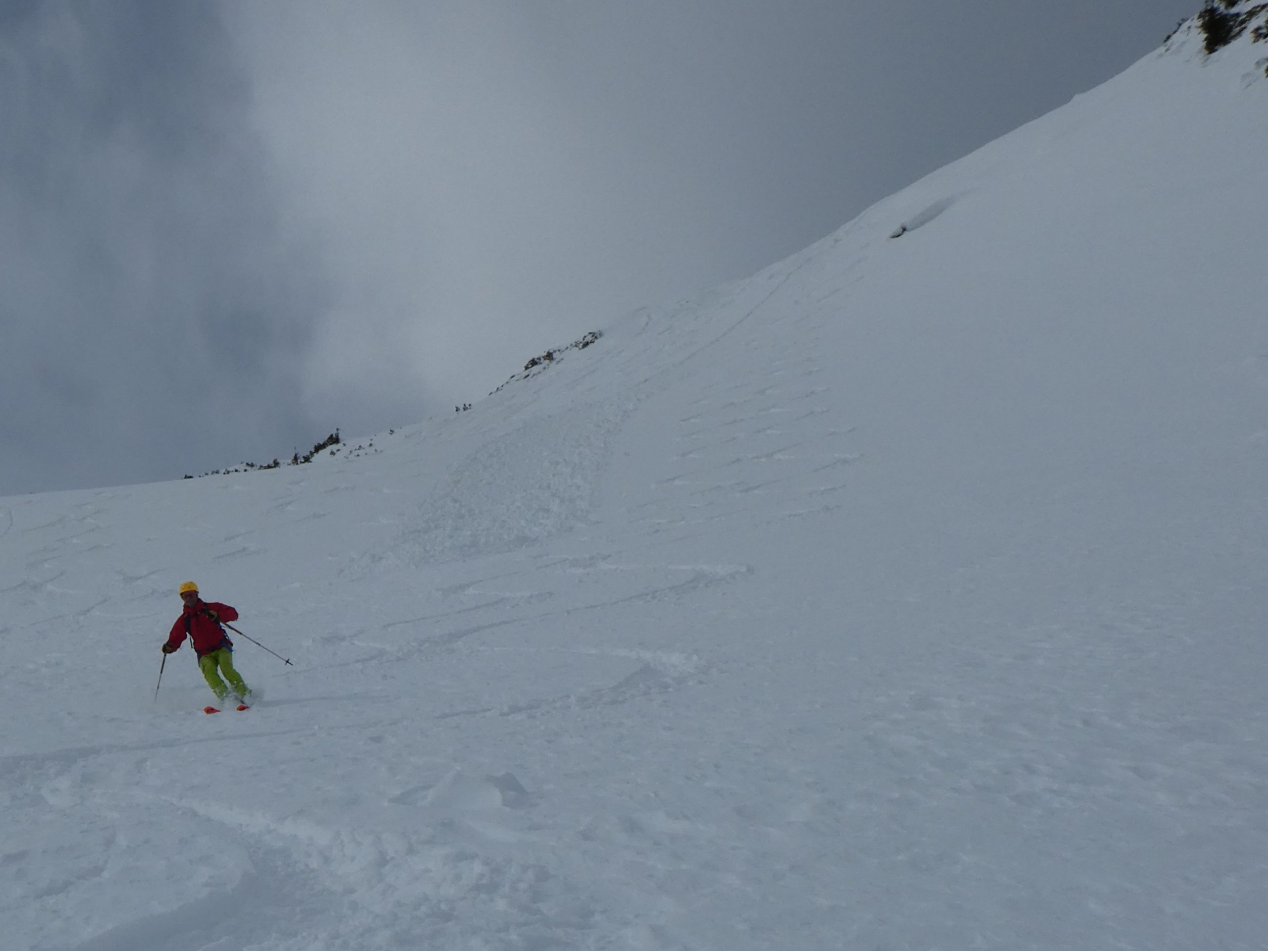 Nach dem Umrüsten für die Abfahrt sind wir direkt vom Gipfelkreuz in die Flanke eingefahren. Die ersten Schwünge haben gezeigt, dass unsere Einschätzung richtig war. Den zerspurten Bereich rechts liegen lassend haben wir die Lawinenbahn gequert und im unverspurten Teil der Gipfelflanke unsere Spuren gezogen. Bis weit hinunter ins Kar war der Schnee bestens fahrbar.