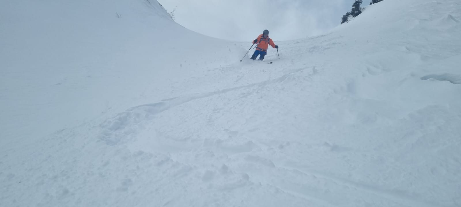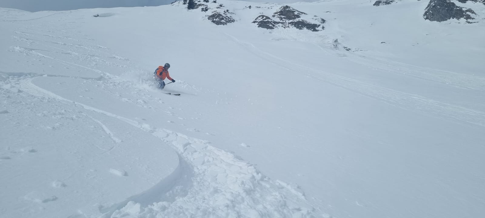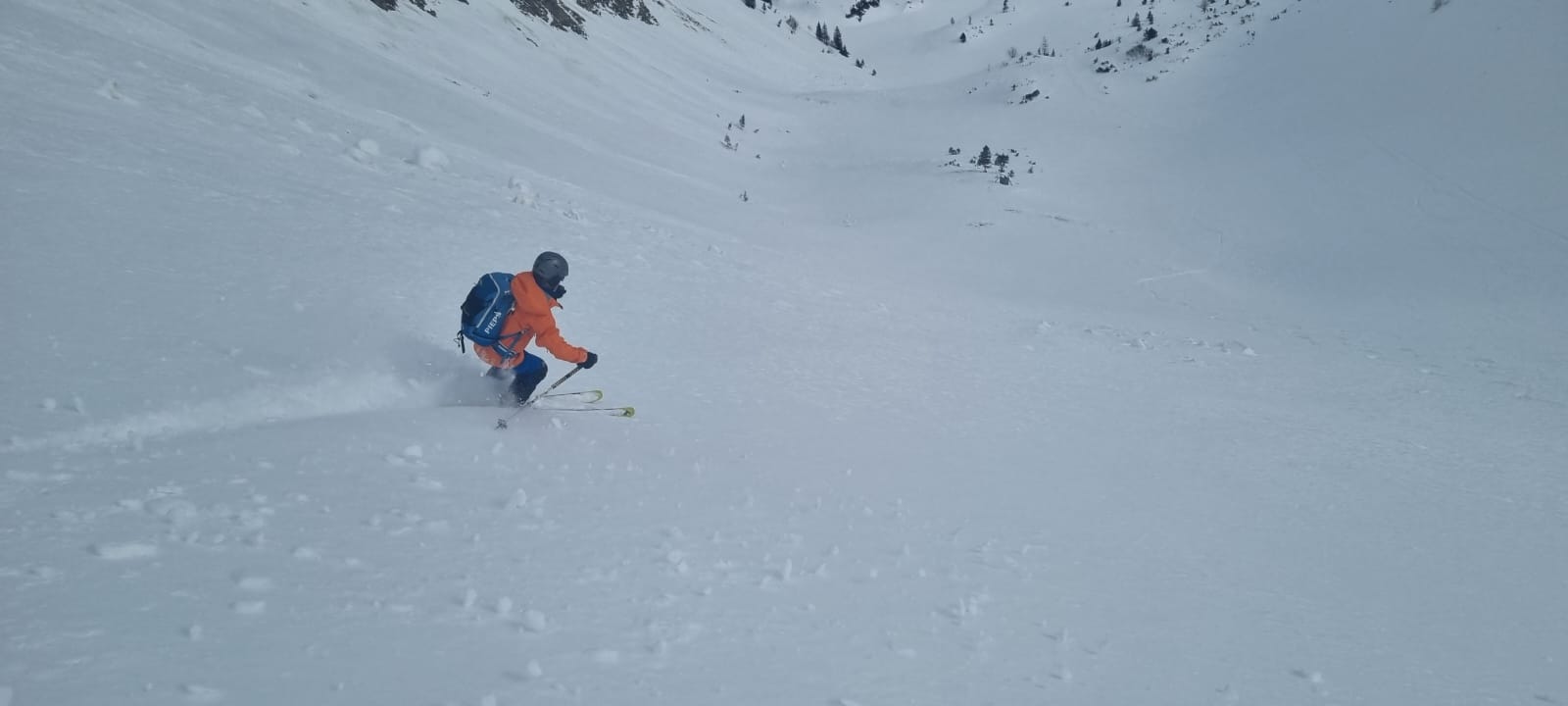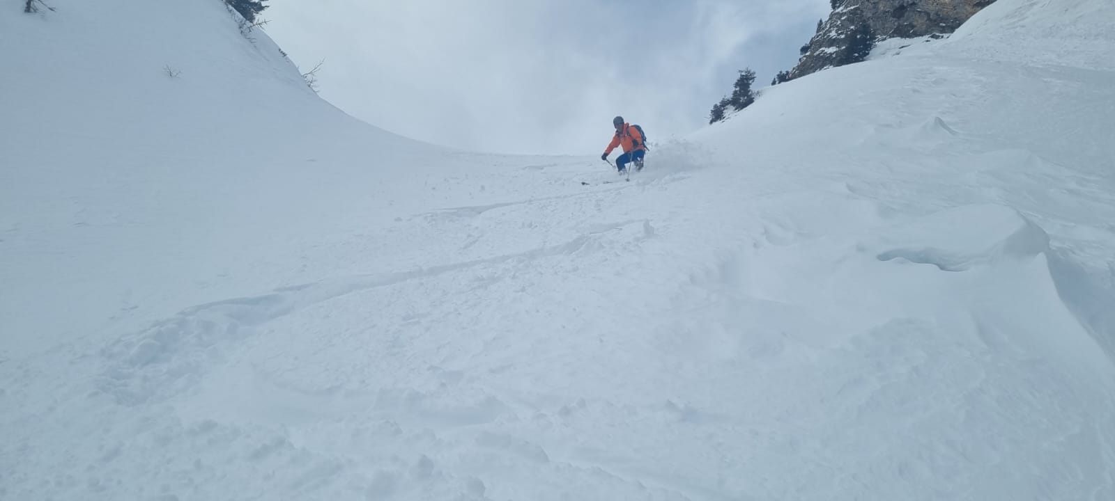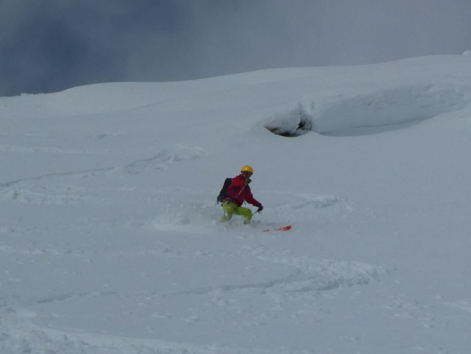Nach dem Umrüsten für die Abfahrt sind wir direkt vom Gipfelkreuz in die Flanke eingefahren. Die ersten Schwünge haben gezeigt, dass unsere Einschätzung richtig war. Den zerspurten Bereich rechts liegen lassend haben wir die Lawinenbahn gequert und im unverspurten Teil der Gipfelflanke unsere Spuren gezogen. Bis weit hinunter ins Kar war der Schnee bestens fahrbar.