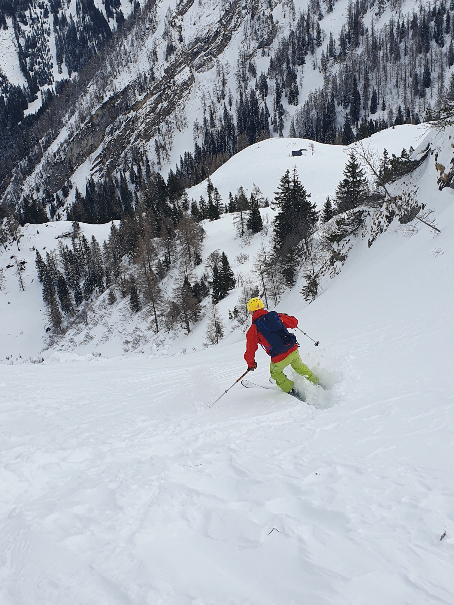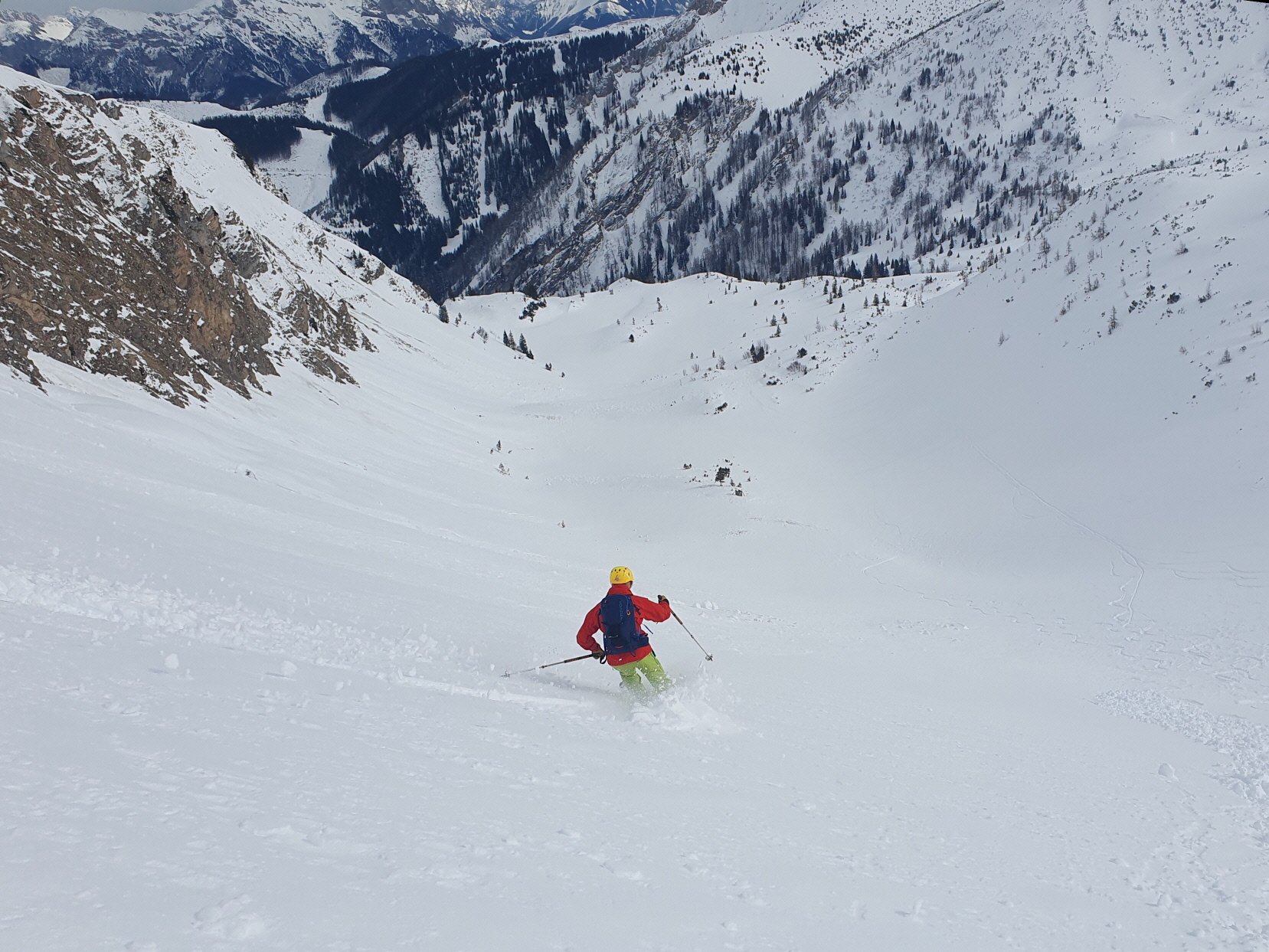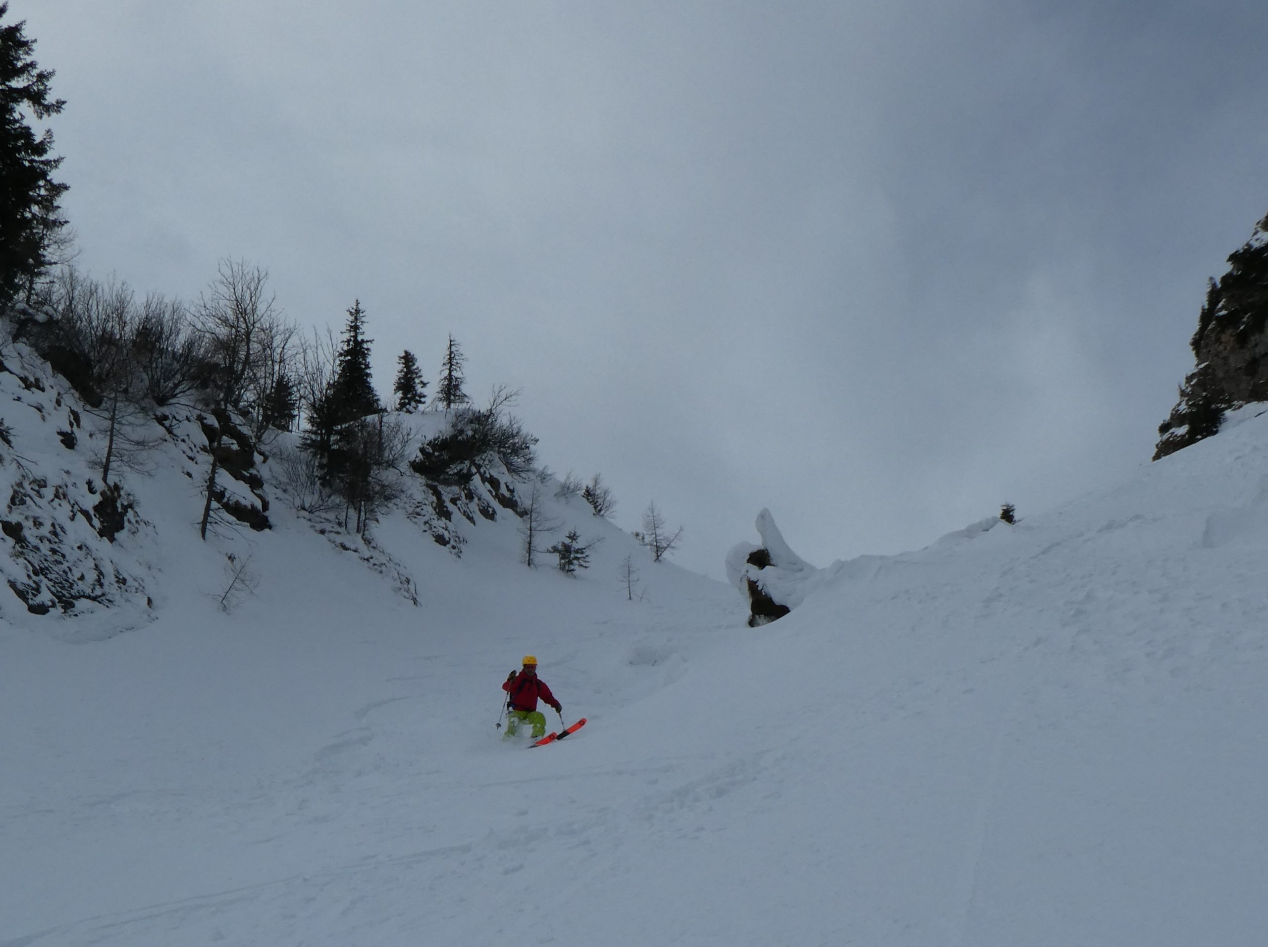 Der Einfahrtsbereich in die Rinne mit dem Tiefblick zur Seekaralm war auch noch etwas windgepresst. Mit abnehmender Höhe war der Pulverschnee aber perfekt fahrbar. Darin die ersten Spuren zu ziehen war ein Genuss. Bis hinunter zur Abflachung über dem Lochalpl haben wir daher nicht nur einmal gejubelt.
