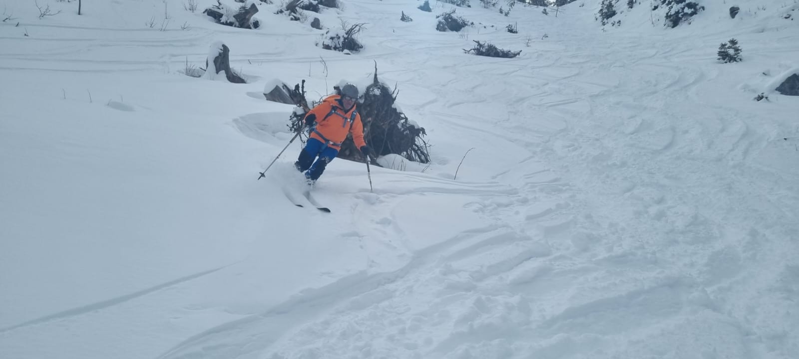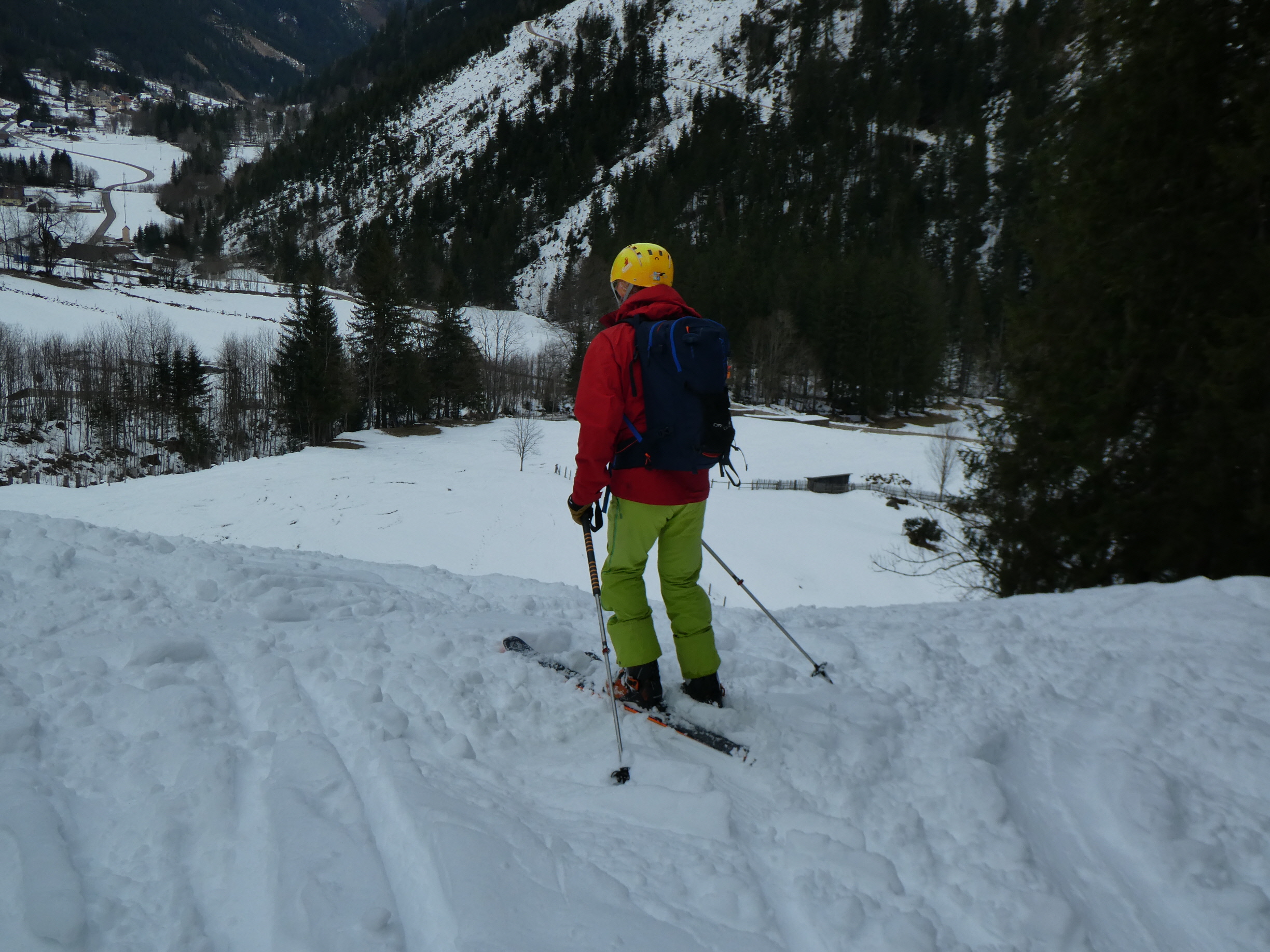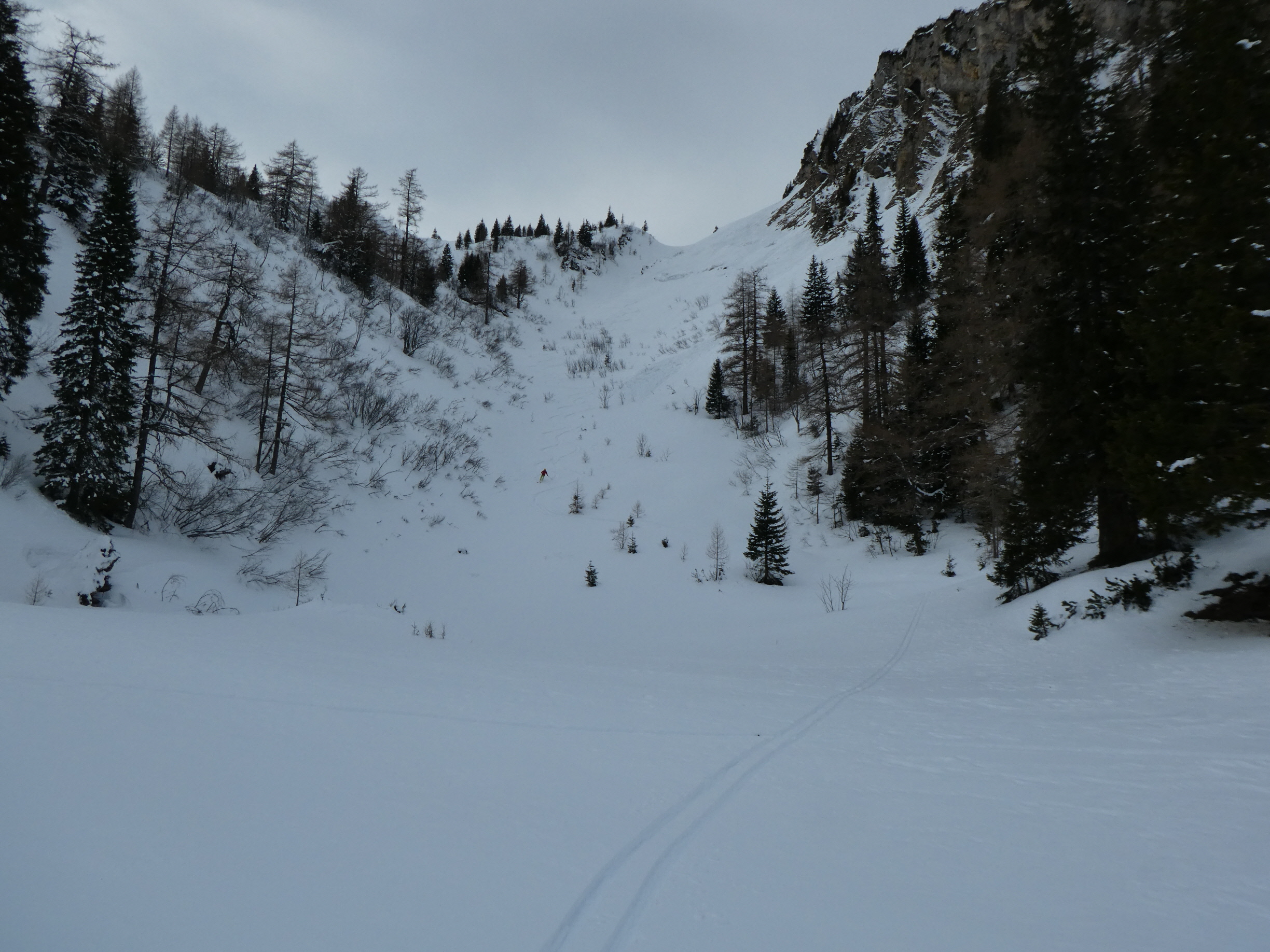 Der Einfahrtsbereich in die Rinne mit dem Tiefblick zur Seekaralm war auch noch etwas windgepresst. Mit abnehmender Höhe war der Pulverschnee aber perfekt fahrbar. Darin die ersten Spuren zu ziehen war ein Genuss. Bis hinunter zur Abflachung über dem Lochalpl haben wir daher nicht nur einmal gejubelt.