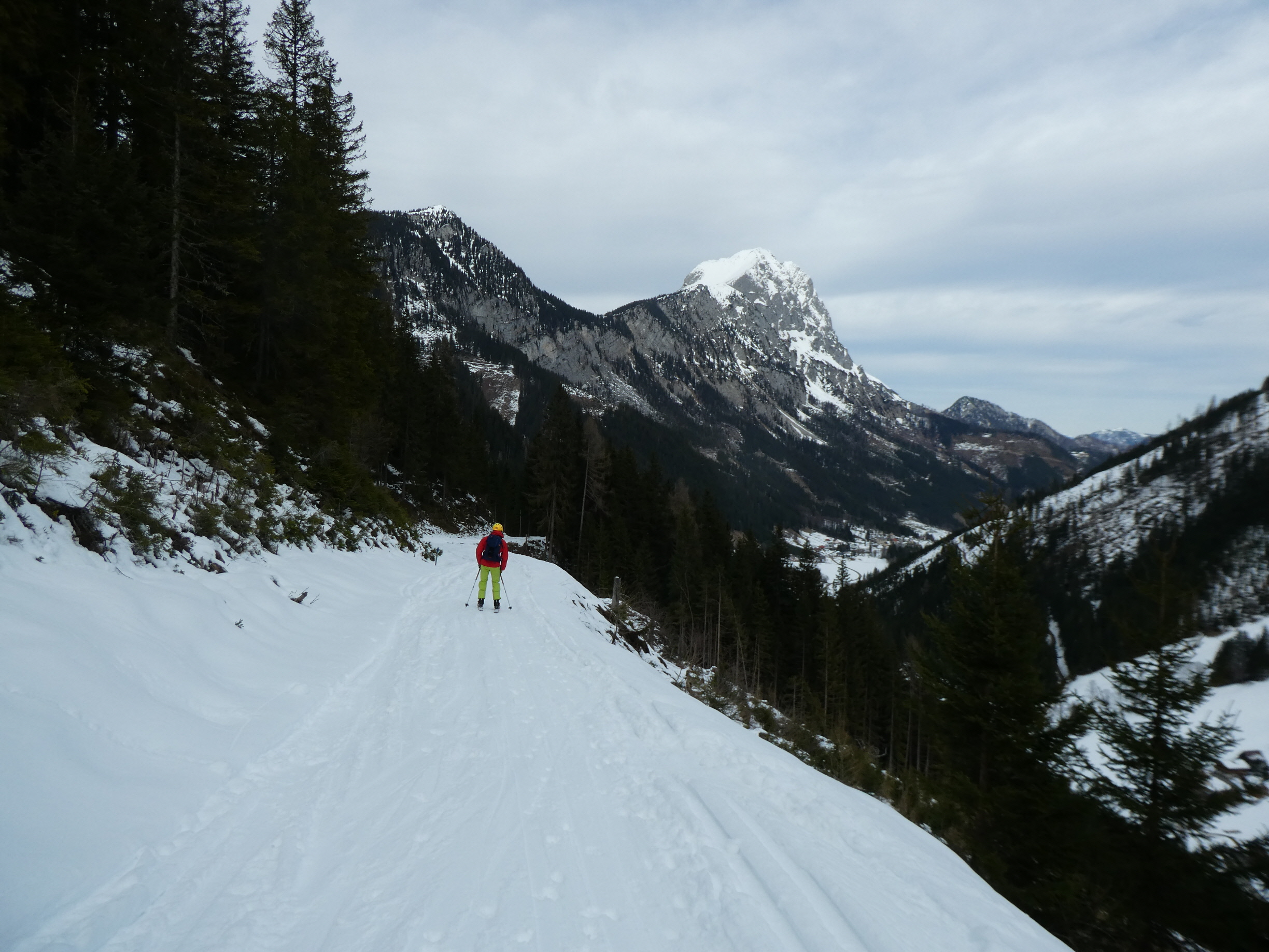 Ab der kleinen Hütte am Fuße der Geländestufe war dann nur mehr Abfahren in der ausgefahrenen Spur am Weg angesagt. Anfangs waren noch ein paar Lawinenknollen zu queren bevor es mit dem unverwechselbaren Blick zum Lugauer flott weiter abwärts ging. Am tiefsten Punkt haben wir die Felle für die 30 Hm Gegensteigung hinauf bis zur Abzweigung in Richtung Schafböden noch einmal aufgezogen. Auf halbem Weg war dabei abermals der heuer sehr weit offene Bach am Rand der Wechte zu umgehen.