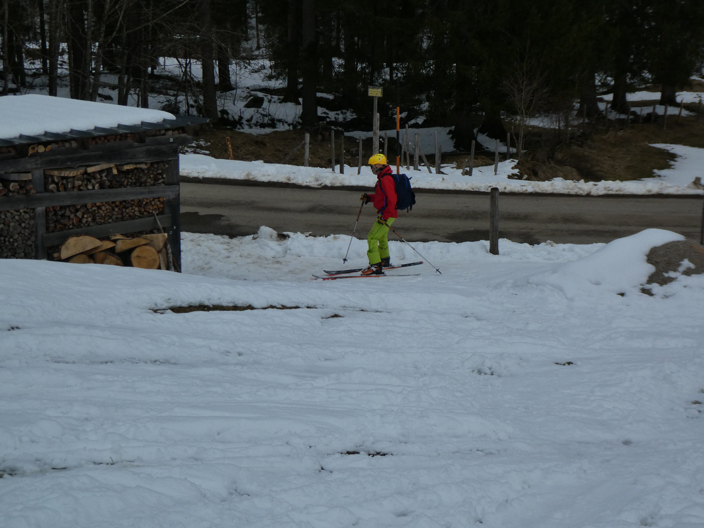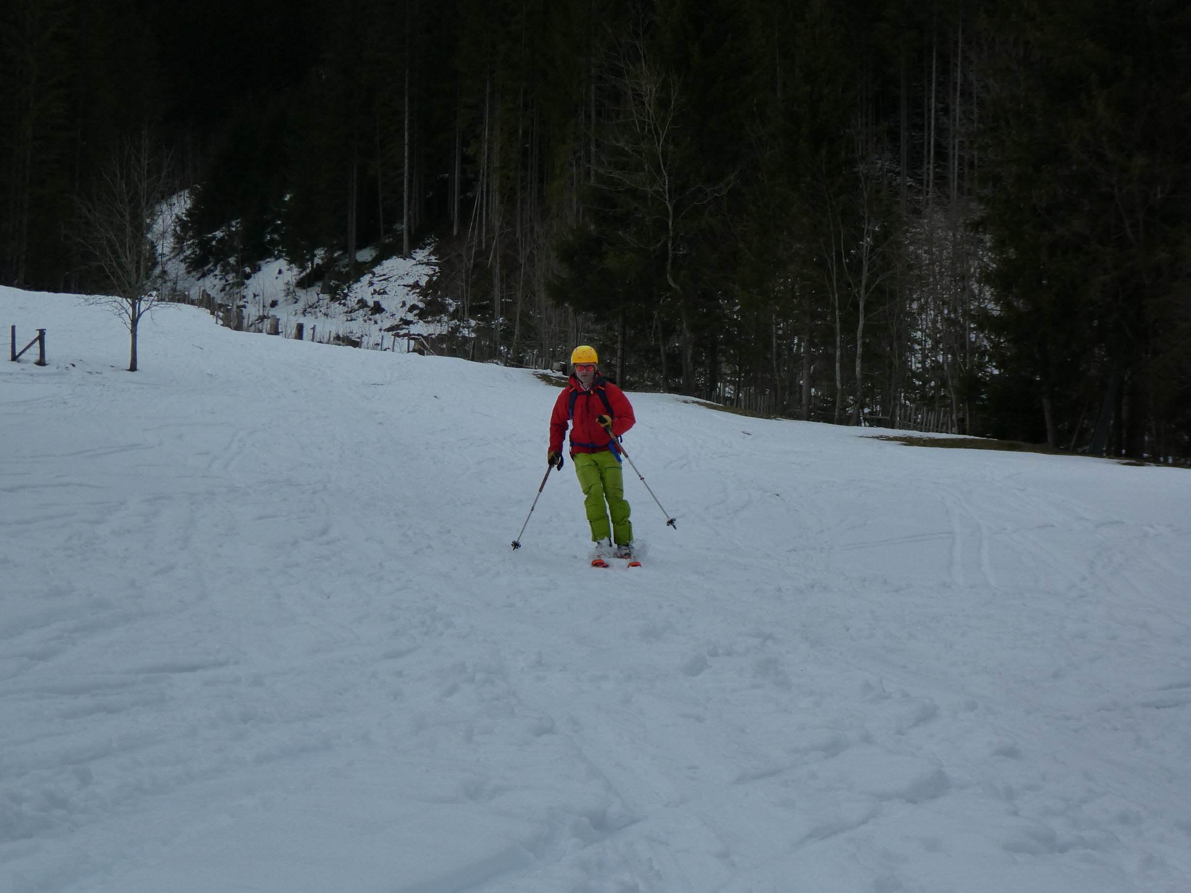 Oben angekommen sind die Felle endgültig in den Rucksack gewandert. Bei der Talabfahrt sind wir jetzt bis zur Abzweigung in den Schlusshang immer am Forstweg geblieben. Je nach Schneebeschaffenheit ist es in den eisigen Passagen flott dahin gegangen bevor uns saugender Nassschnee wieder ordentlich eingebremst hat. Den Lugauer hoch über uns dabei immer im Visier haben wir uns am Ausgangspunkt der Tour endgültig eingebremst und direkt am Straßenrand abgeschnallt.