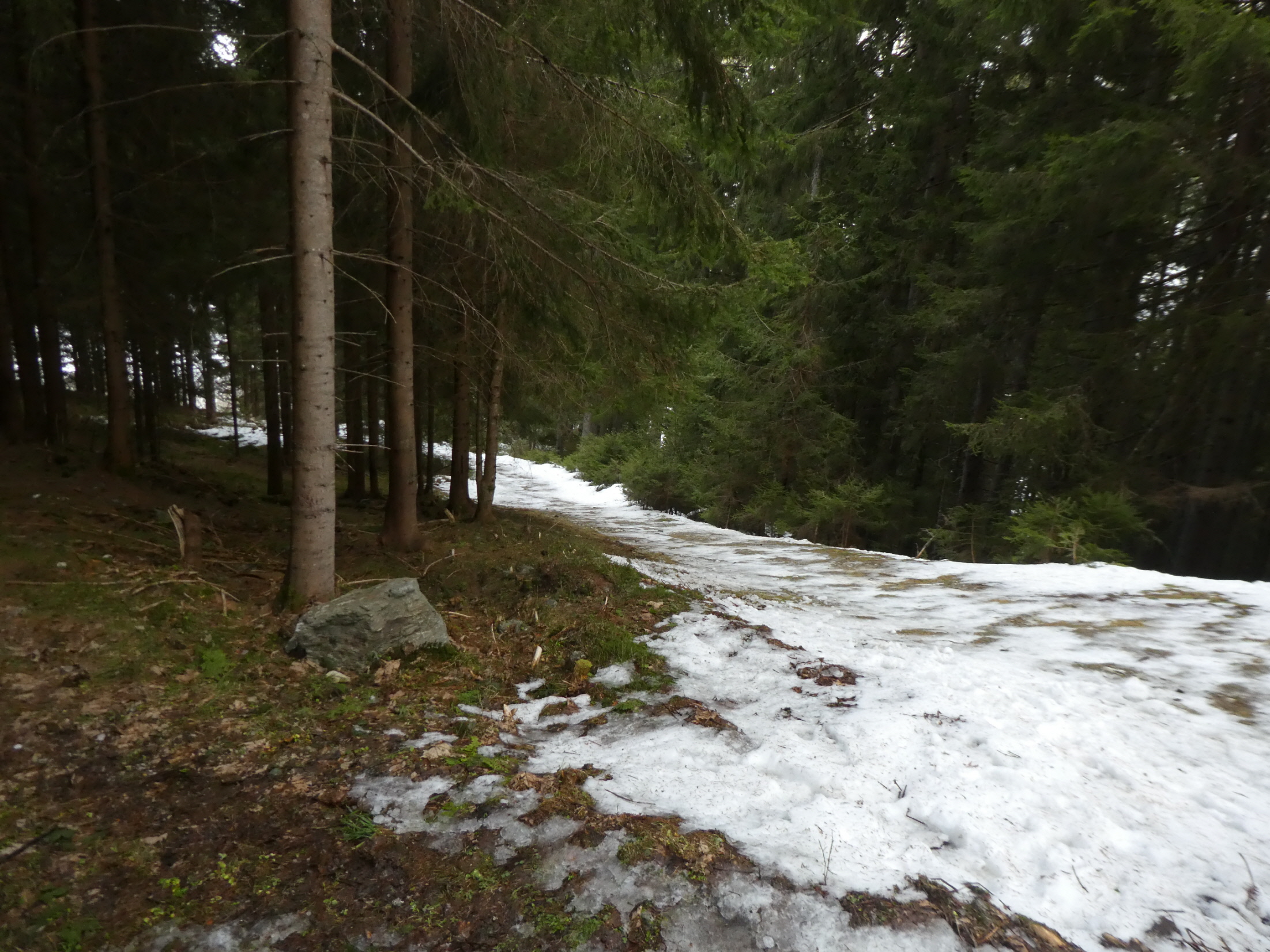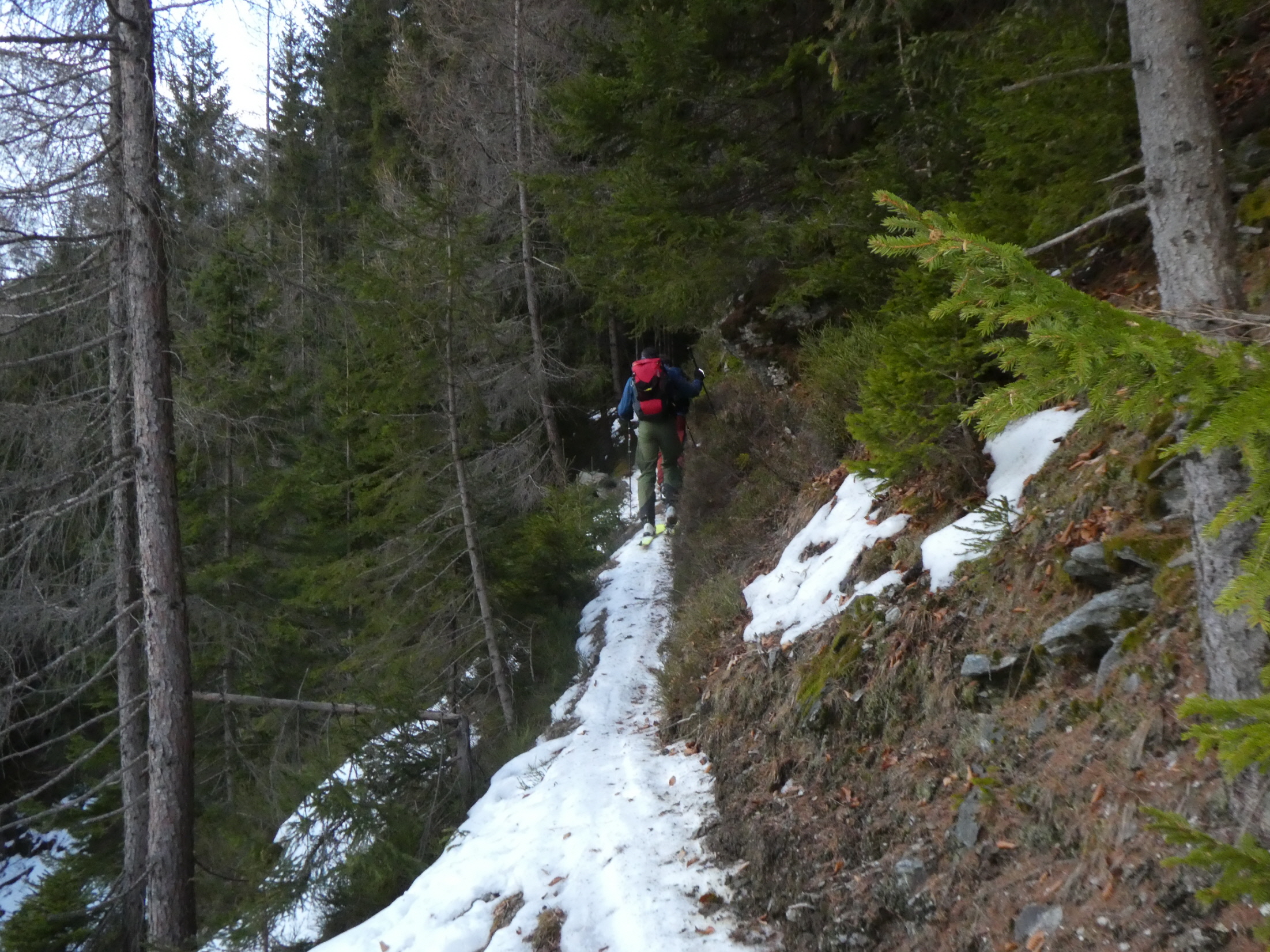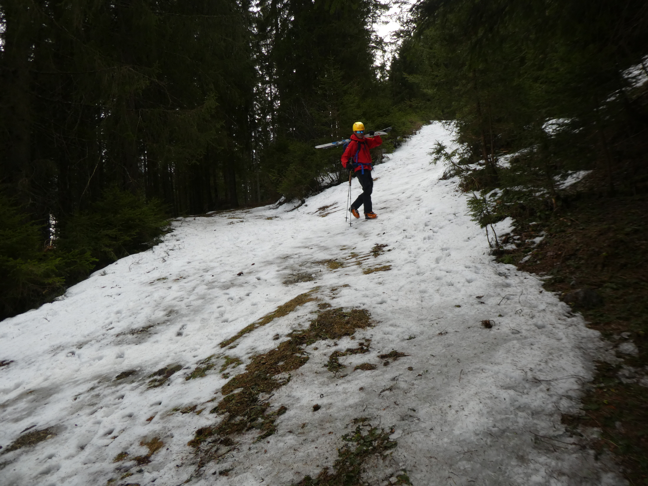 Anschließend haben wir uns in den Weg gestellt und uns – mit Ausnahme einer ganz kurzen Gegensteigung, wo es ein paar durch Stockschübe unterstützte Schritte bergauf gebraucht hat, hinuntertreiben lassen. In der schmalen Schneise zwischen Forstweg und Schlusshang haben wir dann für ein kurzes Stück sogar abgeschnallt, weil der Ausaperungsprozess gegenüber dem Anstieg in der Früh abermals Schnee weggefressen hatte.