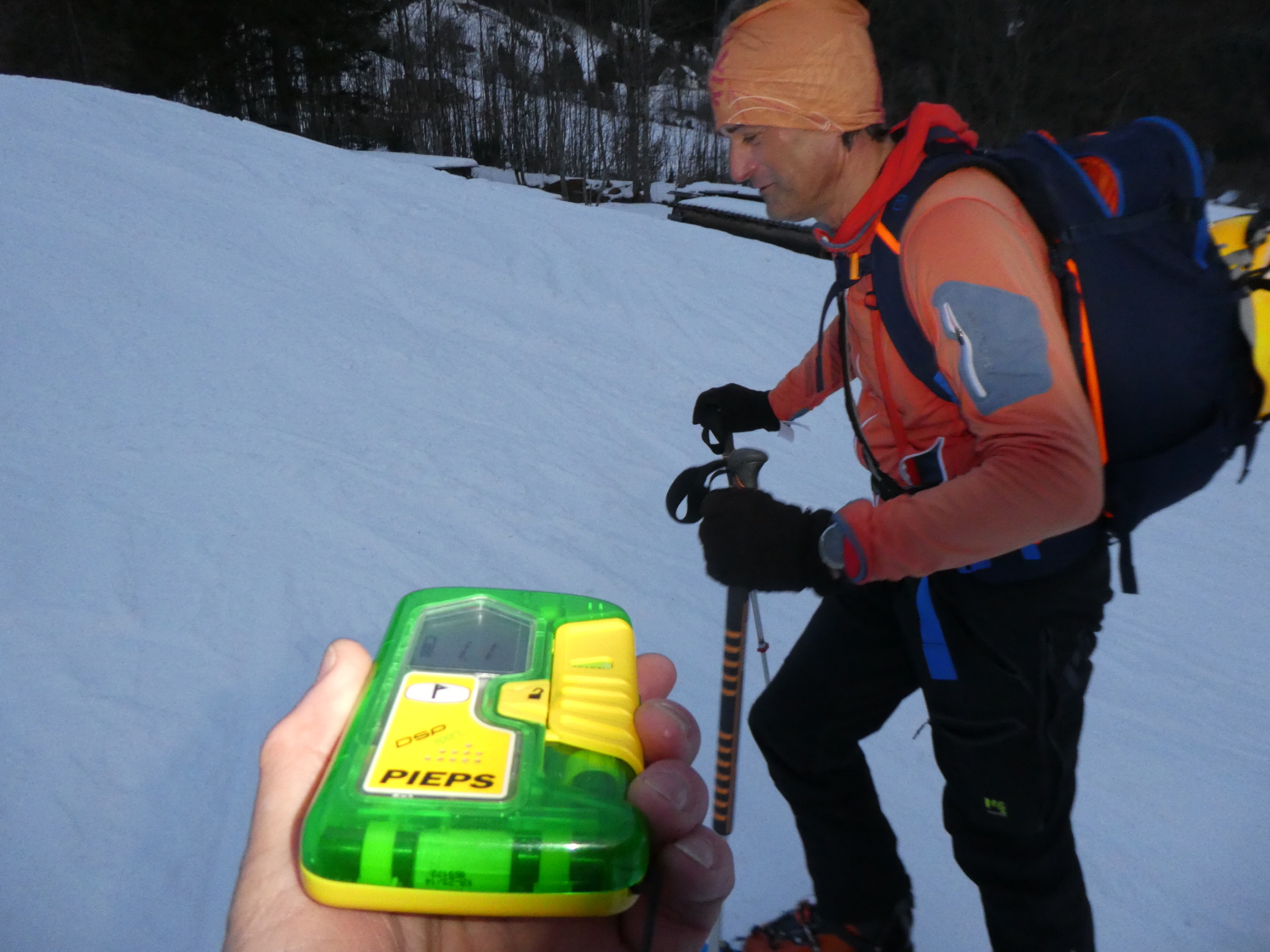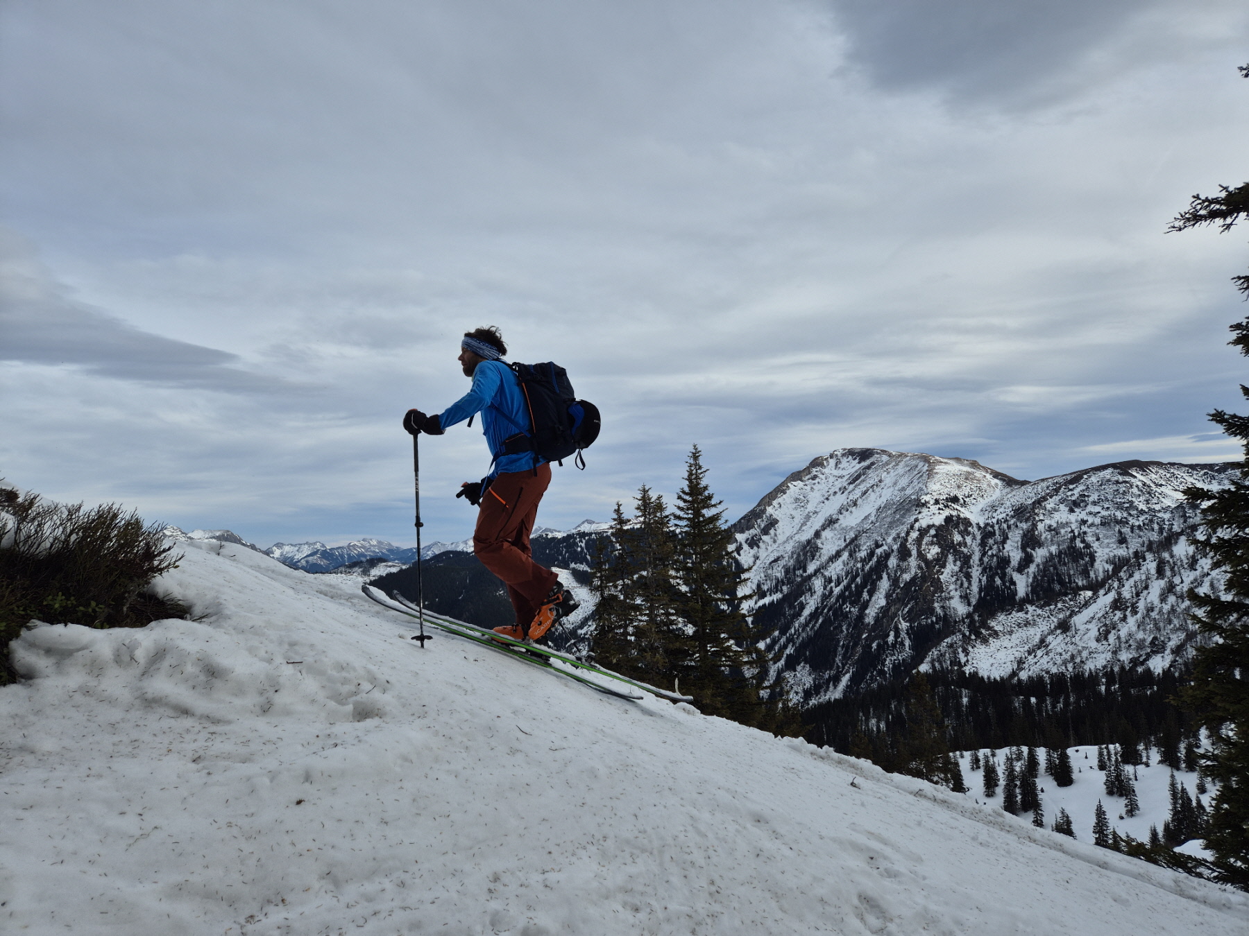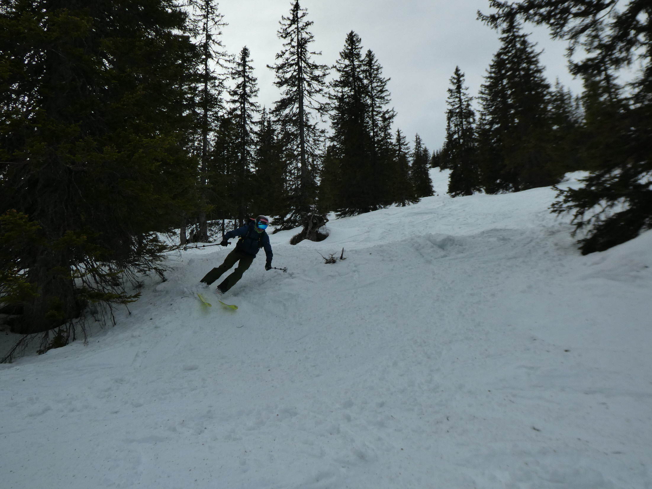 Anschließend haben wir uns in den Weg gestellt und uns – mit Ausnahme einer ganz kurzen Gegensteigung, wo es ein paar durch Stockschübe unterstützte Schritte bergauf gebraucht hat, hinuntertreiben lassen. In der schmalen Schneise zwischen Forstweg und Schlusshang haben wir dann für ein kurzes Stück sogar abgeschnallt, weil der Ausaperungsprozess gegenüber dem Anstieg in der Früh abermals Schnee weggefressen hatte.