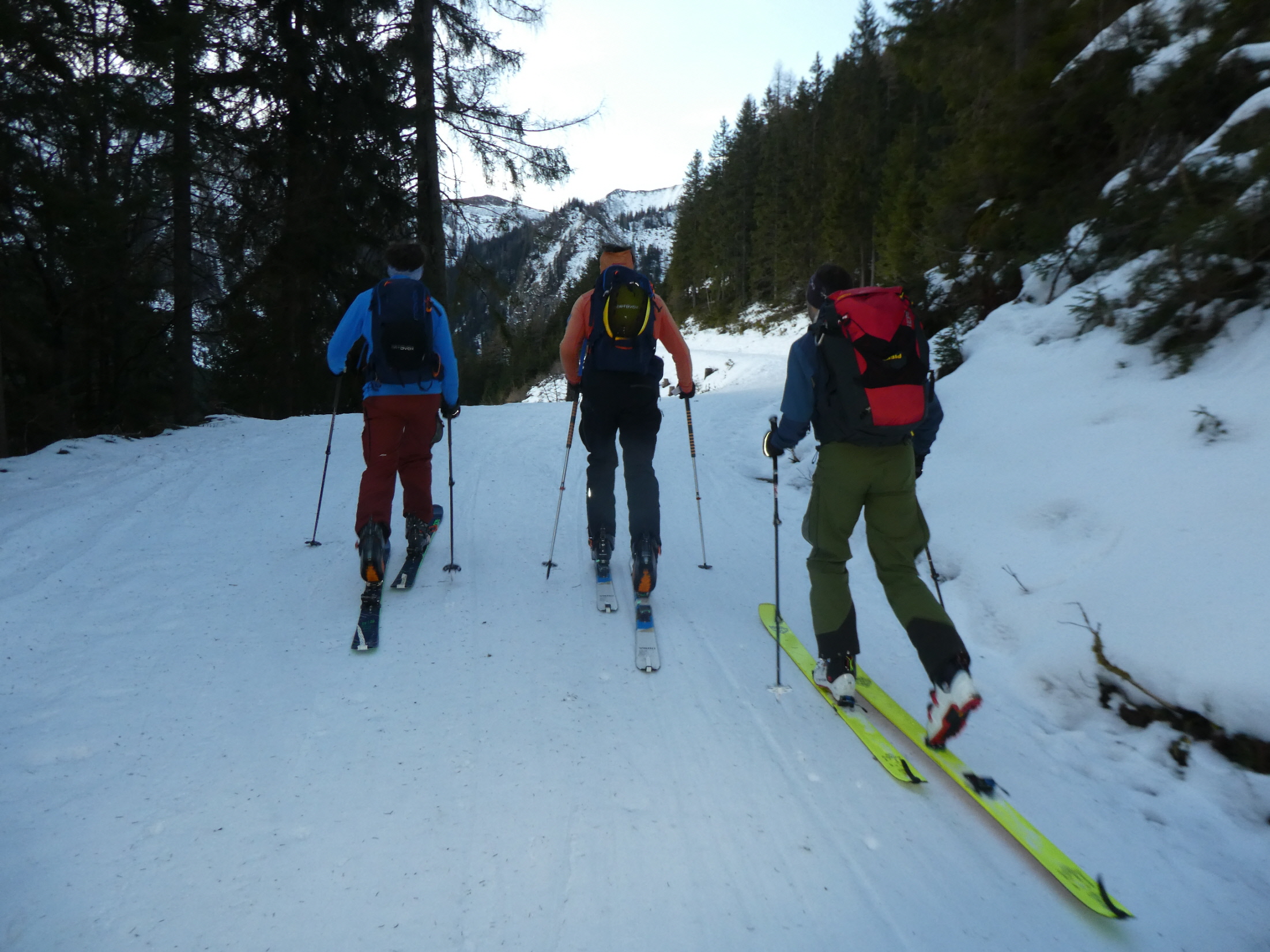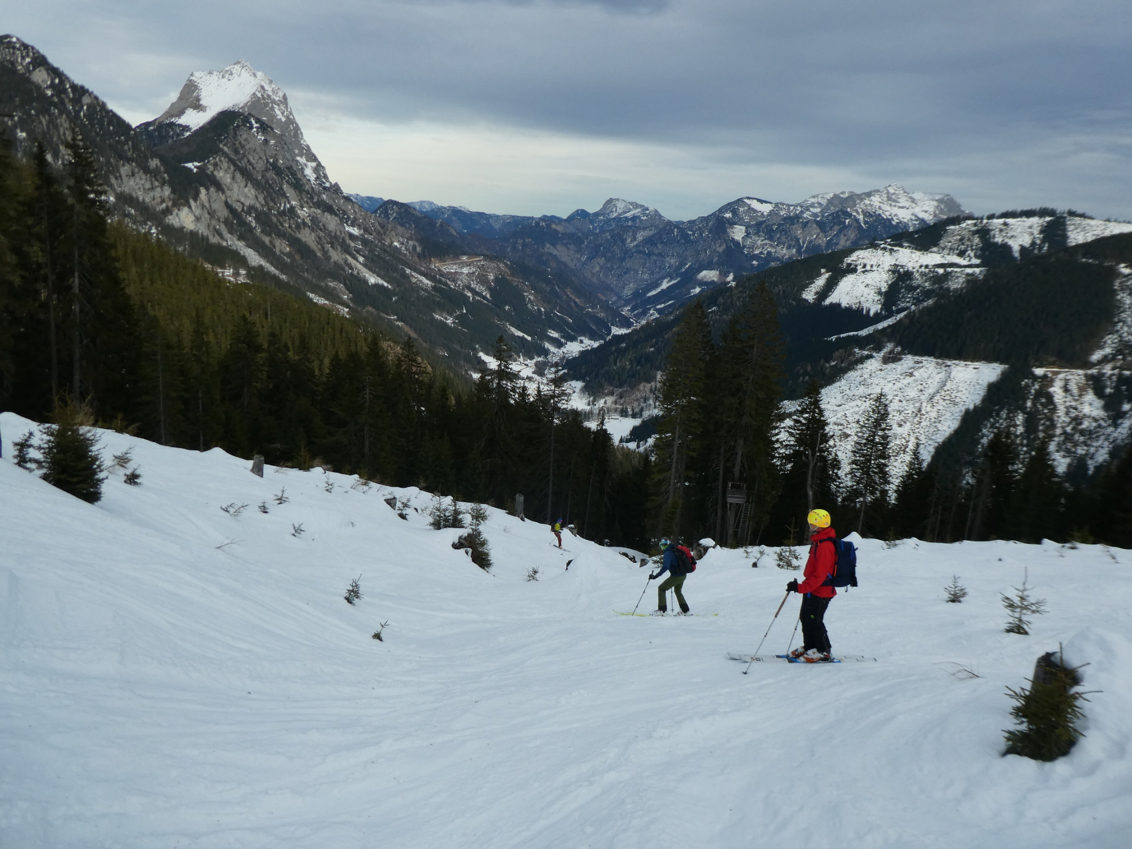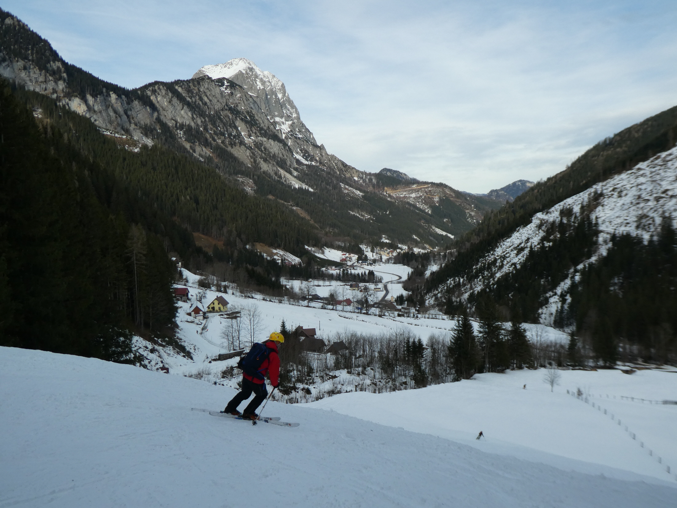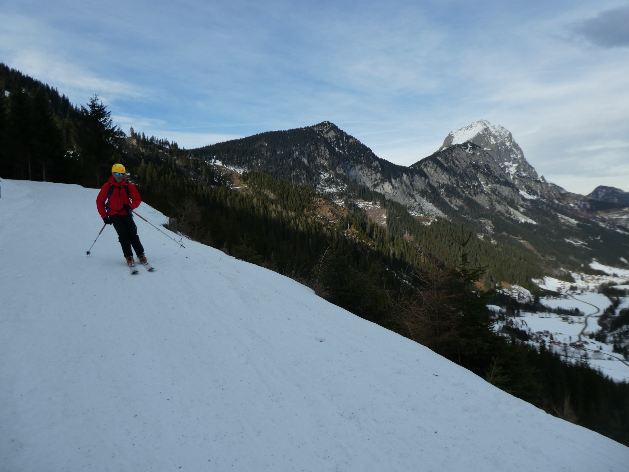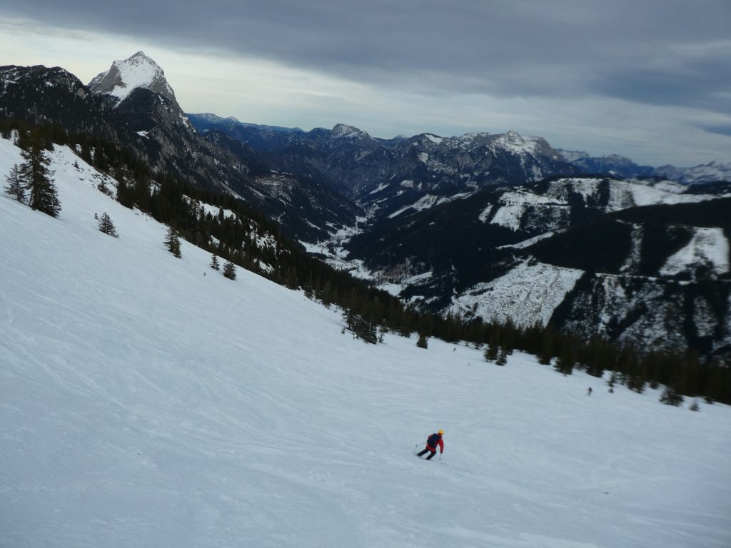 Für die Talabfahrt hatten wir hier in der Vergangenheit sicher schon viel besseren Schnee. Aber wenn es, so wie bisher in dieser Saison, Regionen gibt, wo kein Brösel Schnee liegt, dann freut man sich auch über eine dünne durchgehende Schneedecke. Bis zum ersten querenden Forstweg sind wir den vielen hier in den Weihnachtsferien hinterlassenen Spuren, stellenweise pistenartig ausgefahren, gefolgt.