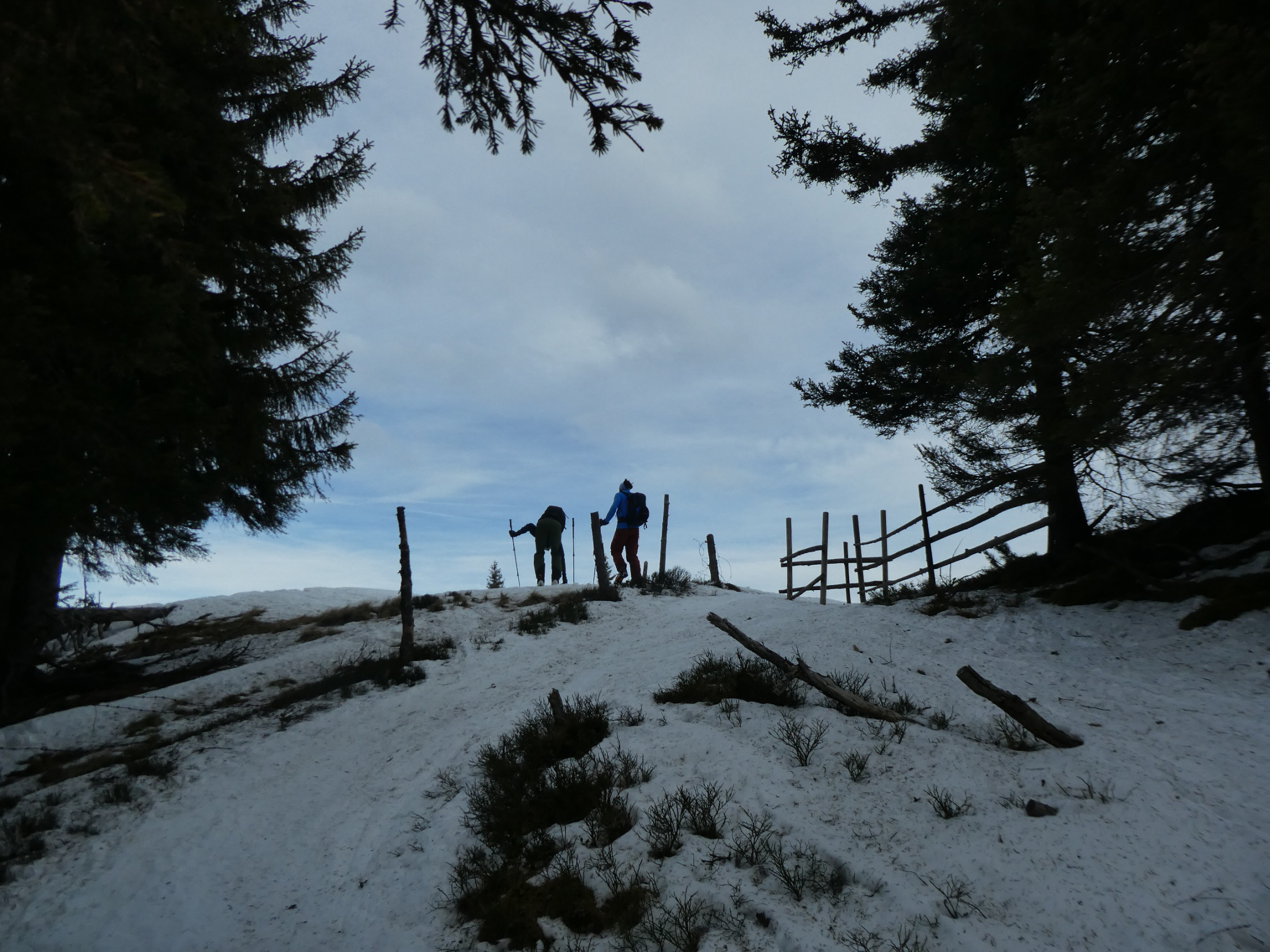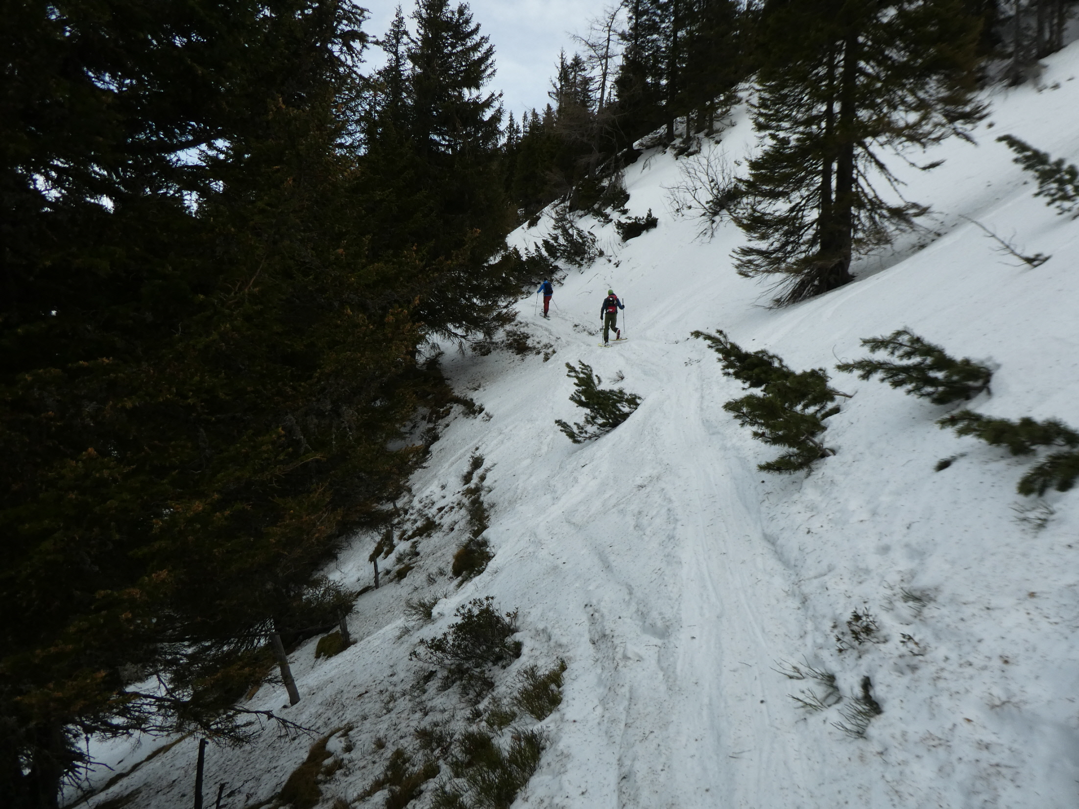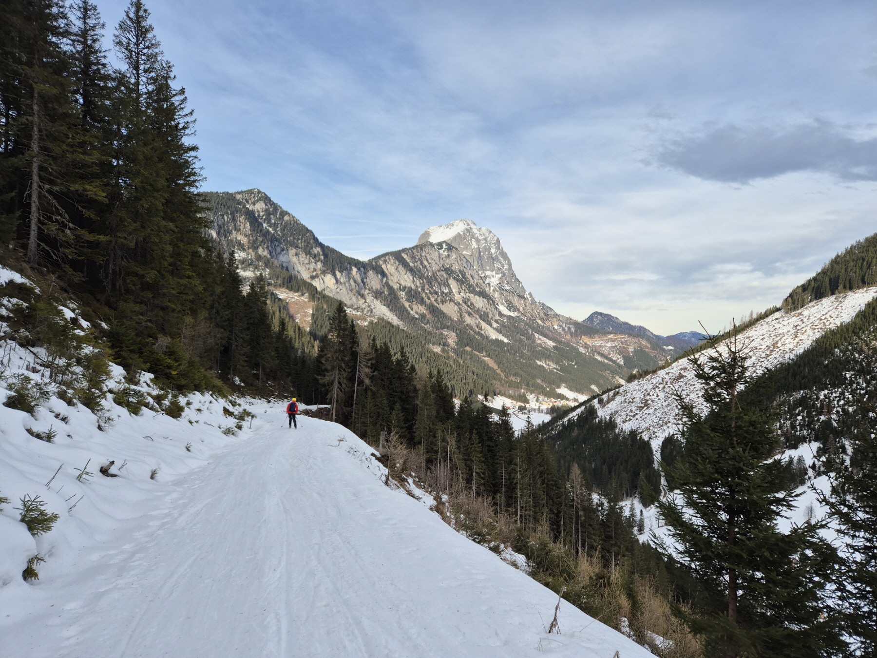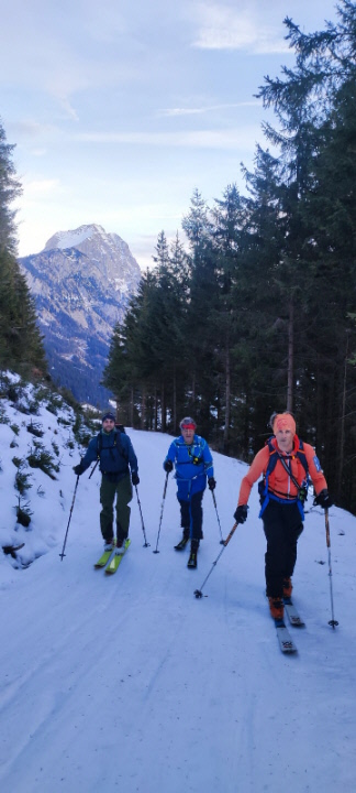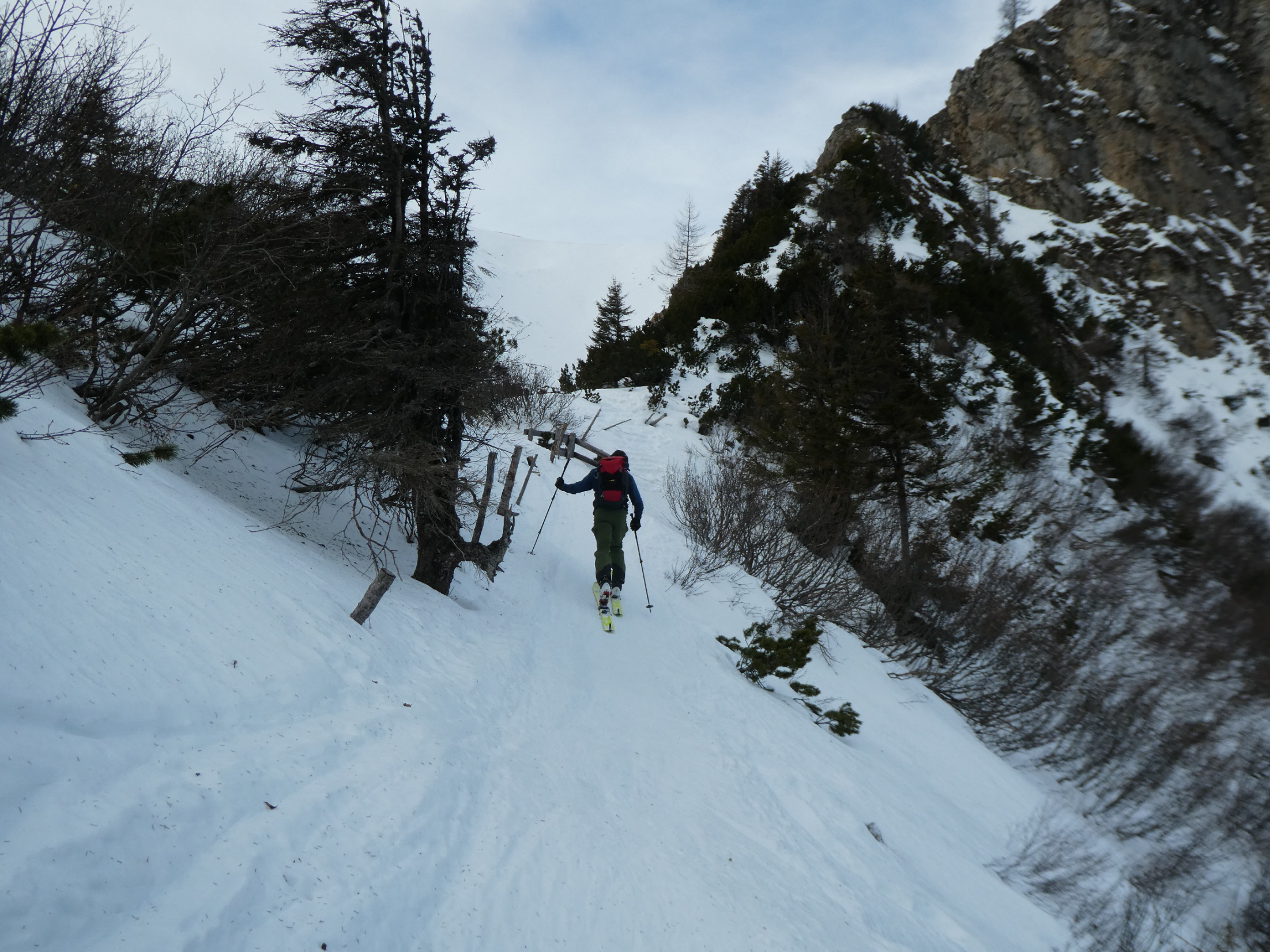 Für die Talabfahrt hatten wir hier in der Vergangenheit sicher schon viel besseren Schnee. Aber wenn es, so wie bisher in dieser Saison, Regionen gibt, wo kein Brösel Schnee liegt, dann freut man sich auch über eine dünne durchgehende Schneedecke. Bis zum ersten querenden Forstweg sind wir den vielen hier in den Weihnachtsferien hinterlassenen Spuren, stellenweise pistenartig ausgefahren, gefolgt.