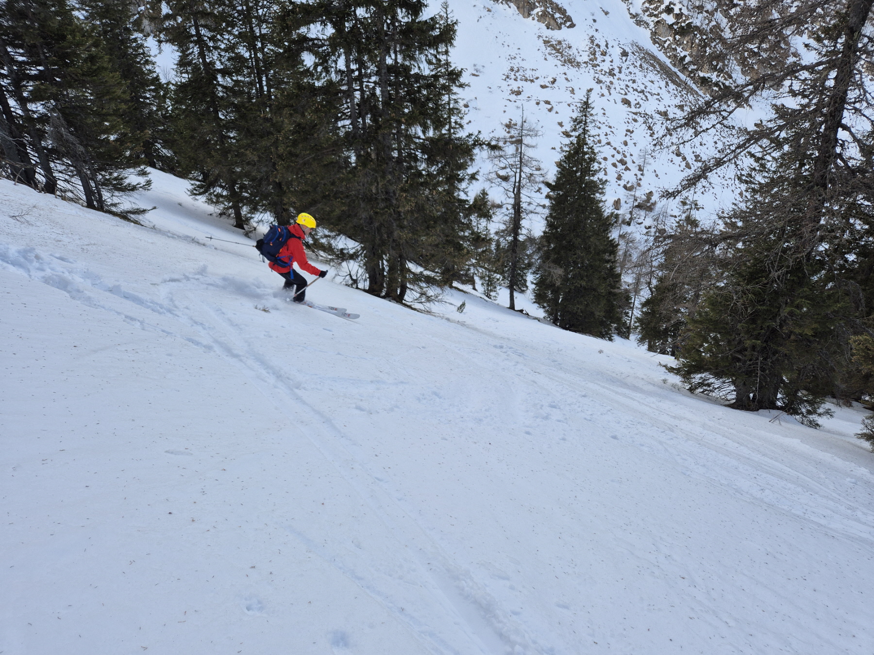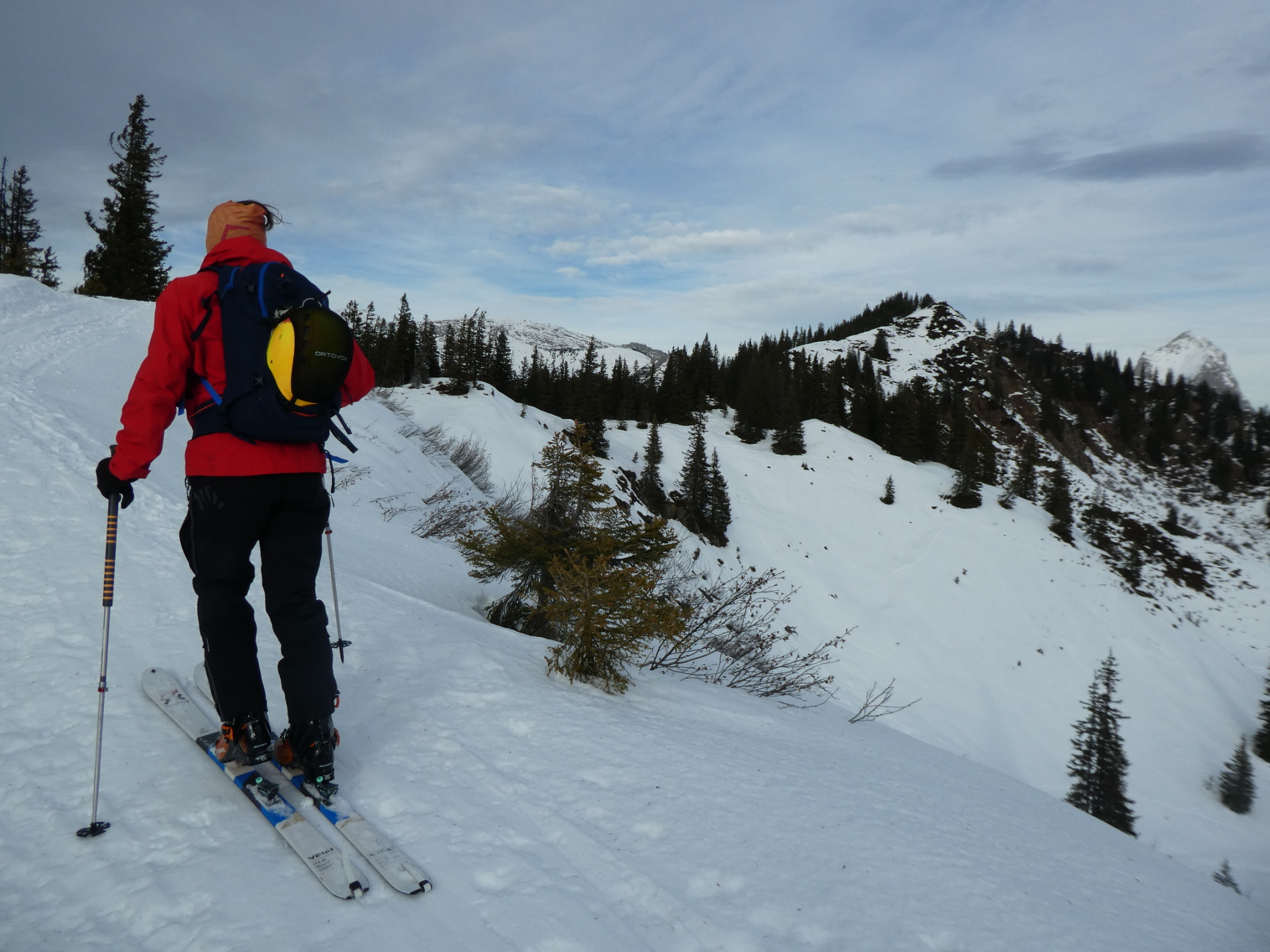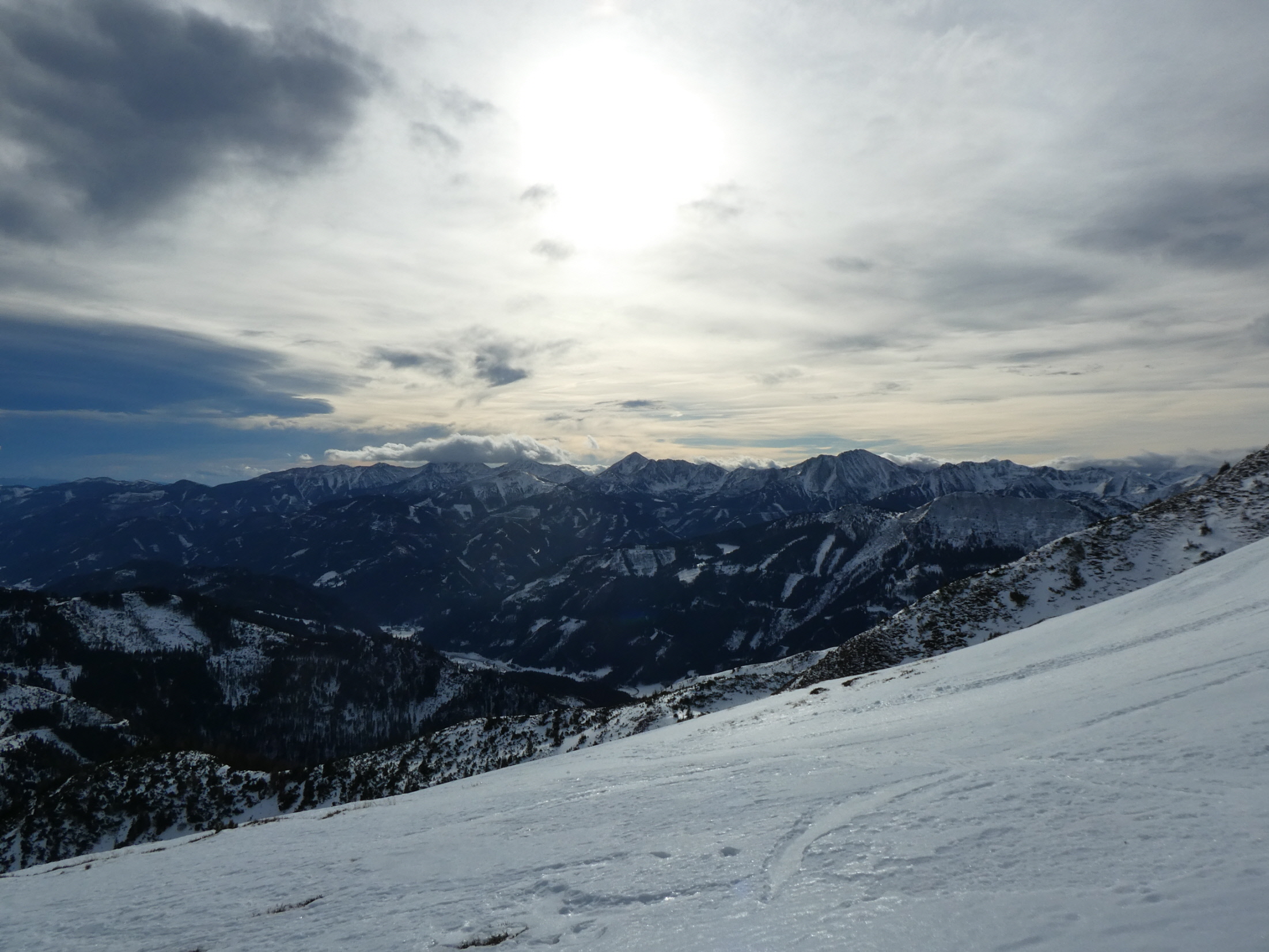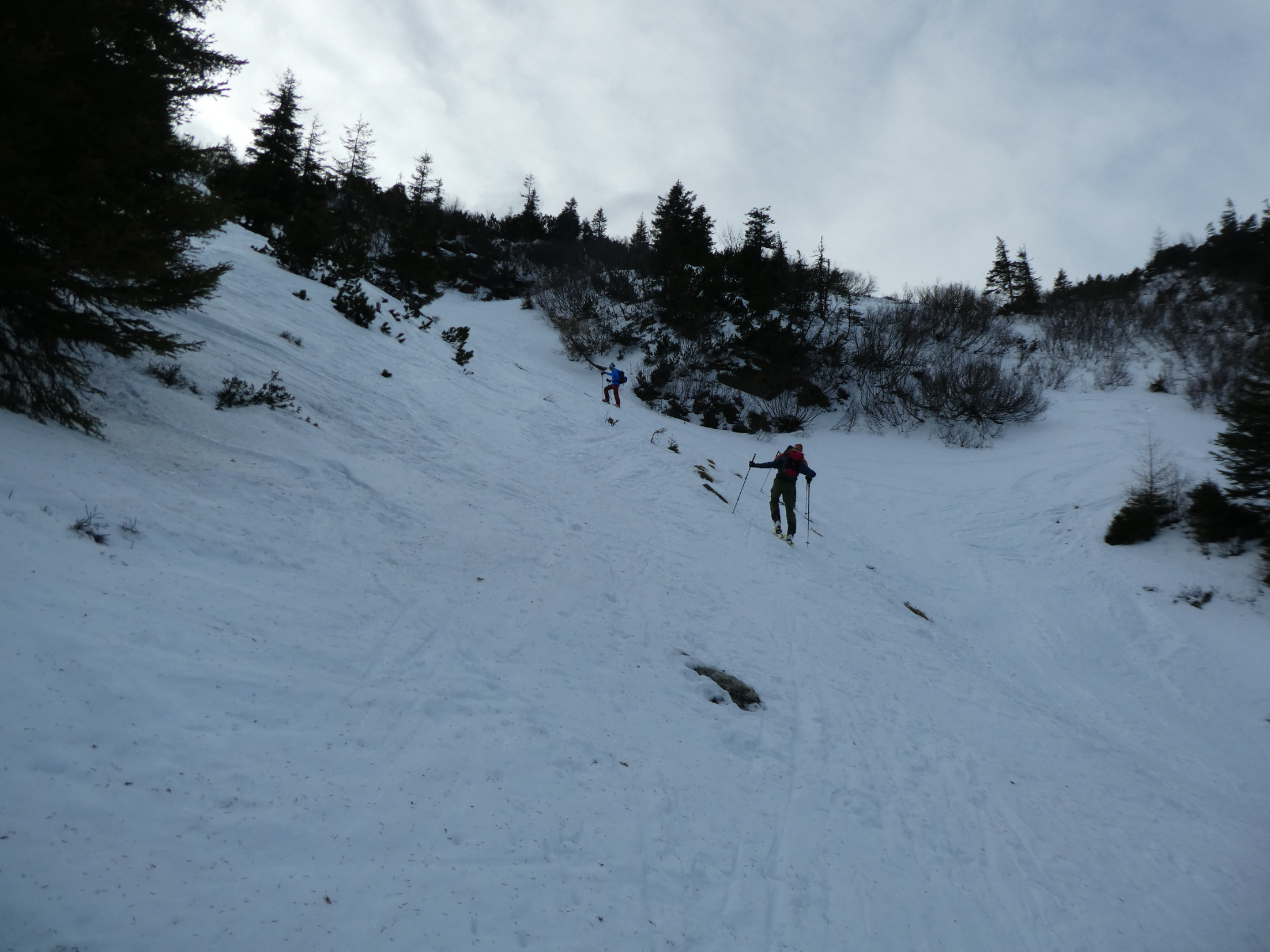 Für die Talabfahrt hatten wir hier in der Vergangenheit sicher schon viel besseren Schnee. Aber wenn es, so wie bisher in dieser Saison, Regionen gibt, wo kein Brösel Schnee liegt, dann freut man sich auch über eine dünne durchgehende Schneedecke. Bis zum ersten querenden Forstweg sind wir den vielen hier in den Weihnachtsferien hinterlassenen Spuren, stellenweise pistenartig ausgefahren, gefolgt.