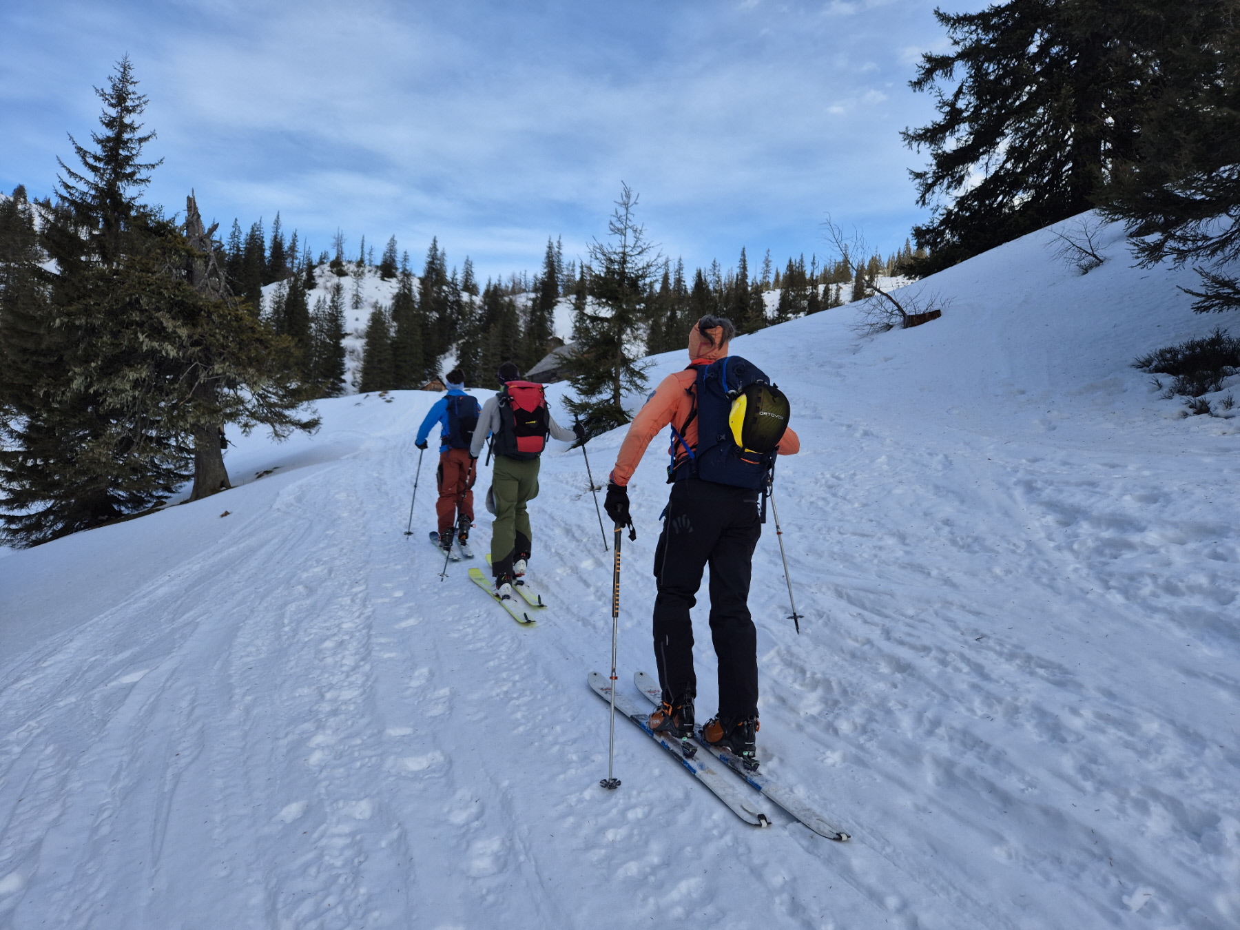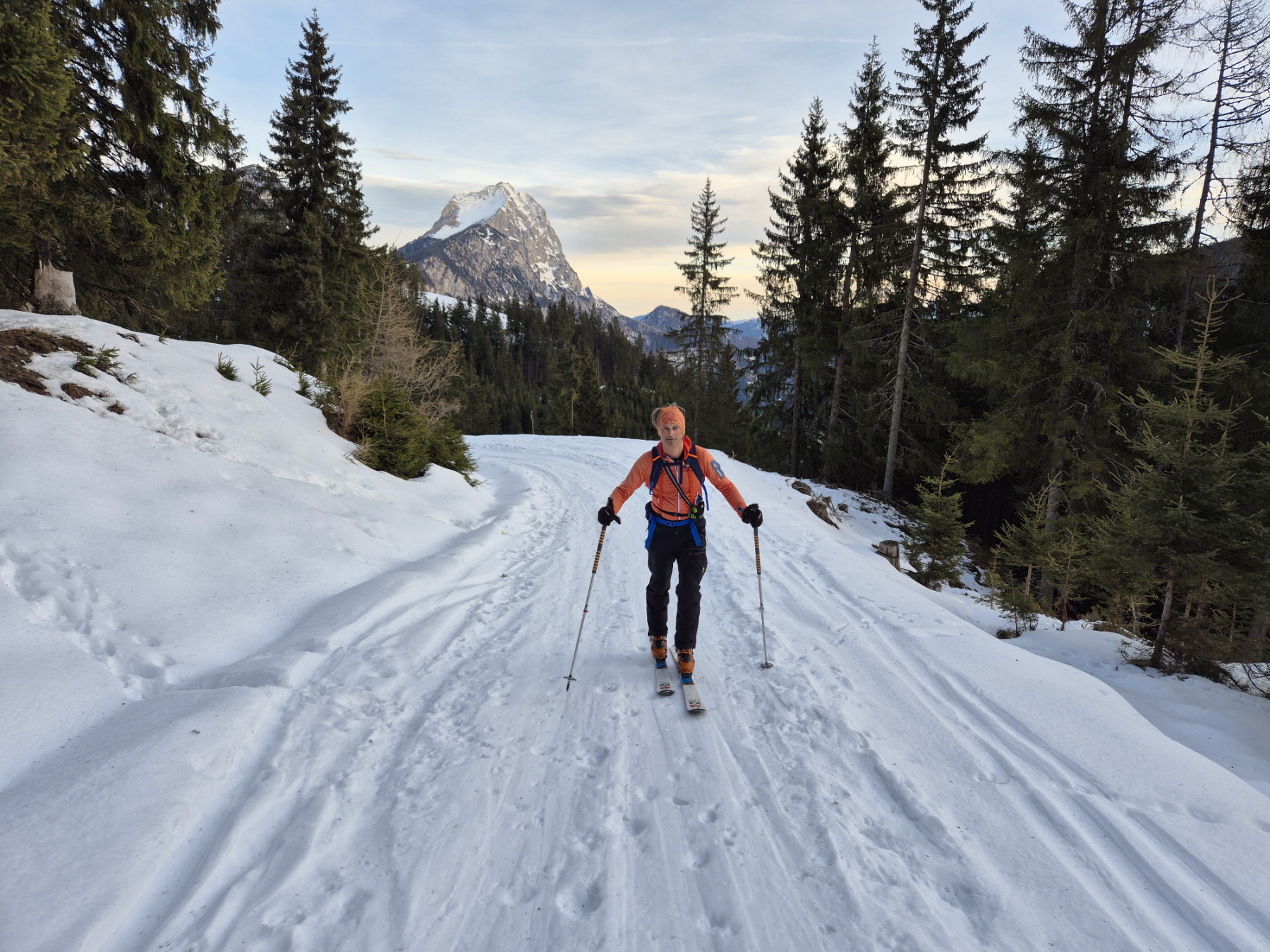 In Hinterradmer bei der Kapelle sind wir gestartet. In den letzten eineinhalb Wochen ist die Schneedecke am Weg hinauf in Richtung Schafböden stark geschwunden. Auf die ersten beiden Wegabschneider haben wir daher verzichtet und sind am Forstweg geblieben. Danach haben wir am Steig, dem wir weiter hinauf gefolgt sind, für ein längeres Stück die Skier getragen. Mit zunehmender Höhe ist hinauf zur Schafbödenalm aber die Schneedecke immer dicker geworden.