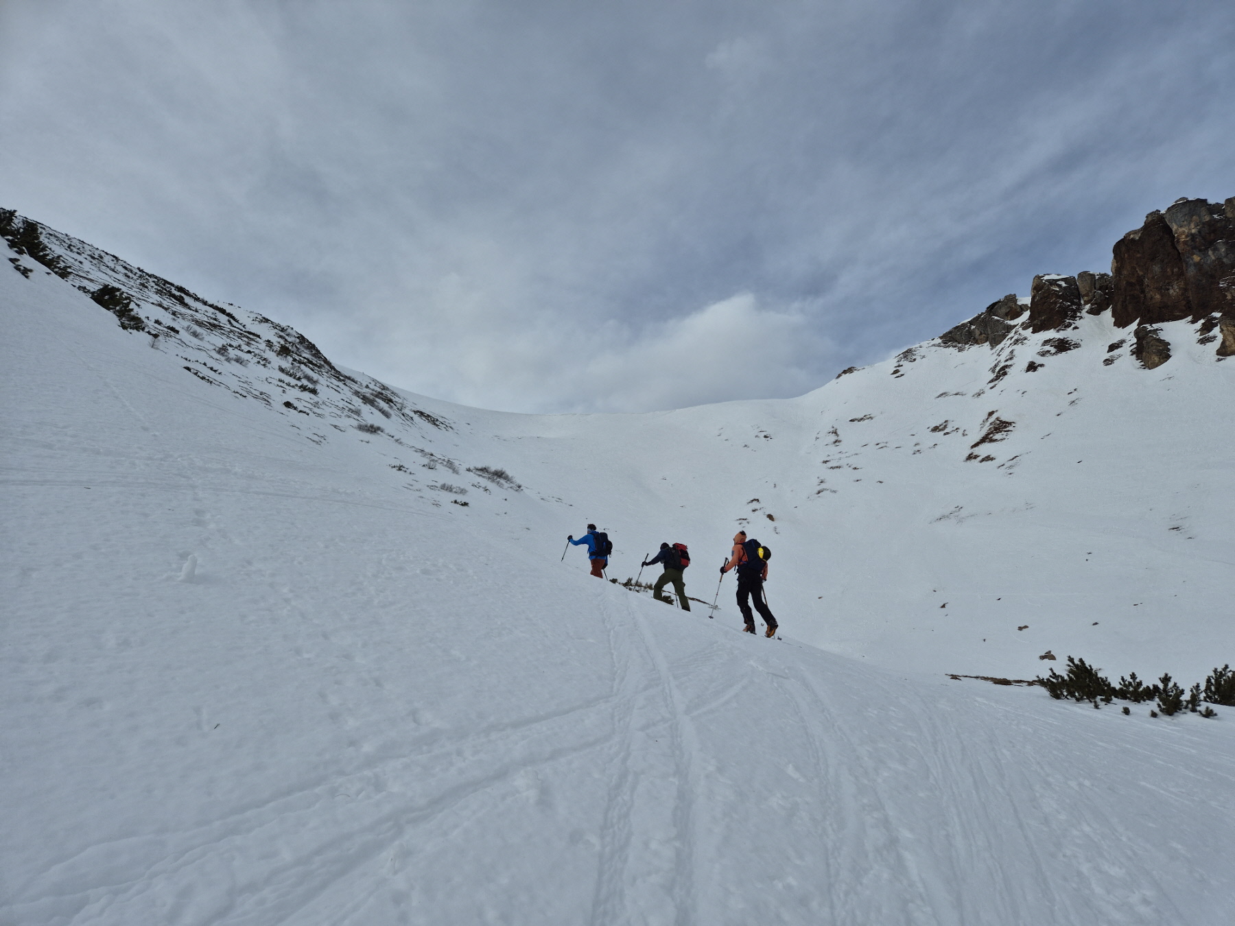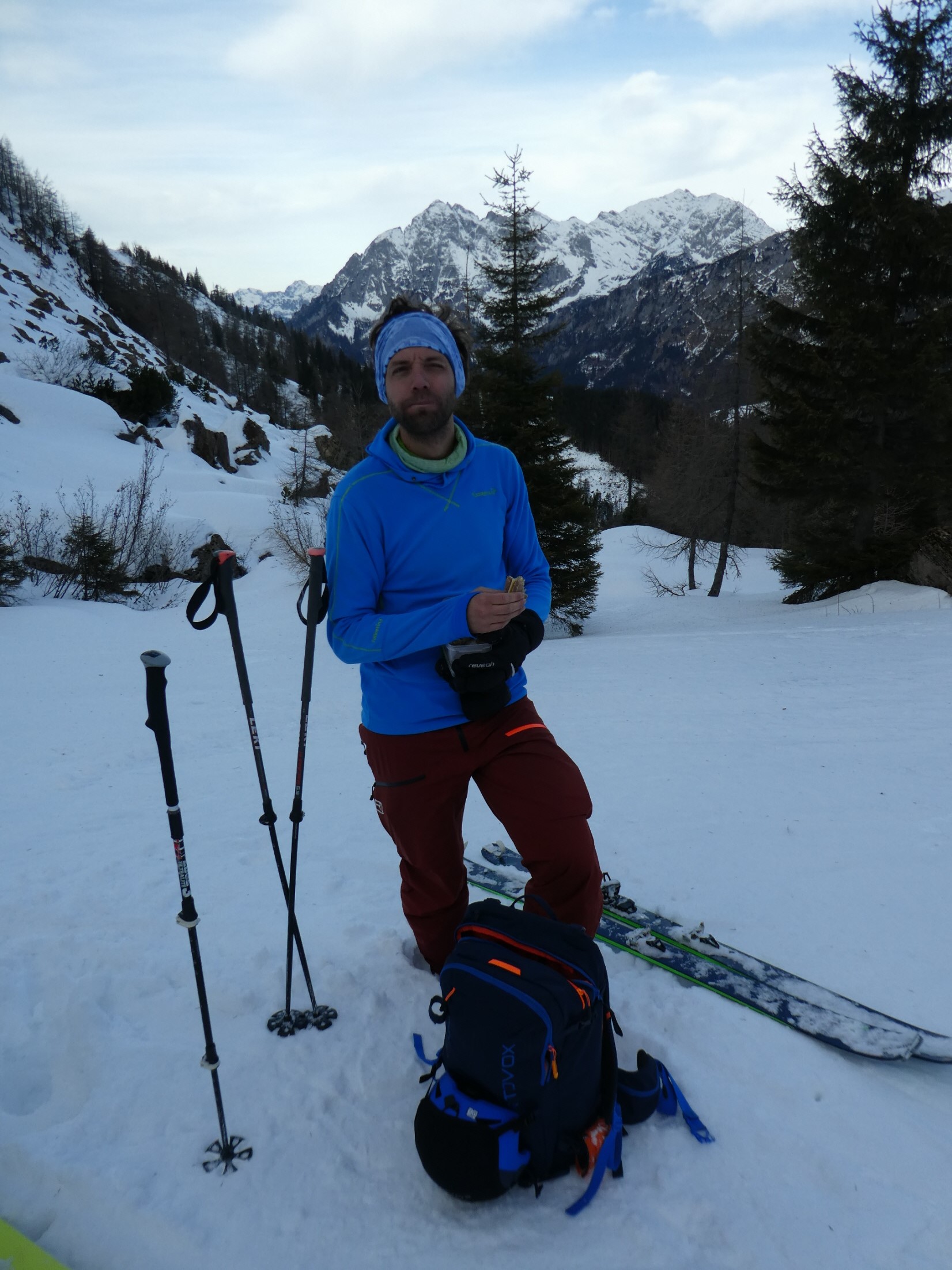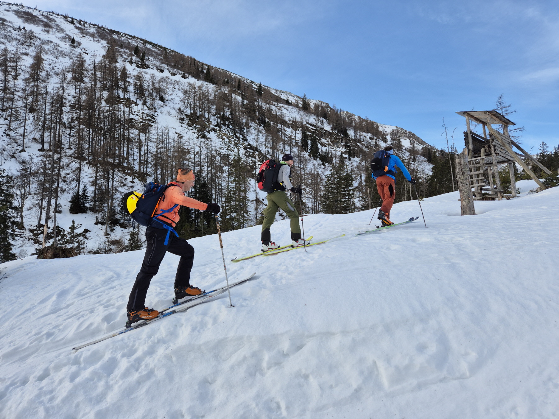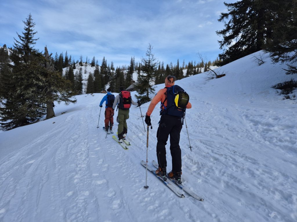 Vorbei an der Alm sind wir noch bis zum höchsten Punkt in Richtung Leobner Törl angstiegen. Erstmals haben wird dort abgefellt und sind in den oberen Abschnitt des Sautrogs abgefahren. Dort haben wir die Felle wieder aufgezogen und unseren Anstieg – sehr bald unterbrochen durch einen kurzen Zwischenstopp zum Montieren der Harscheisen – auf etwas glasiger Unterlage fortgesetzt.