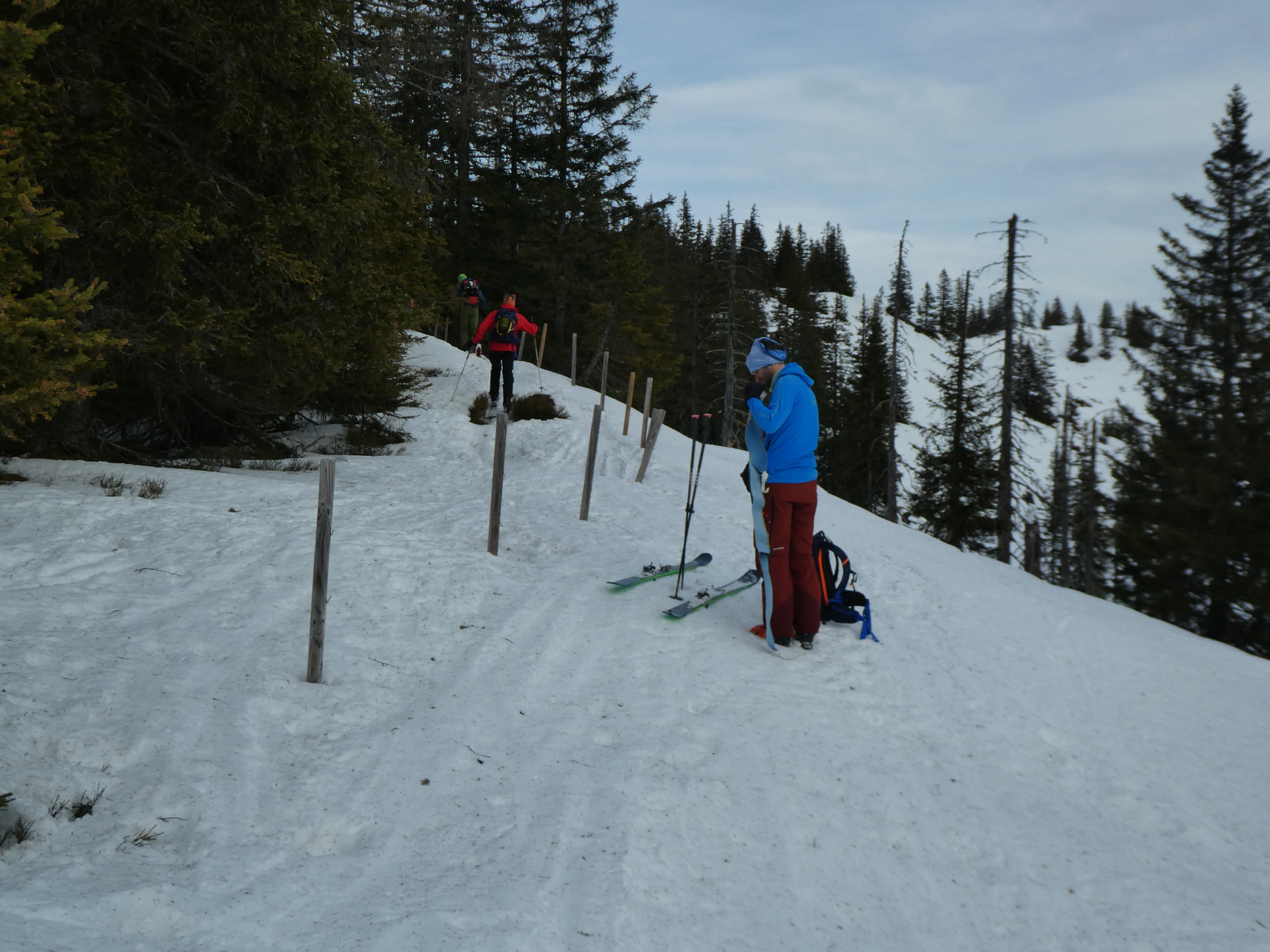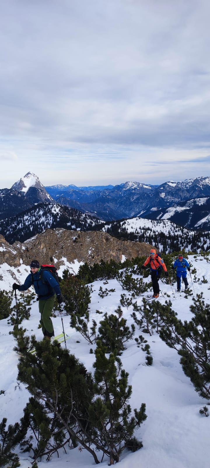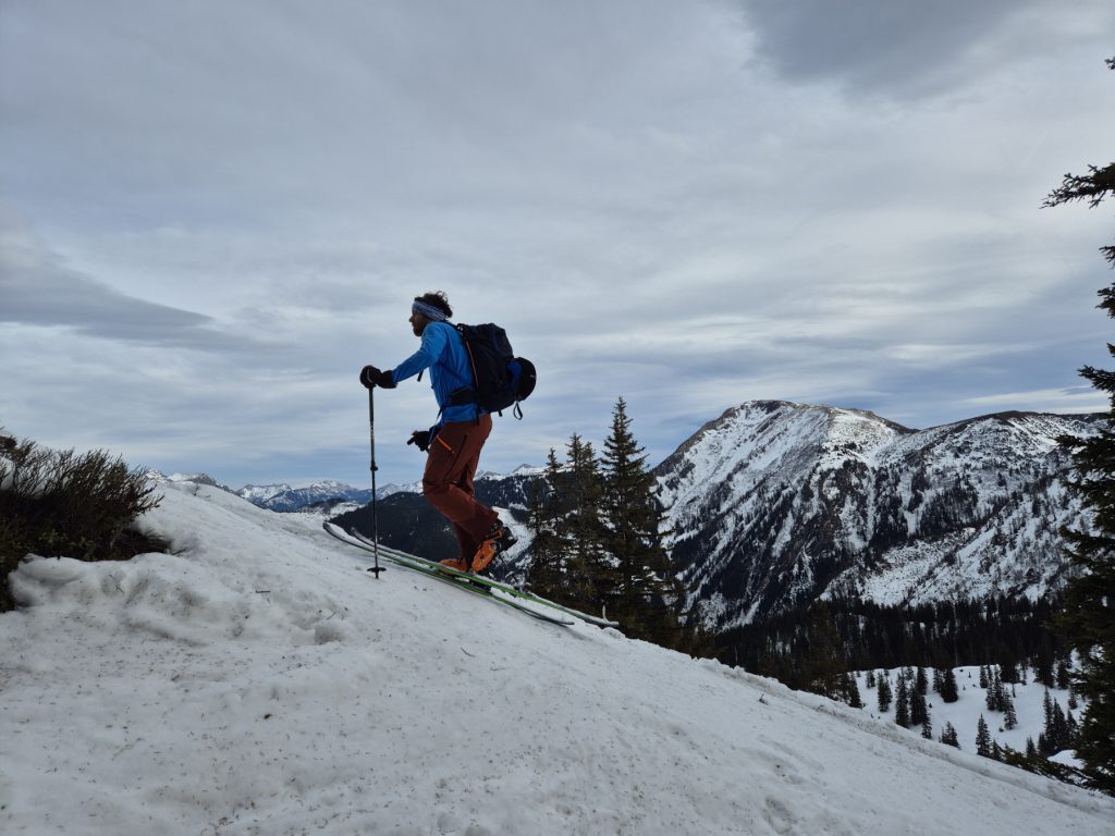 Für die nächste kurze Zwischenabfahrt zurück über die Schafböden haben wir unterschiedliche Strategien verfolgt. Chris hat abgefellt, Andreas, Basti und ich haben zwar die Harscheisen demontiert, wir sind aber gleich auf Fellen abgefahren. Für die folgende Höhenwanderung weiter zum Gscheideggkogel haben wir auf die zackigen Aufstiegshilfen verzichtet. Der Föhn hat für eine aufgeweichte Spur gesorgt und sie daher überflüssig gemacht.