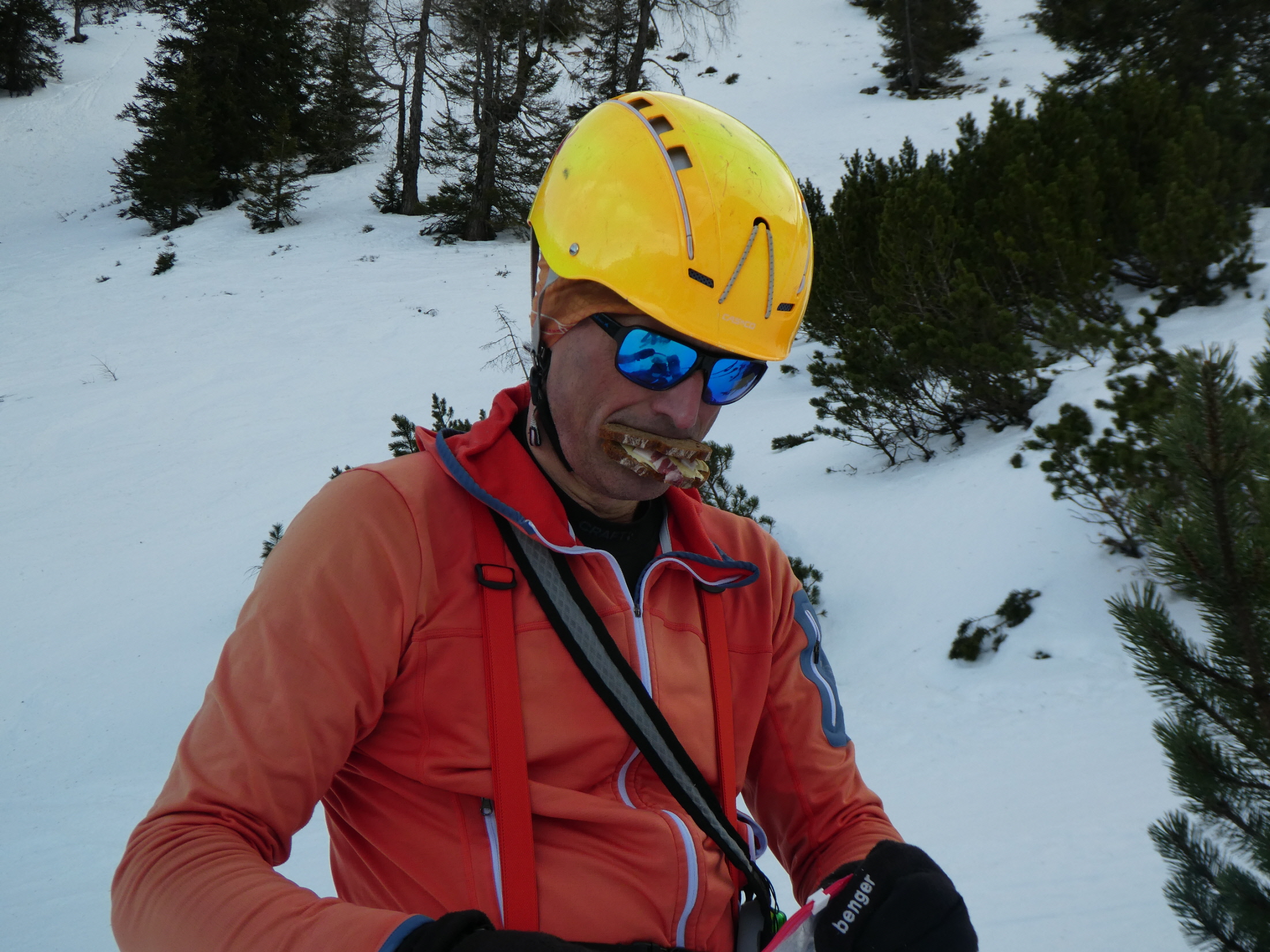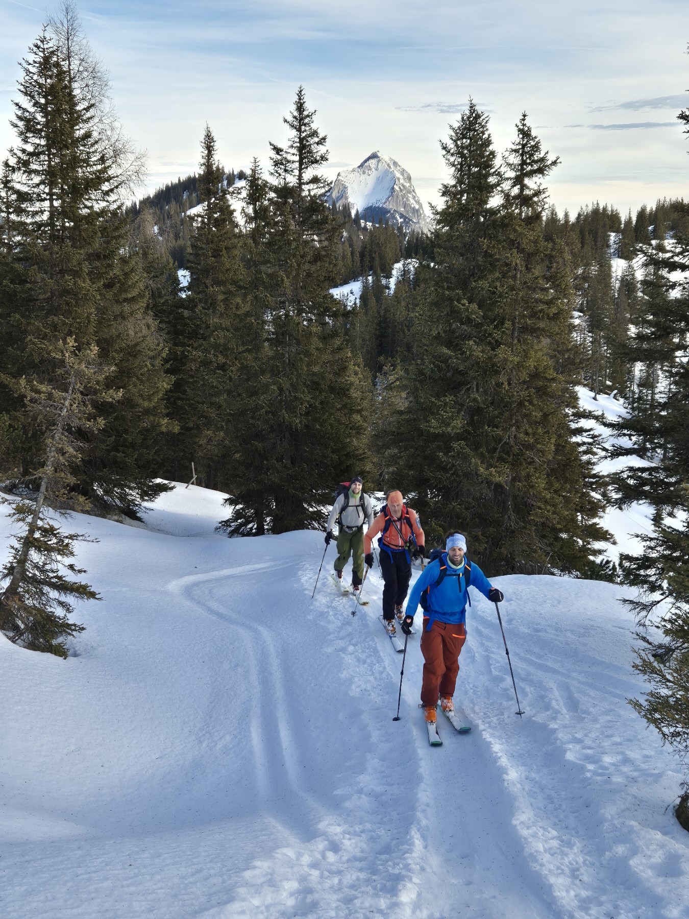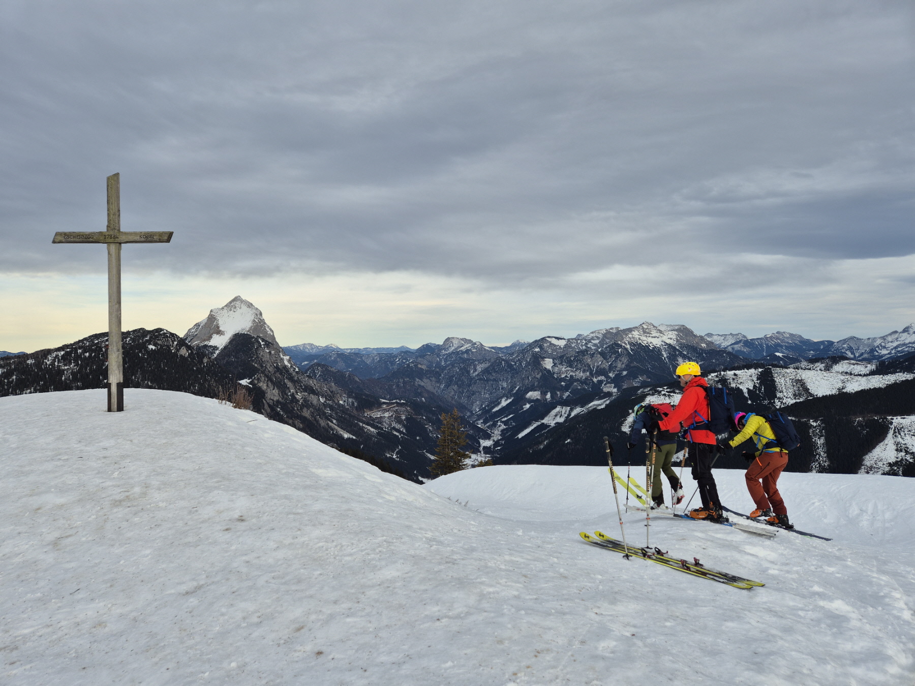 Für die nächste kurze Zwischenabfahrt zurück über die Schafböden haben wir unterschiedliche Strategien verfolgt. Chris hat abgefellt, Andreas, Basti und ich haben zwar die Harscheisen demontiert, wir sind aber gleich auf Fellen abgefahren. Für die folgende Höhenwanderung weiter zum Gscheideggkogel haben wir auf die zackigen Aufstiegshilfen verzichtet. Der Föhn hat für eine aufgeweichte Spur gesorgt und sie daher überflüssig gemacht.