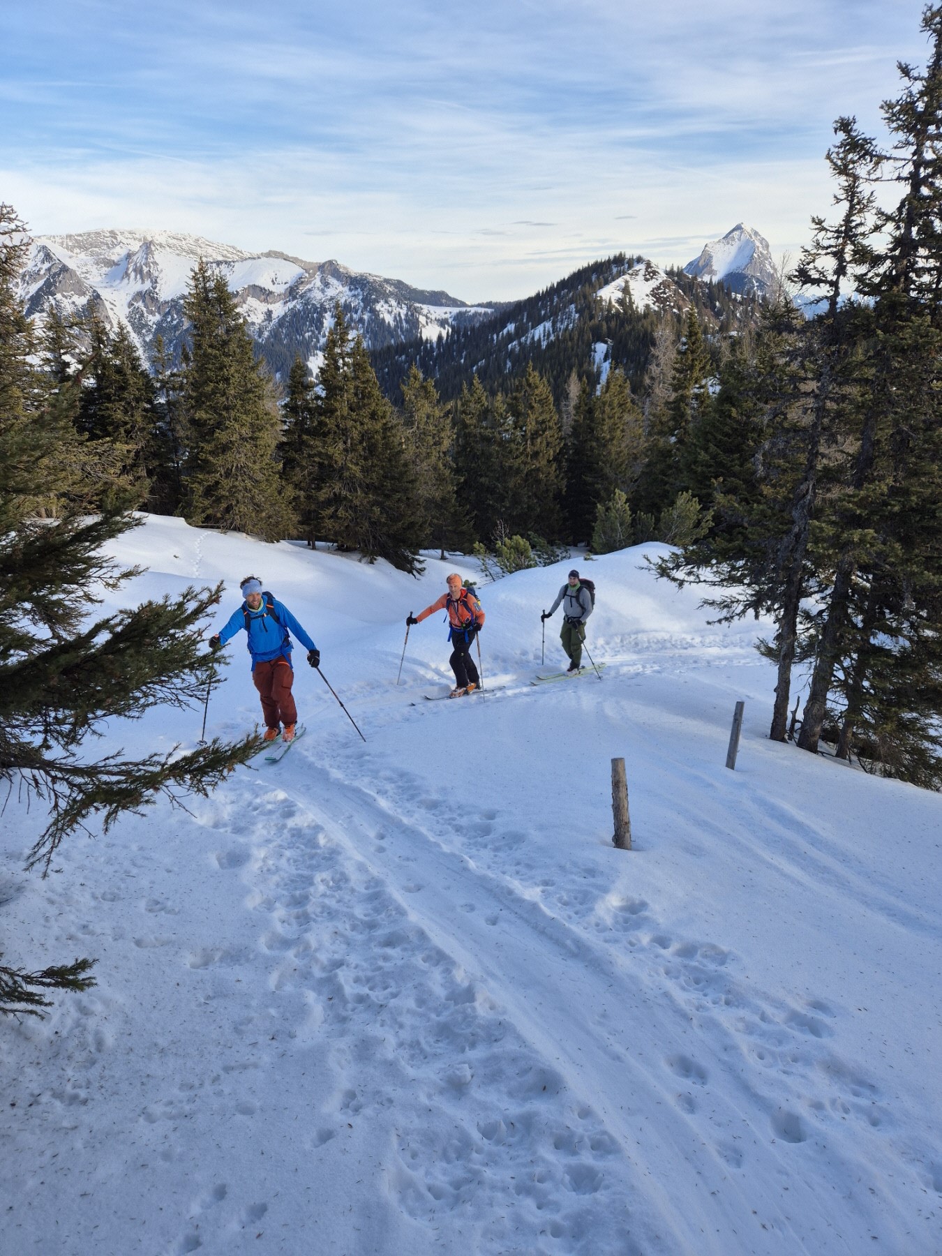 Hundertschaften von Sternsingergruppen waren in den letzten Tagen im Land unterwegs. Auch in unserer Tourenrunde hat eine Skitour am Dreikönigstag schon langjährige Tradition. Wohl wissend, dass die Buchstaben, die die Sternsinger auf unseren Türstock geschrieben haben, die Abkürzung des lateinischen Segensspruchs für das Haus darstellen, denke ich an meine Kindheit zurück, wo man uns erzählt hat, das seien die Anfangsbuchstaben der Namen der Heiligen Drei Könige. Mit diesem Basiswissen ausgestattet bezeichne ich die Mitglieder meiner „Sternsingertruppe“, die mich auf der Tour begleitet haben, in der Bildbeschreibung ebenso mit den Anfangsbuchstaben ihrer Vornamen. Sie haben sich auf der Tour übrigens eher nicht durch ihre Sangeskunst, sondern durch ihre Muskelkraft ausgezeichnet. Und ich als ihr „Sternträger“ bin meist hinterher gehechelt. Den mir zustehenden Platz an der Spitze haben sie mir aber jedenfalls immer dann eingeräumt, wenn ich einen Fotostopp eingefordert habe.