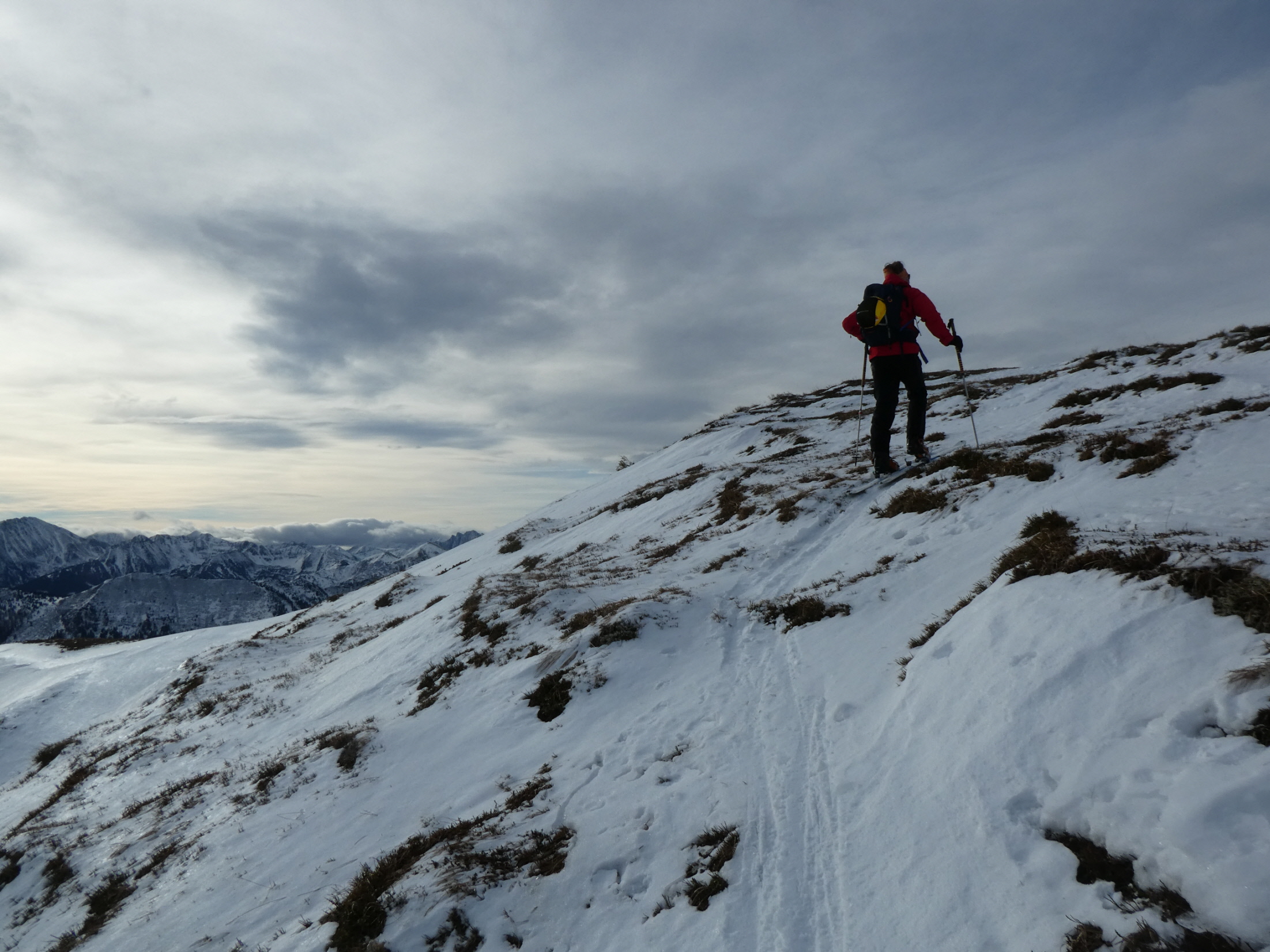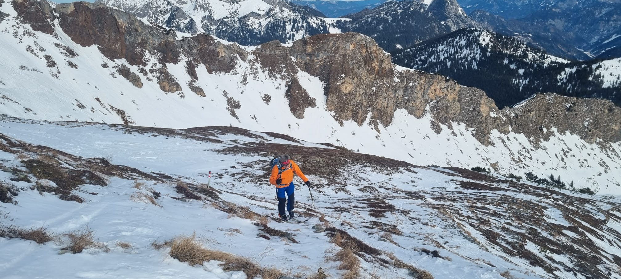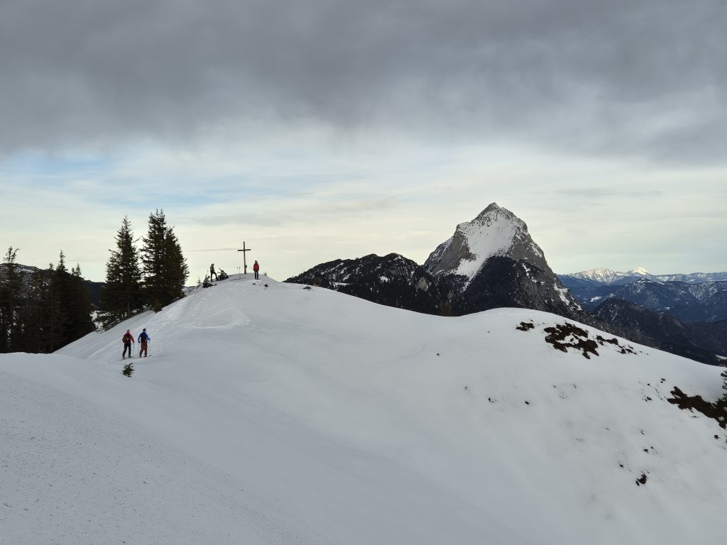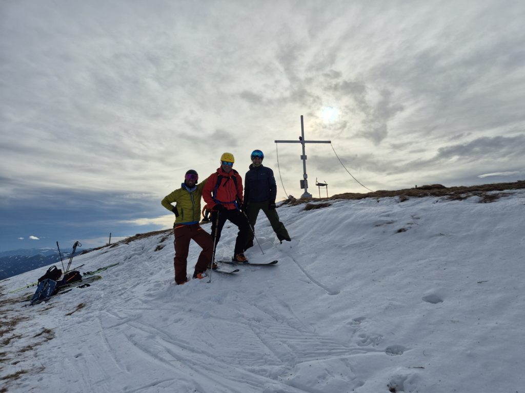 Vom Törl ging es dann hinein in das weite Kar, in dem die Schneelage auch überschaubar ist. Schließlich sind wir entlang der obligaten Aufstiegslinie nach links hinauf und auf sehr dünner Schneeauflage die letzten Meter hinauf zum ersten Tagesgipfel. Der Südföhn hat nicht nur für ein Wolkenfenster in der Region, sondern auch für herrliche Föhnstimmung gesorgt.