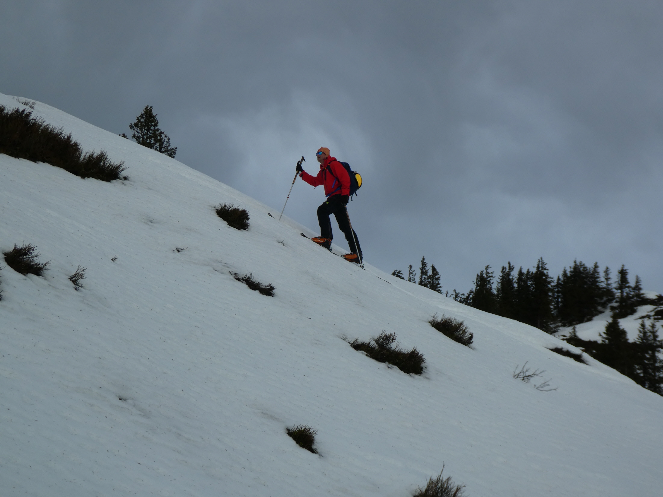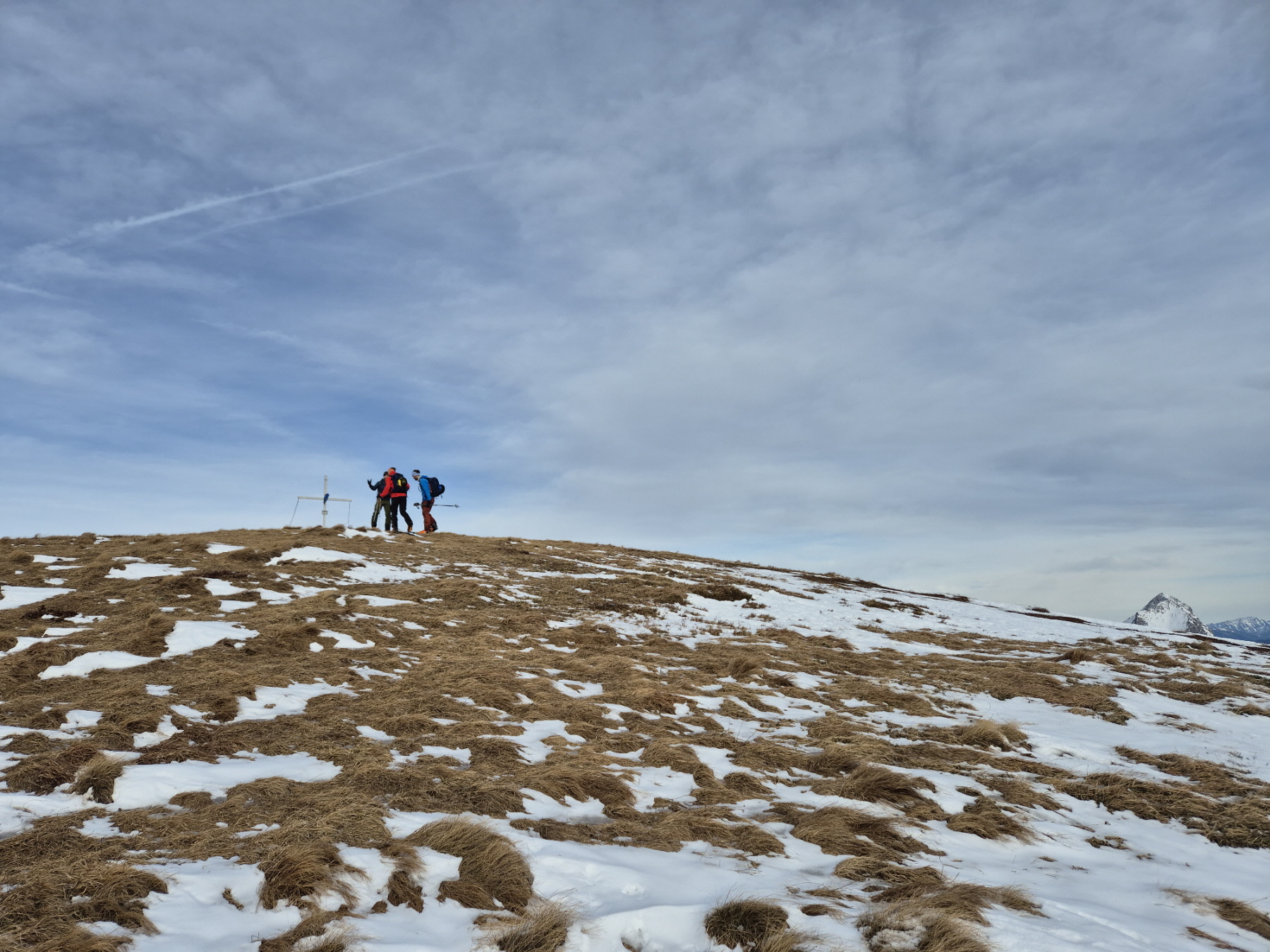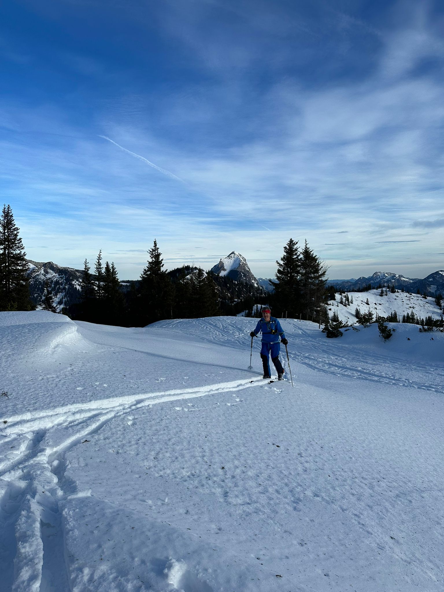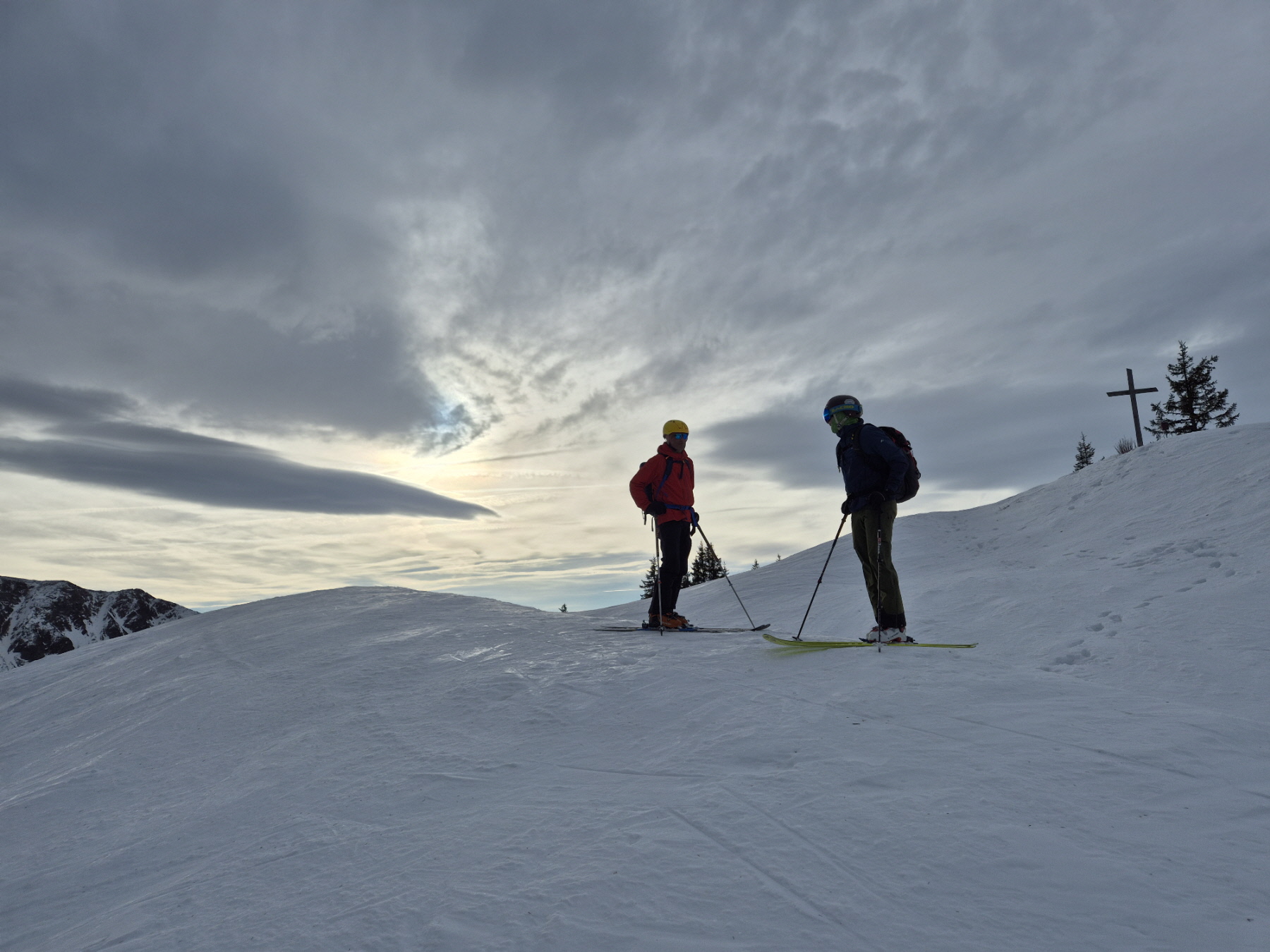 Vom Törl ging es dann hinein in das weite Kar, in dem die Schneelage auch überschaubar ist. Schließlich sind wir entlang der obligaten Aufstiegslinie nach links hinauf und auf sehr dünner Schneeauflage die letzten Meter hinauf zum ersten Tagesgipfel. Der Südföhn hat nicht nur für ein Wolkenfenster in der Region, sondern auch für herrliche Föhnstimmung gesorgt.
