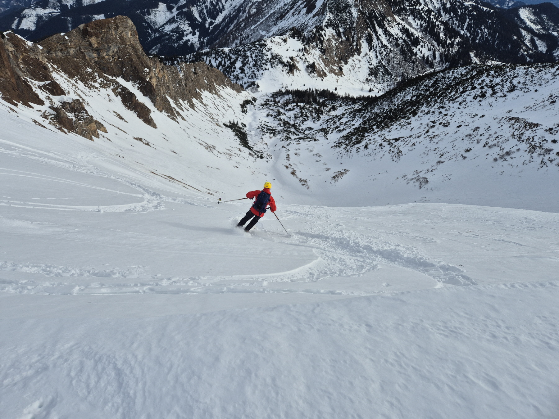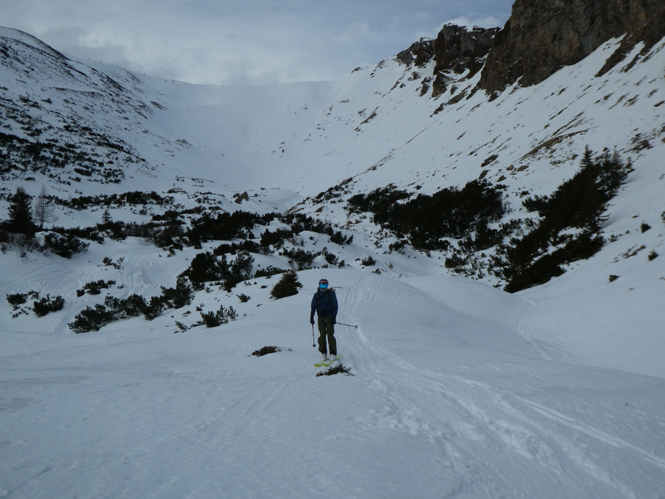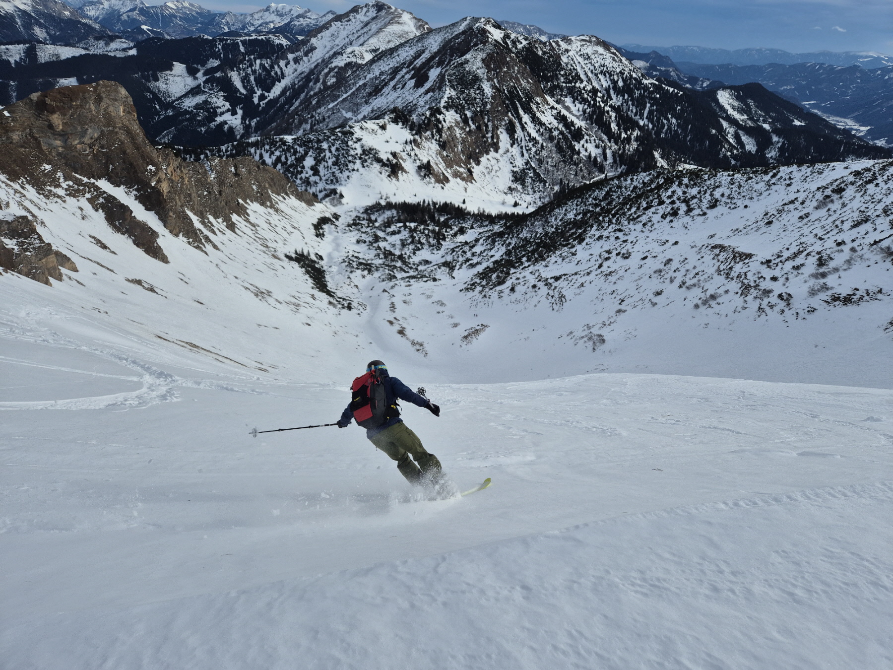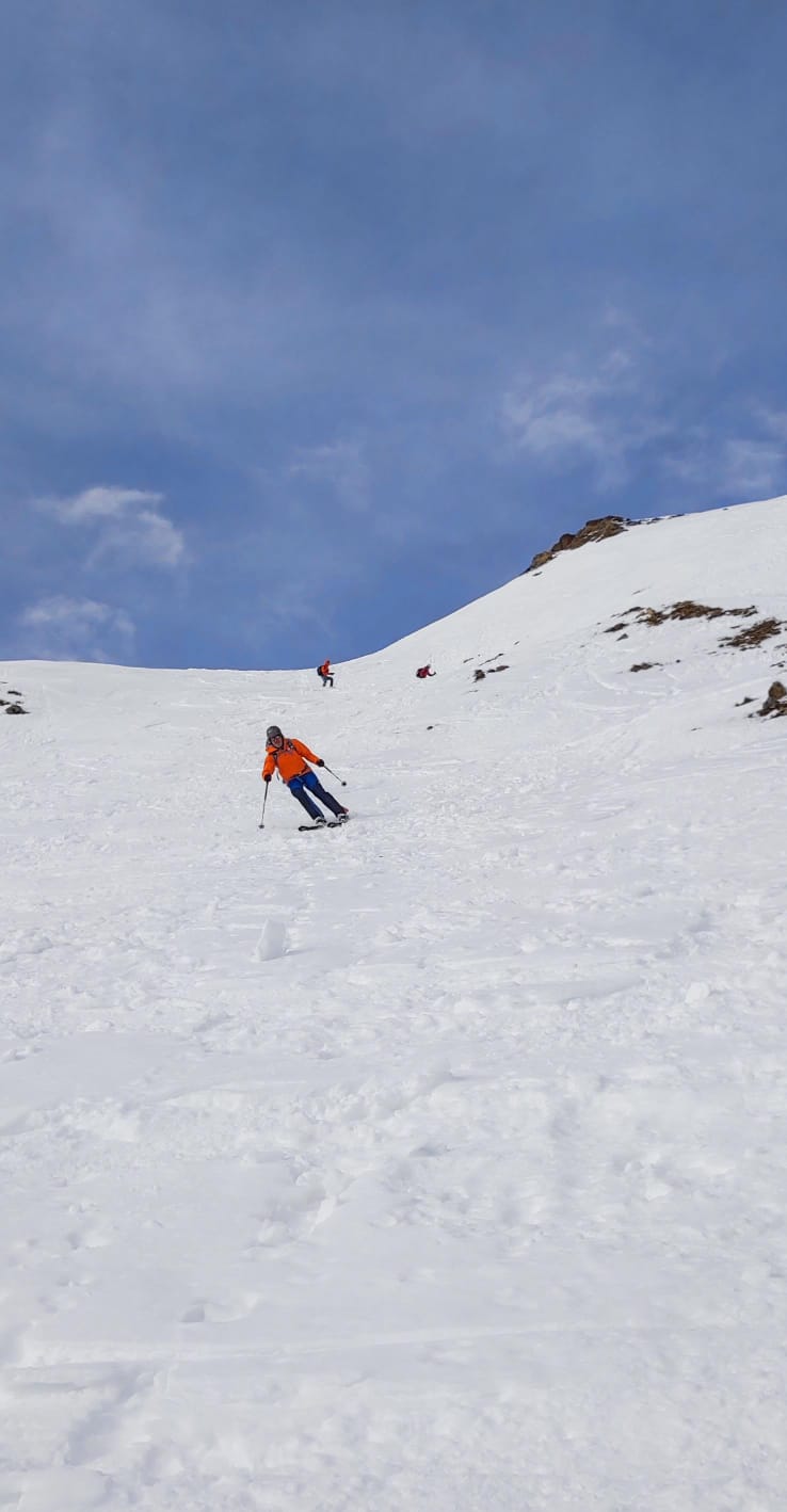 Nach der Gipfelrast sind wir bei wechselnden Schneebedingungen im Ostkar wieder abgefahren. Am Karboden ging es dann zurück hinaus bis zum Leobner Törl. Dort haben wir zum dritten Mal an diesem Tag die Felle wieder aufgezogen, sind ein kurzes Stück angestiegen und dann in etwa bis zu jenem Punkt hinüber gequert, wo wir 2 Stunden vorher unsere Zwischenabfahrt begonnen haben.
