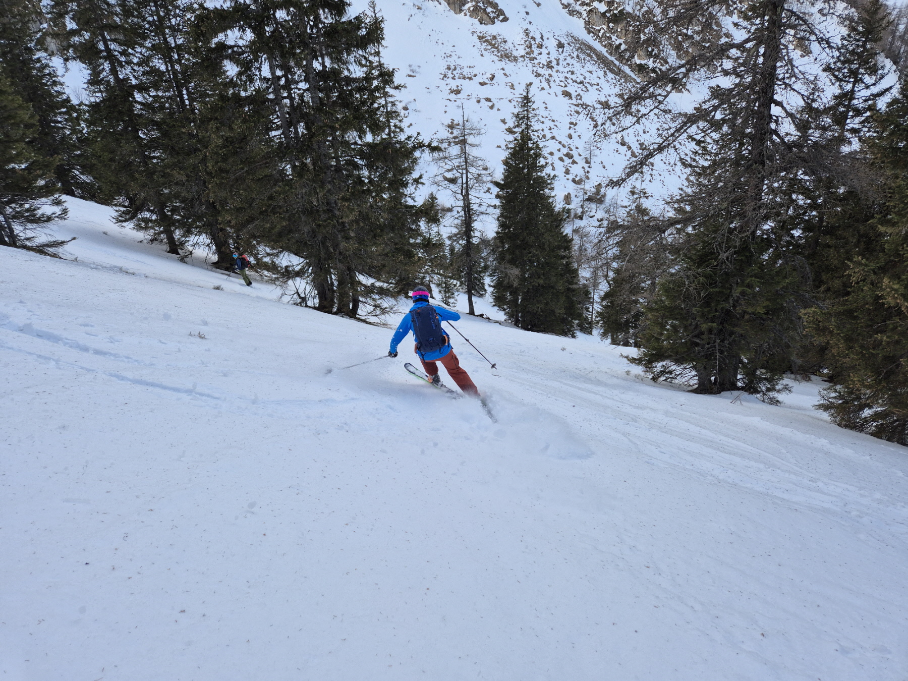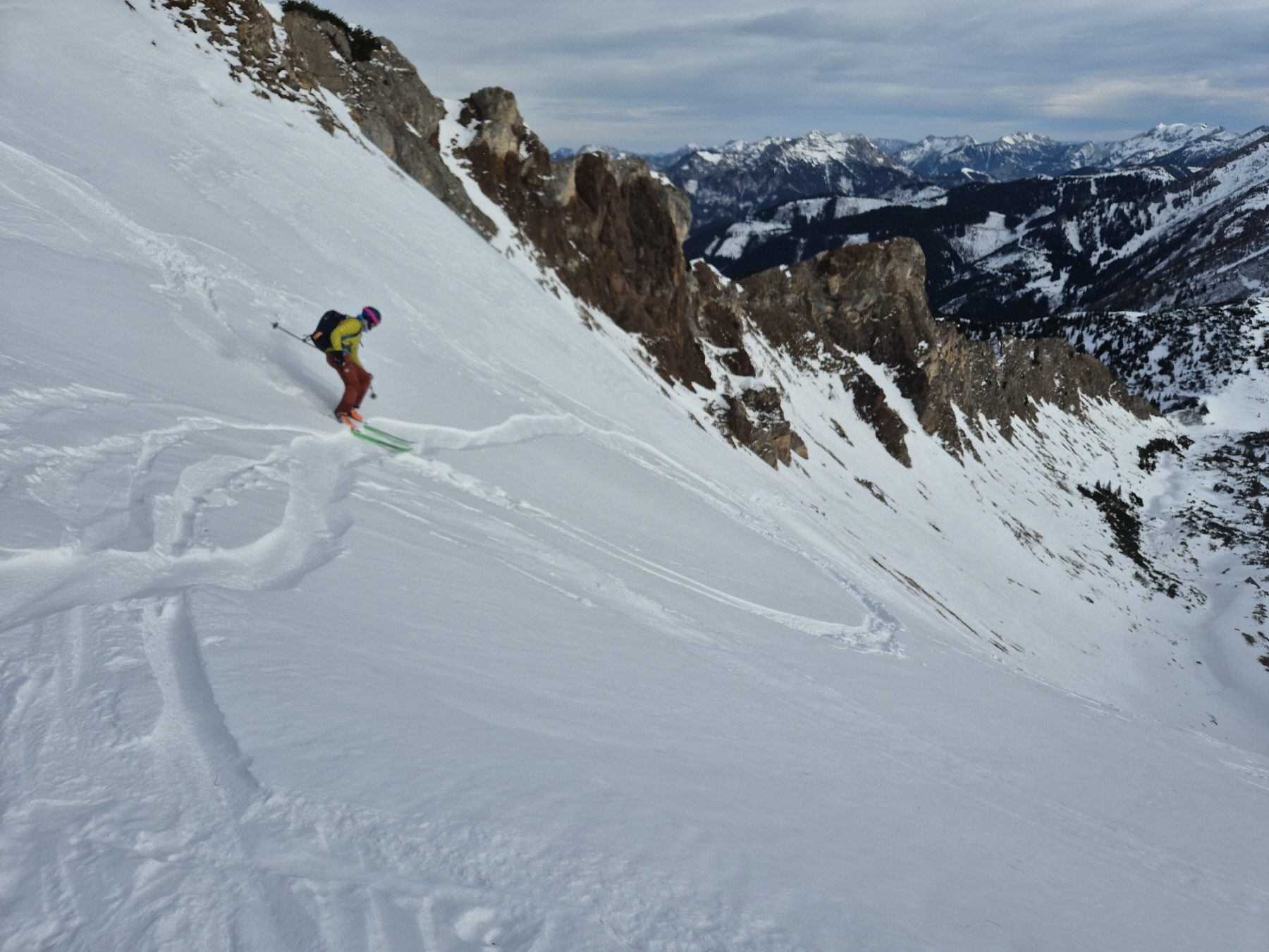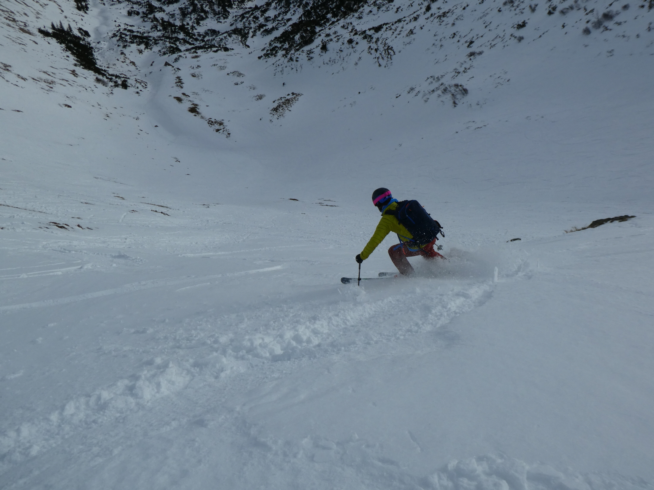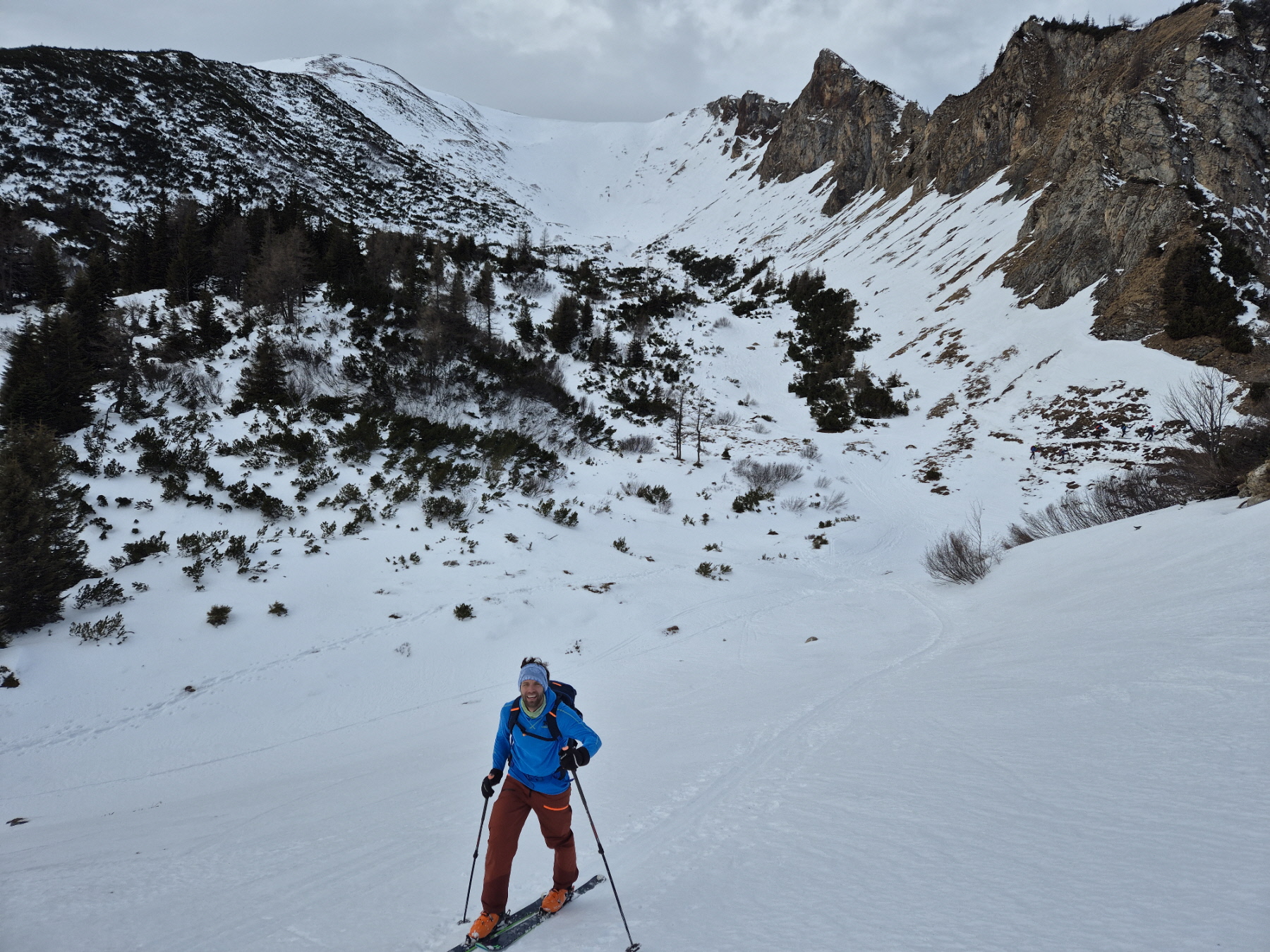 Nach der Gipfelrast sind wir bei wechselnden Schneebedingungen im Ostkar wieder abgefahren. Am Karboden ging es dann zurück hinaus bis zum Leobner Törl. Dort haben wir zum dritten Mal an diesem Tag die Felle wieder aufgezogen, sind ein kurzes Stück angestiegen und dann in etwa bis zu jenem Punkt hinüber gequert, wo wir 2 Stunden vorher unsere Zwischenabfahrt begonnen haben.