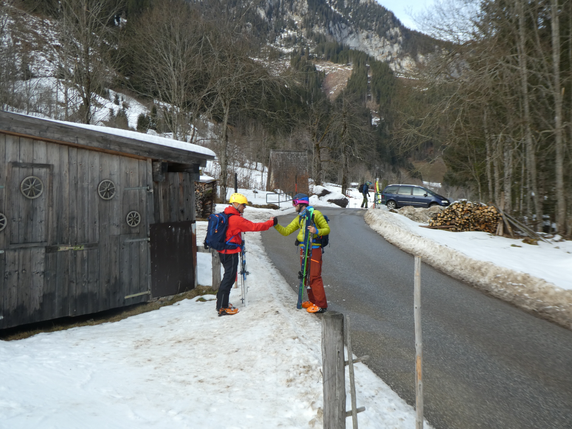Nach den letzten Schwüngen über die freie Fläche danach haben wir neben dem Parkplatz abgeschnallt. Mit trockener Wechselkleidung und der im Auto verstauten Ausrüstung sind wir zur Einkehr gefahren. Und abermals hat sich Heinrichs Erwartungshaltung von einem wahrlich tollen Schnitzeljahr erfüllt.