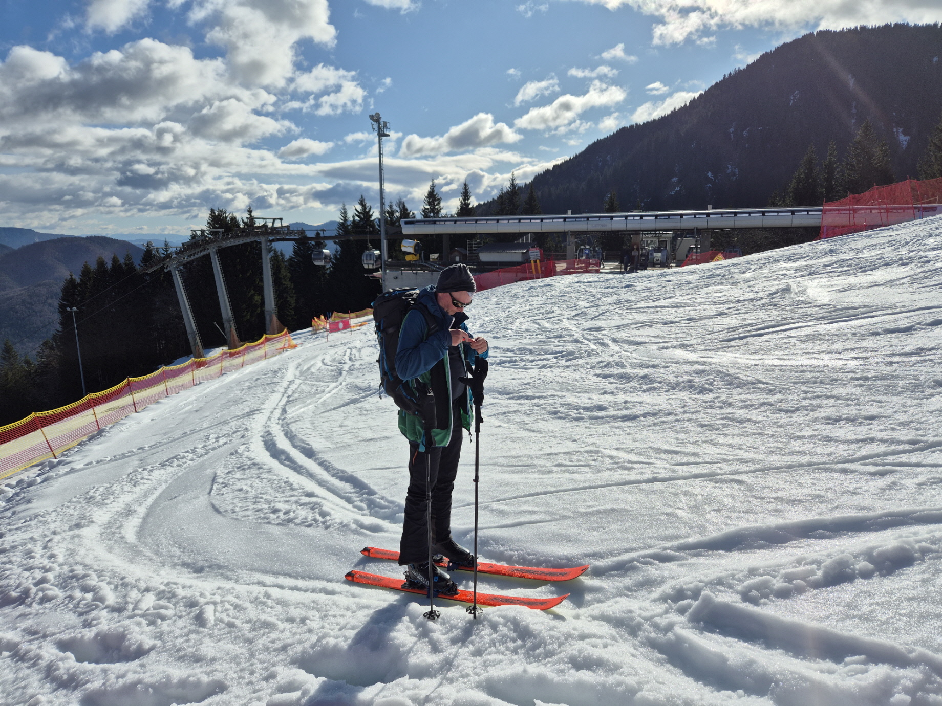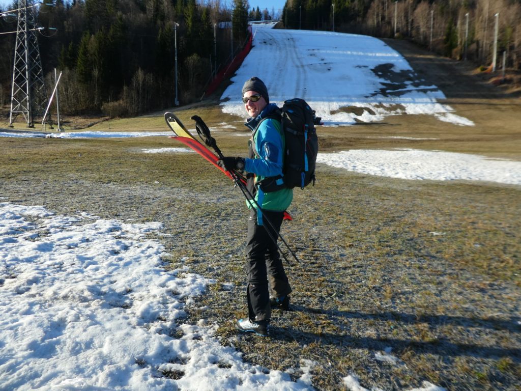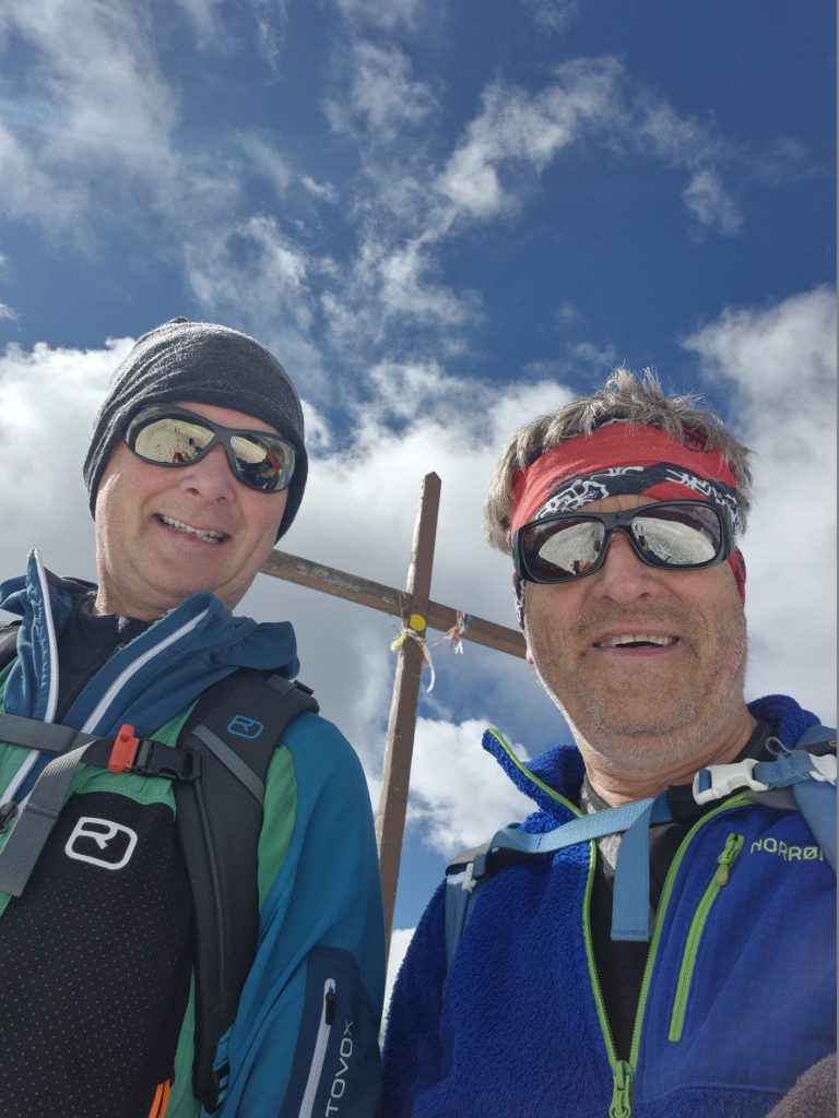 Stefan hat seit der letzten gemeinsamen Tour in eine komplett neue Ausrüstung investiert. Das hat sich schon im Anstieg bezahlt gemacht. Die neuen Felle haben – gepaart mit den Harscheisen -hervorragenden Halt gegeben, und die neuen Skibergschuhe haben keine Reibestellen an den Füßen erzeugt. Entsprechend frohgemut sind wir angestiegen und haben uns bei der Mittelstation eine Trinkpause gegönnt.