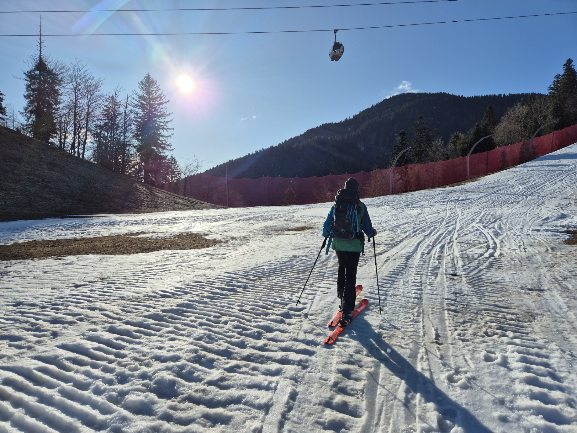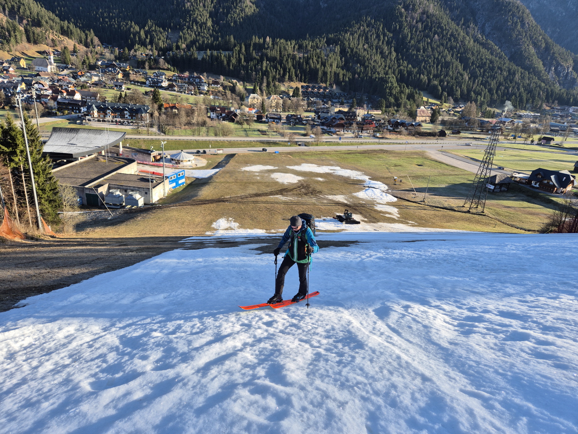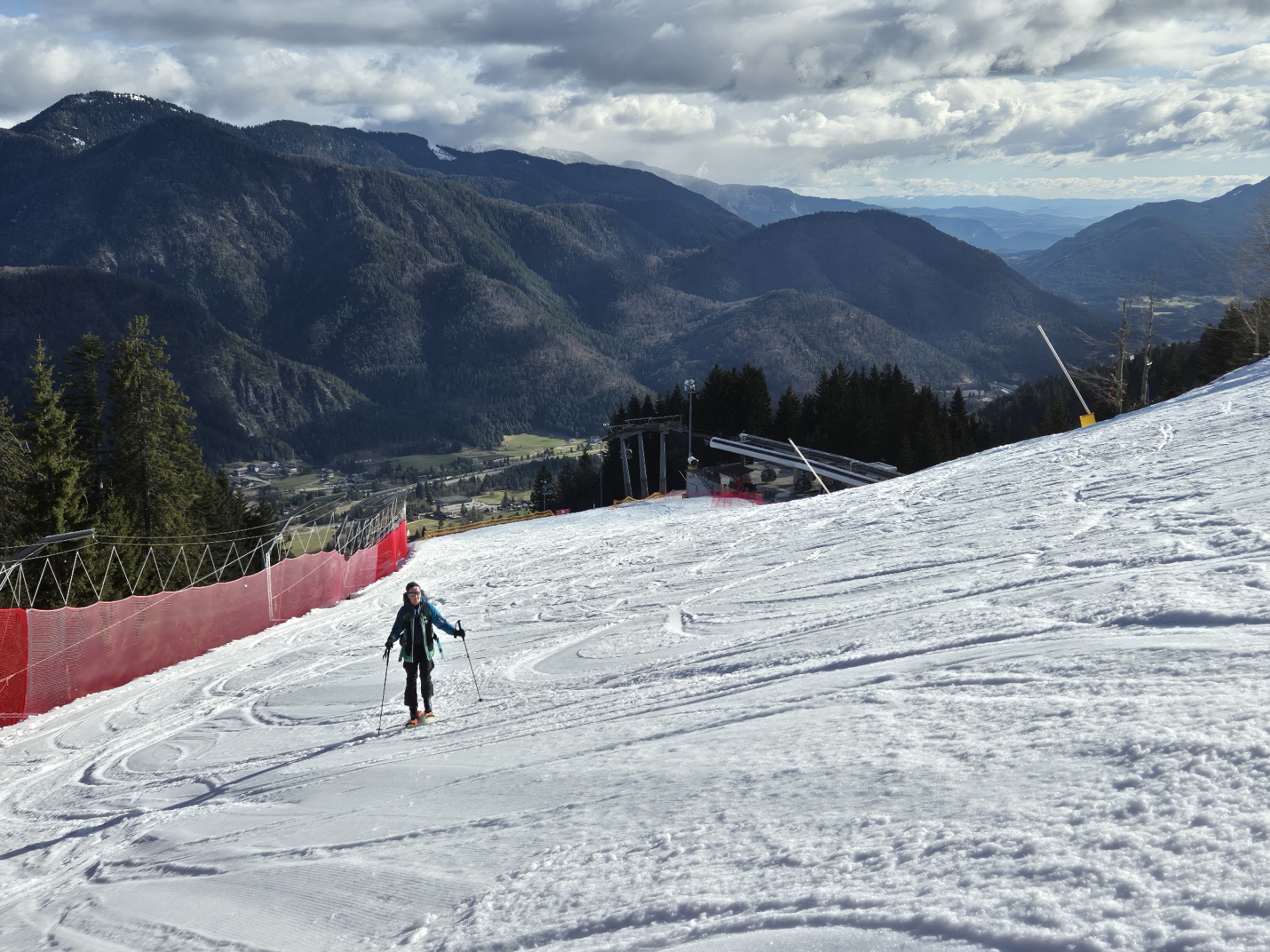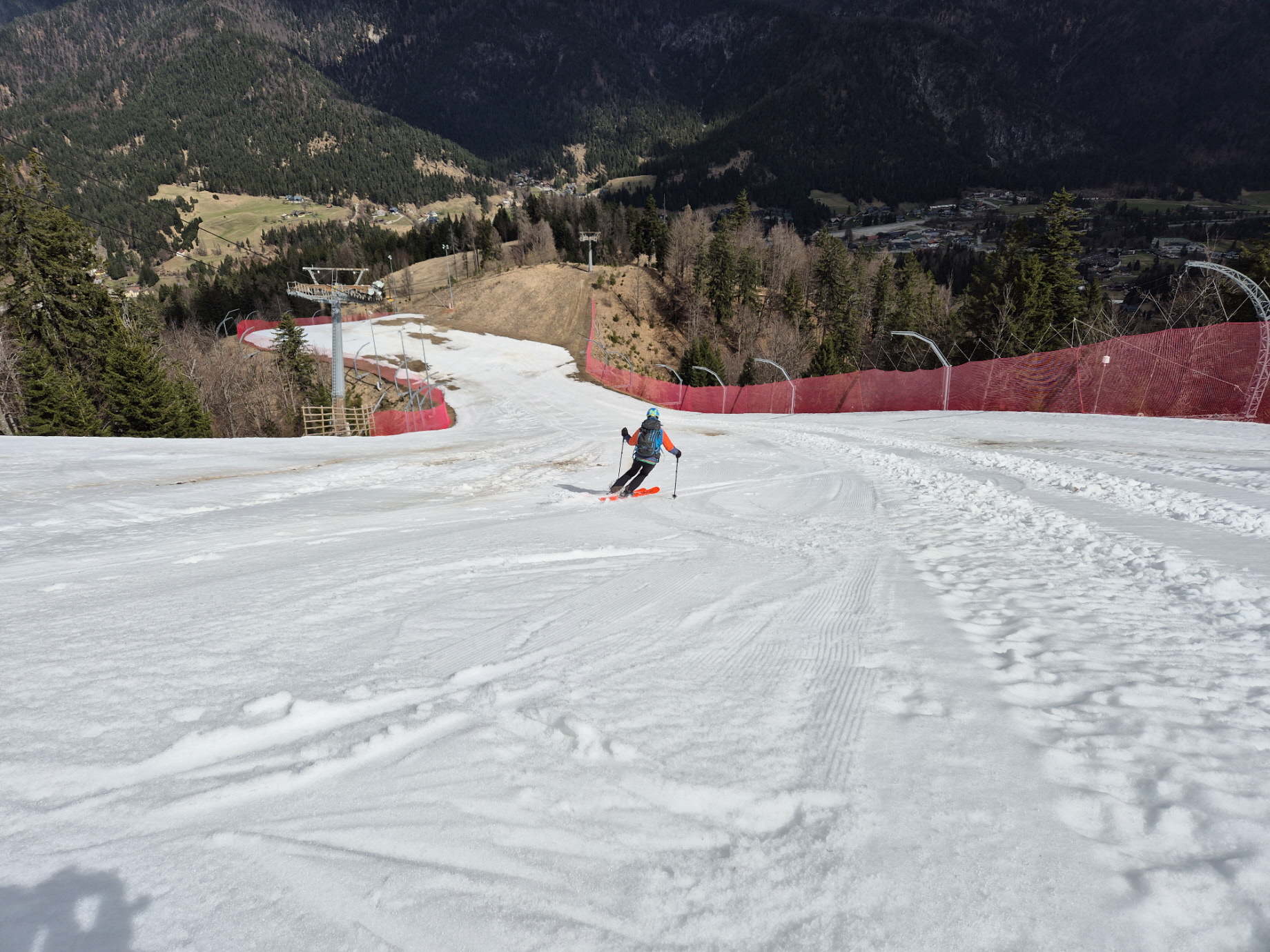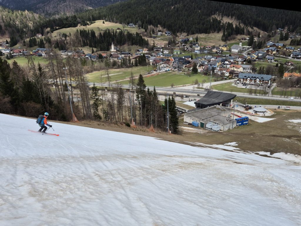 Vorbei an den geschlossenen Lokalen ging es dann weiter zur frisch präparierten Piste. Über diese sind wir dann sehr flott talwärts gebraust. Unterbrochen durch ein Gespräch mit einem aufsteigenden Landsmann sind wir bis in den Flachbereich oberhalb des Zielhangs auf einer durchgehenden Schneedecke abgefahren. Über dünne Schneebänder haben wir auch dort noch immer eine fahrbare Unterlage vorgefunden.