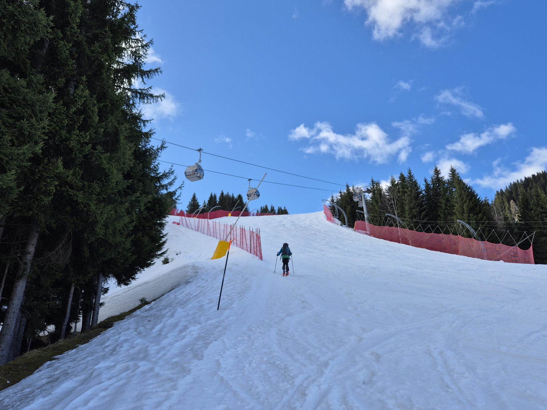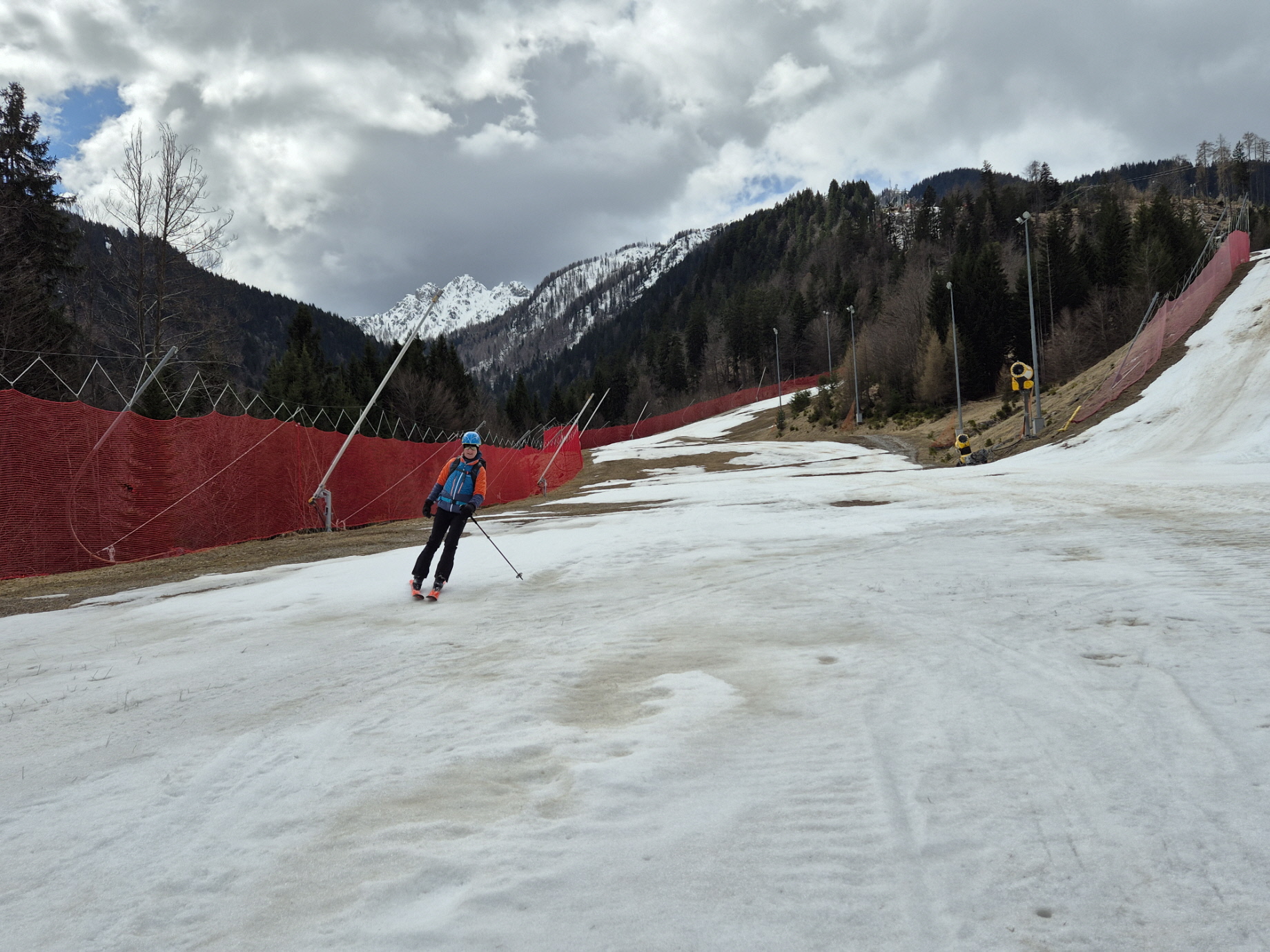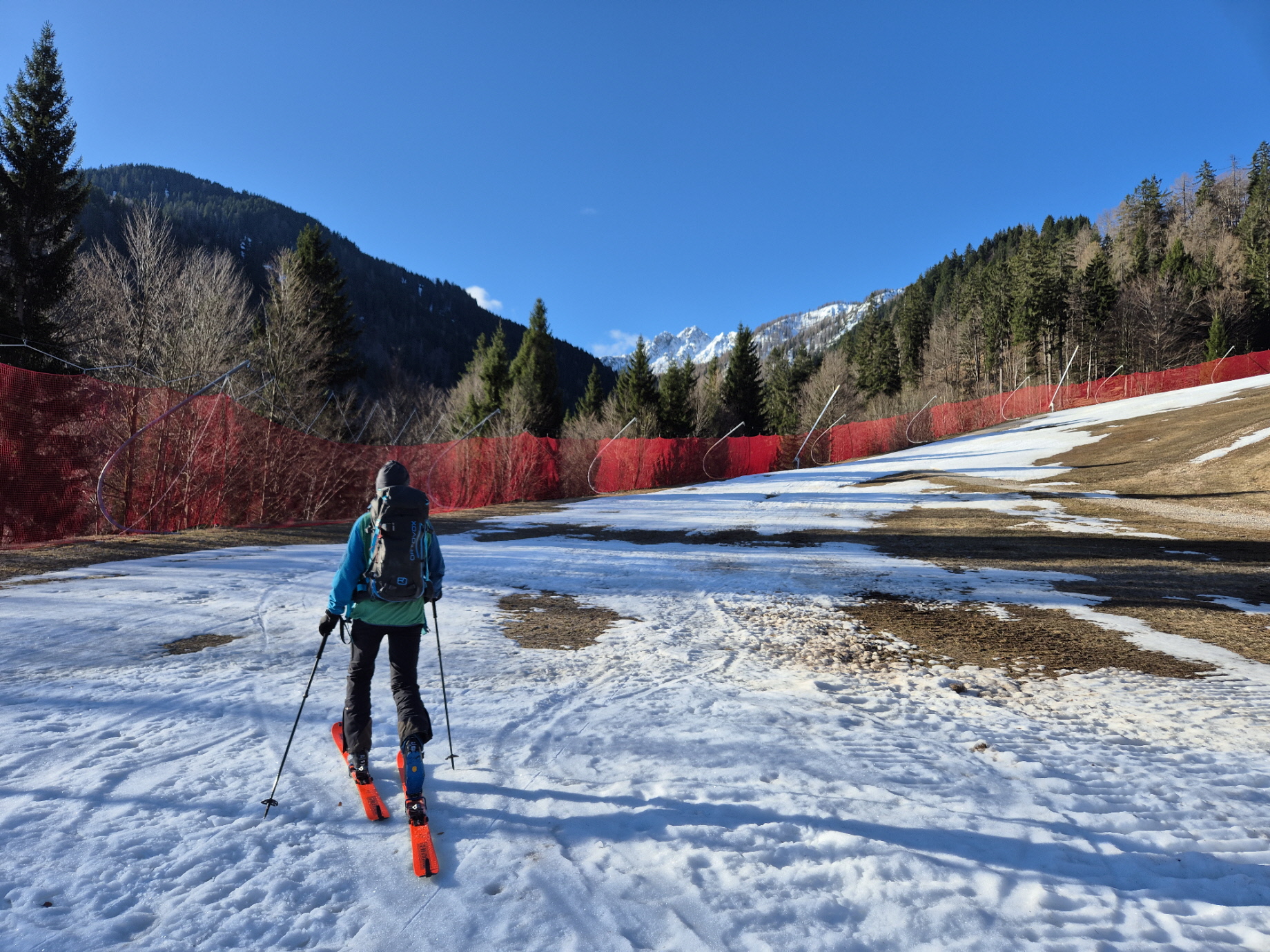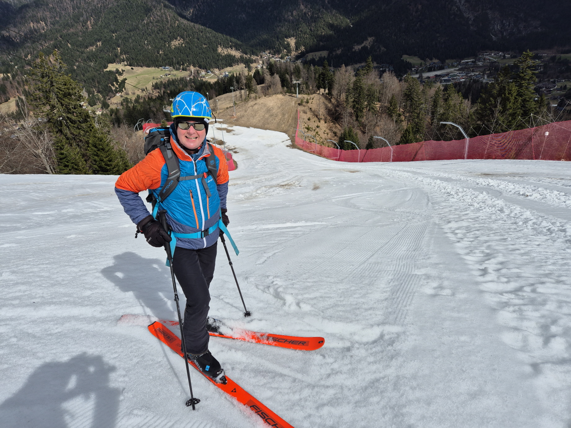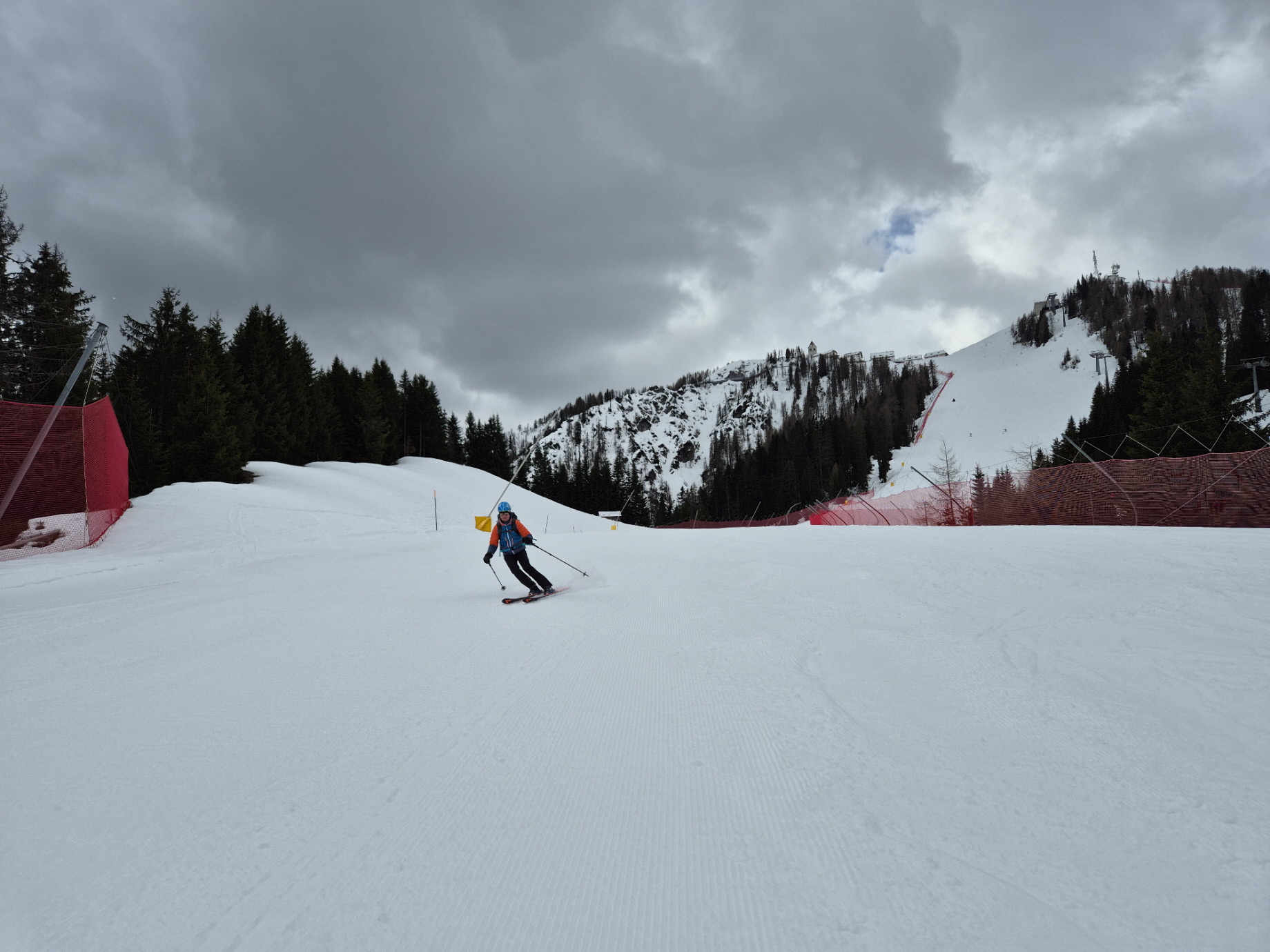 Vorbei an den geschlossenen Lokalen ging es dann weiter zur frisch präparierten Piste. Über diese sind wir dann sehr flott talwärts gebraust. Unterbrochen durch ein Gespräch mit einem aufsteigenden Landsmann sind wir bis in den Flachbereich oberhalb des Zielhangs auf einer durchgehenden Schneedecke abgefahren. Über dünne Schneebänder haben wir auch dort noch immer eine fahrbare Unterlage vorgefunden.