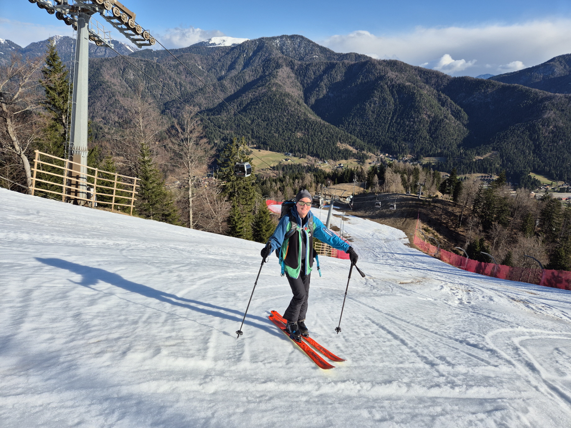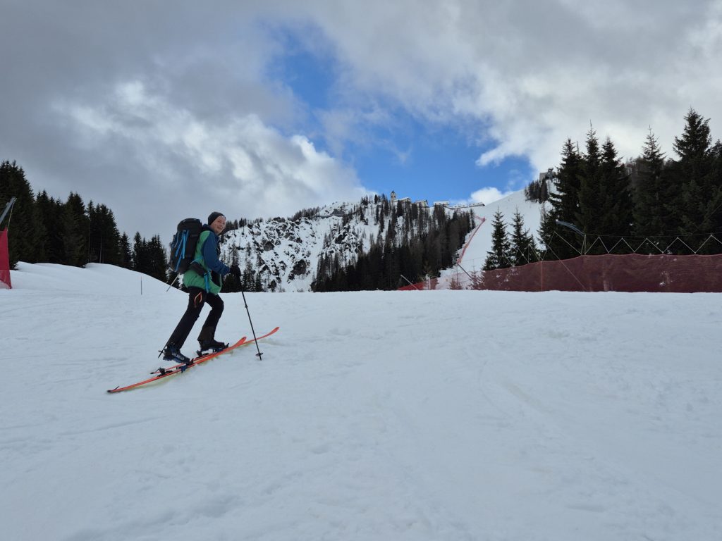 Ein hartnäckiger Atemwegsinfekt und ein Pistenskilaufwochenende mit Brigitte und Freunden haben eine längere Tourenpause bewirkt. Der Pistenskilauf am Monte Lussari vor einer Woche hat mich aber von den dortigen guten Verhältnissen überzeugt. Diese galt es gleich am Tag nach Saisonschluss zu nutzen. Tourenpartner war wieder unser Pfarrer Stefan, der – dem Suppensonntag sei Dank – beim Tischgespräch nach der Messe schnell zur gemeinsamen Skitour an seinem freien Montag überredet werden konnte. Während das Begehen der Pisten in Italien sonst bei Strafe verboten ist, konnten wir heute von der Talstation weg auf Skiern ansteigen. Wegen der vereisten Unterlage haben wir von Beginn an die Harscheisen montiert.