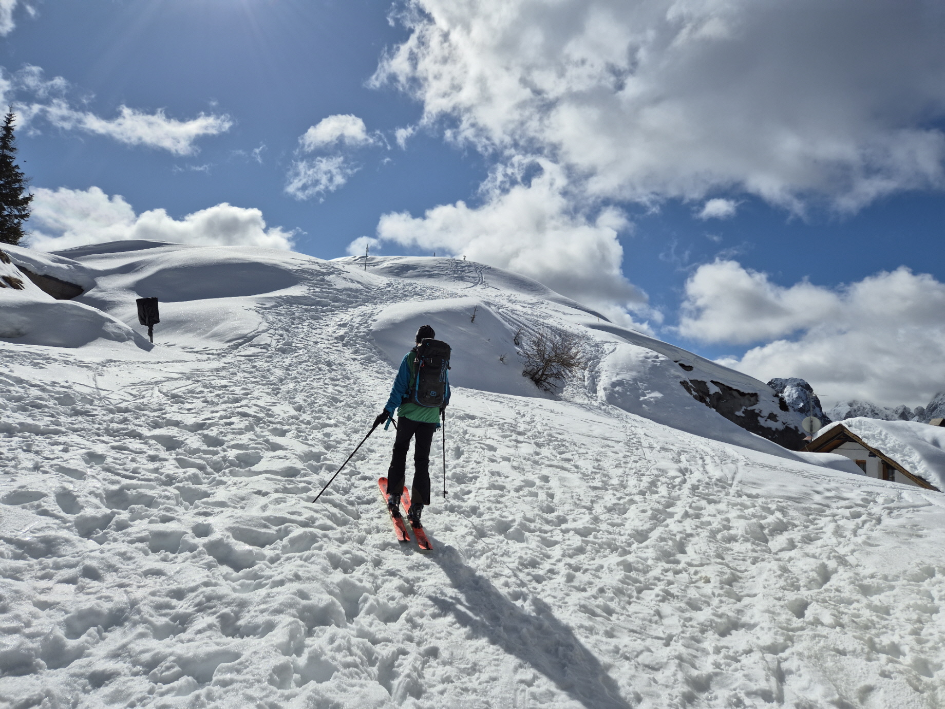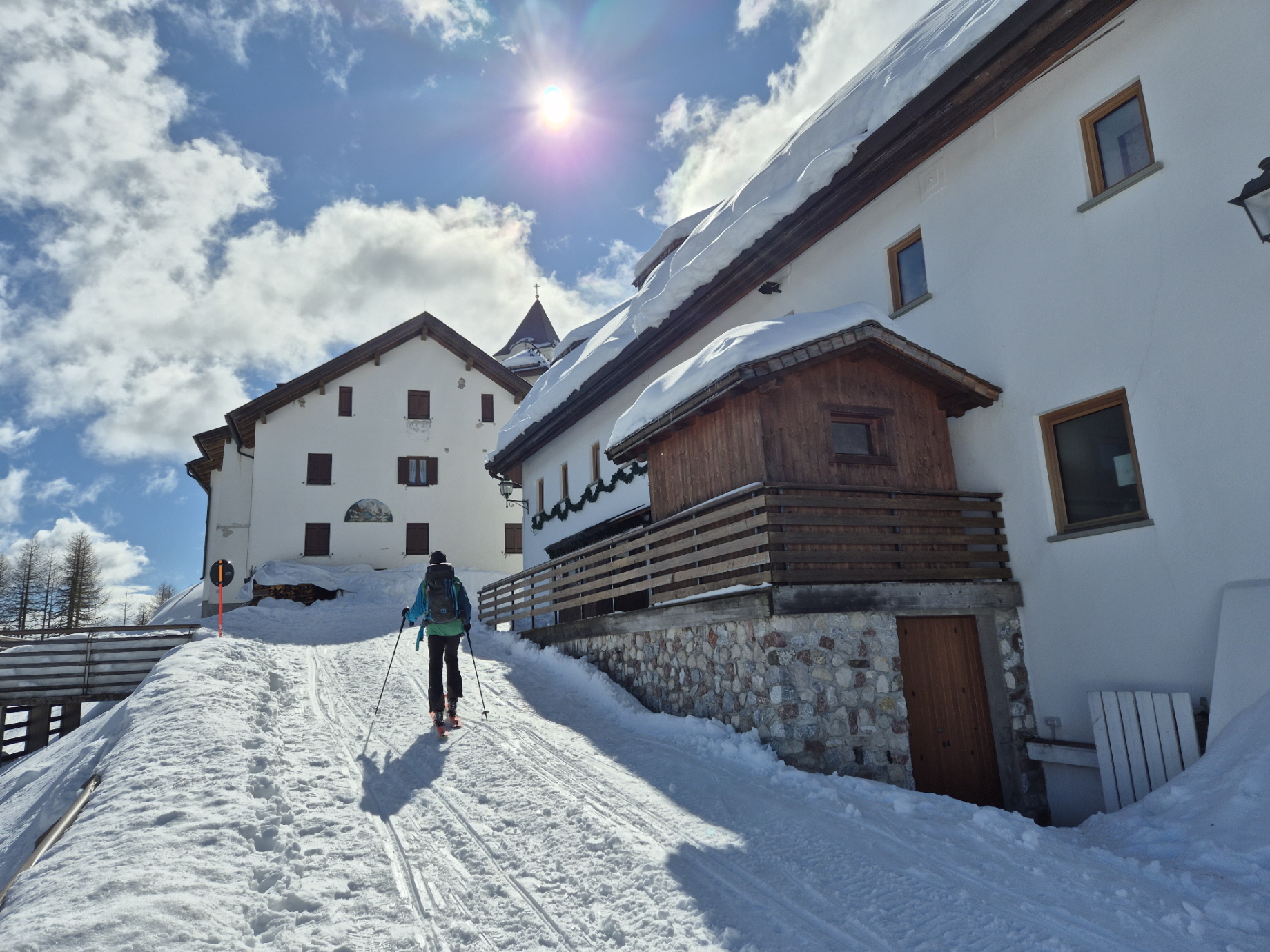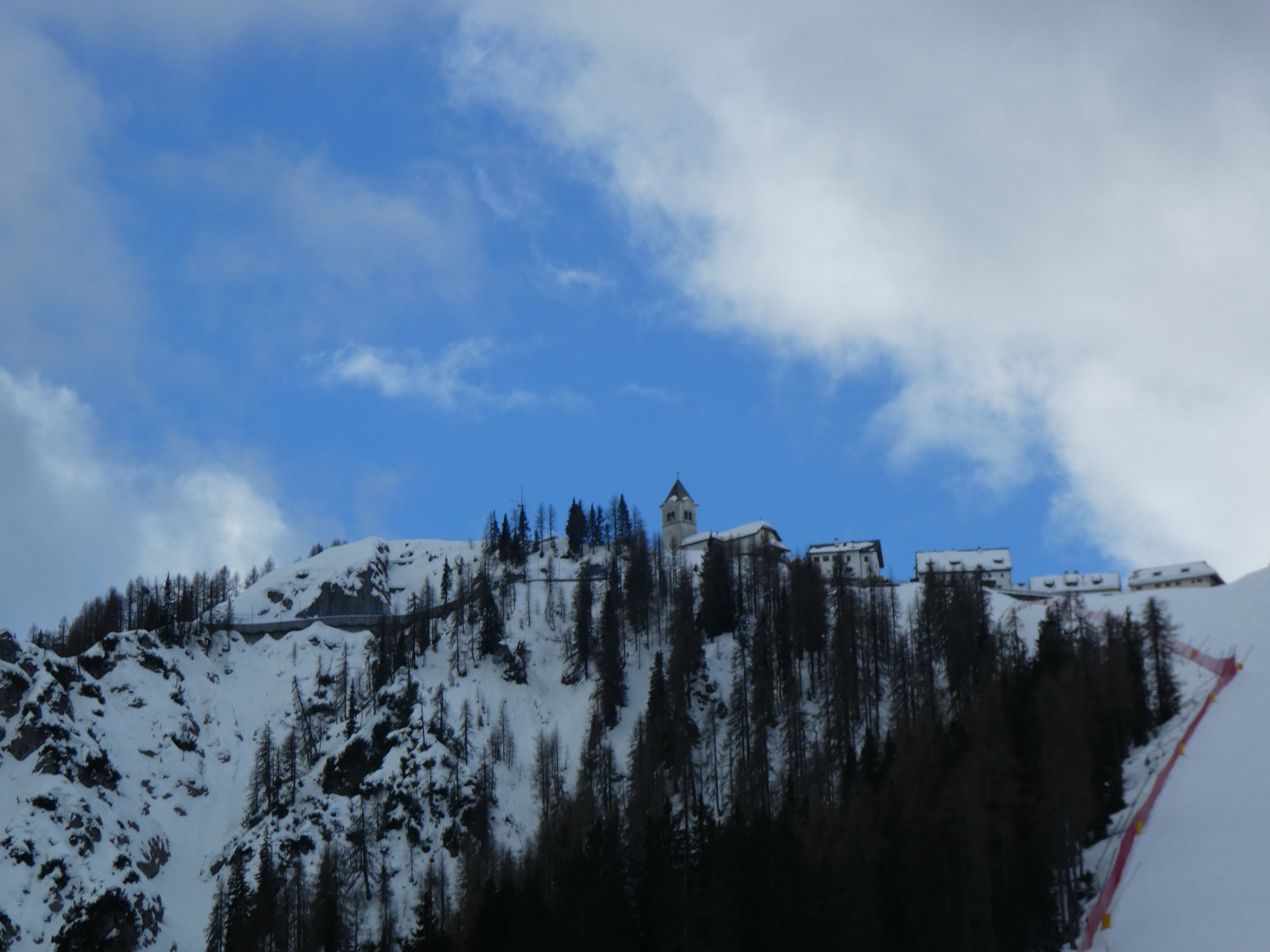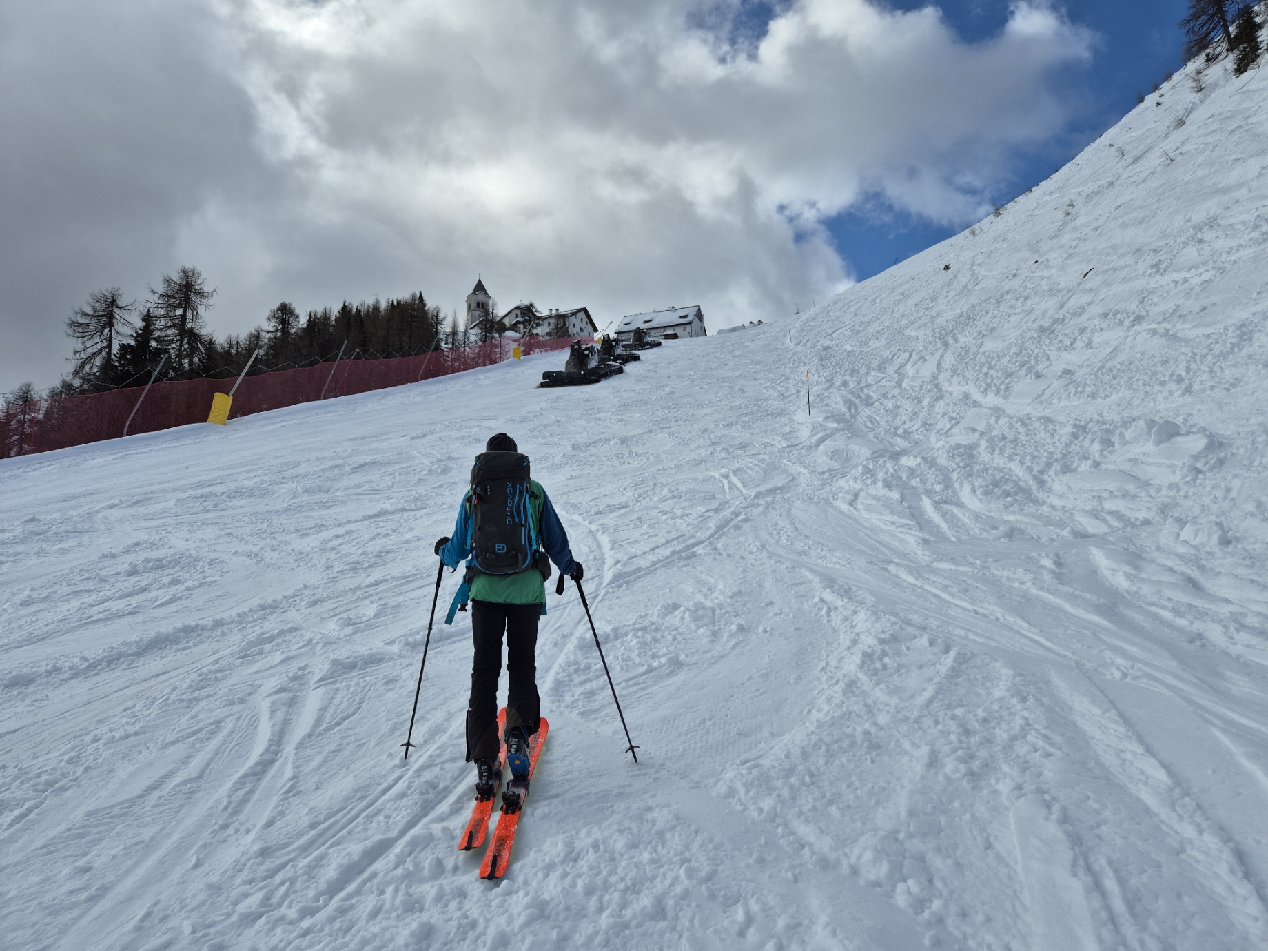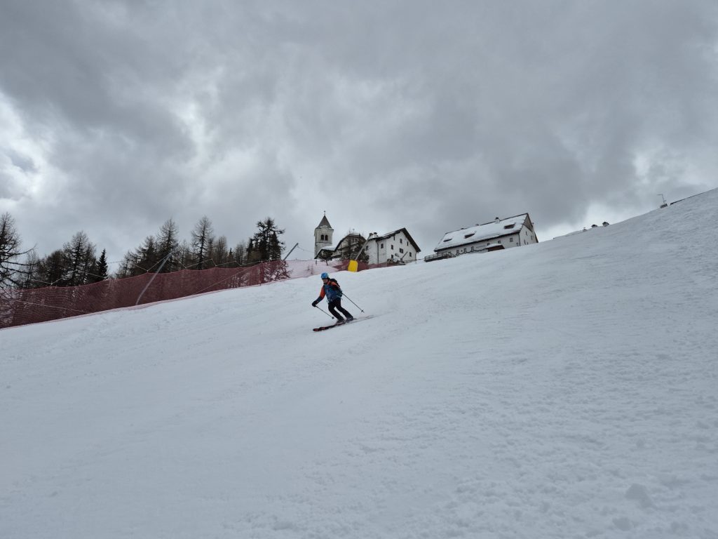 Den ursprünglich vorgehabten Plan. weiter zur Cima del Cacciatore aufzusteigen, hatten wir schon gleich nach dem Erreichen des Bergdorfs verworfen. Schnell aufziehende Bewölkung aus dem Süden und ein kurzer Graupelschauer während des Umrüstens für die Abfahrt haben uns in diesem Entschluss bestärkt. Bis zur Kirchentür sind wir abgefahren und haben dort abgeschnallt.